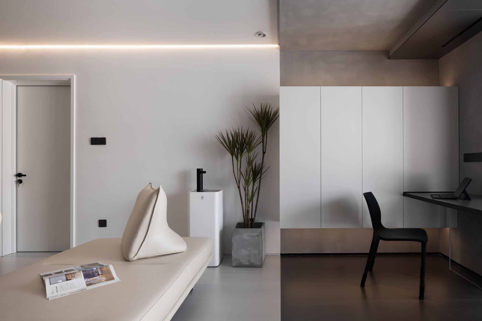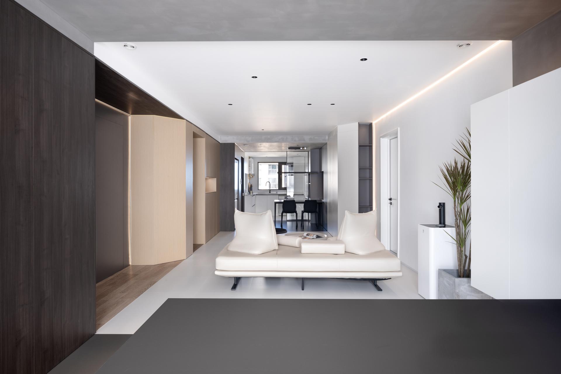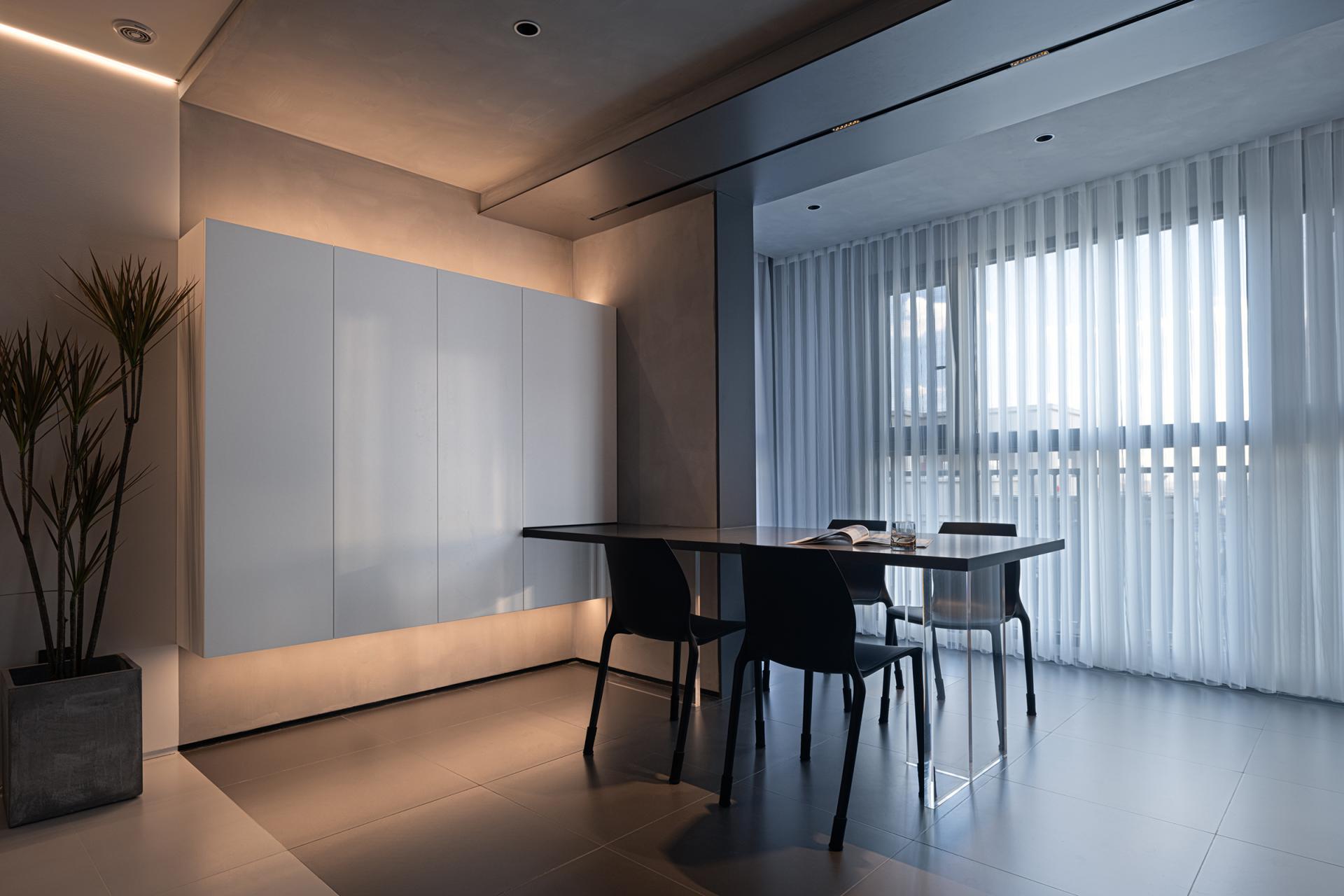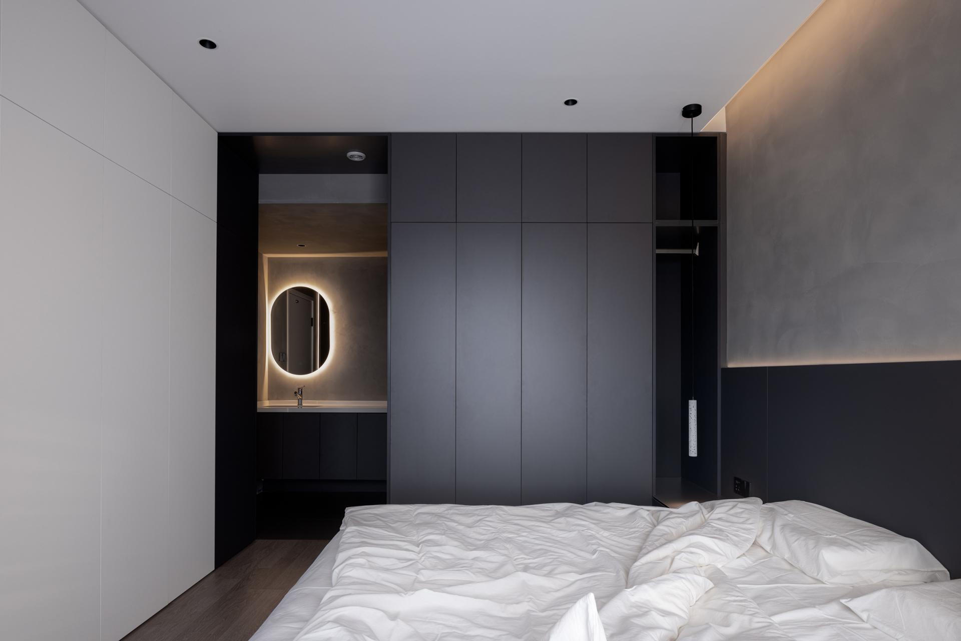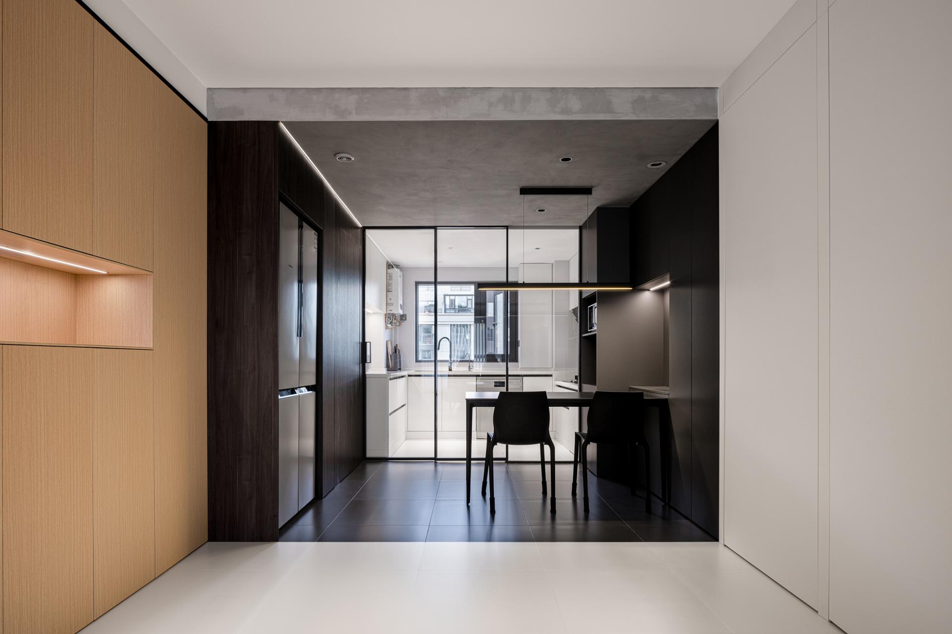 In the household renovation, original checkroom was removed to connect the living and dining spaces. Moving the living room toward the dining room and expanded the balcony space. The balcony has a particularly great view, and a large tabletop was placed on the balcony for drinking tea, reading, working, and playing cats. A whole wardrobe was added at the end of bed in the master bedroom. After calculation, the amount of clothing storage after renovation is much larger than the original checkroom. The checkroom was eliminated, while the master bedroom and guest bedroom were separated. By reducing the size of master bathroom and moving the vanity outward, it was designed as a triple-separation bathroom. Such renovation expanded the size of vanity countertop and shower space. The invisible door was designed on the external wall of the second bedroom, and when closed, the second bathroom and the second bedroom form an ensuite. The outside corner of original dining area is just right for the refrigerator, the dining room with dark color living room with light color, taking the refrigerator and outside corner to form a recess just right for the refrigerator, which makes the dining room form a complete box. The outside corner of living room is adjusted and weakened by the concept of cabinets and light and dark boxes to form a special back wall.