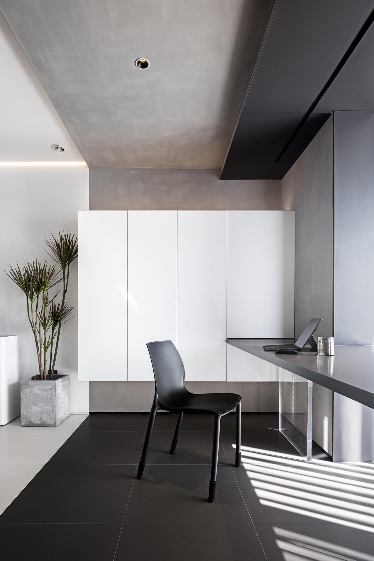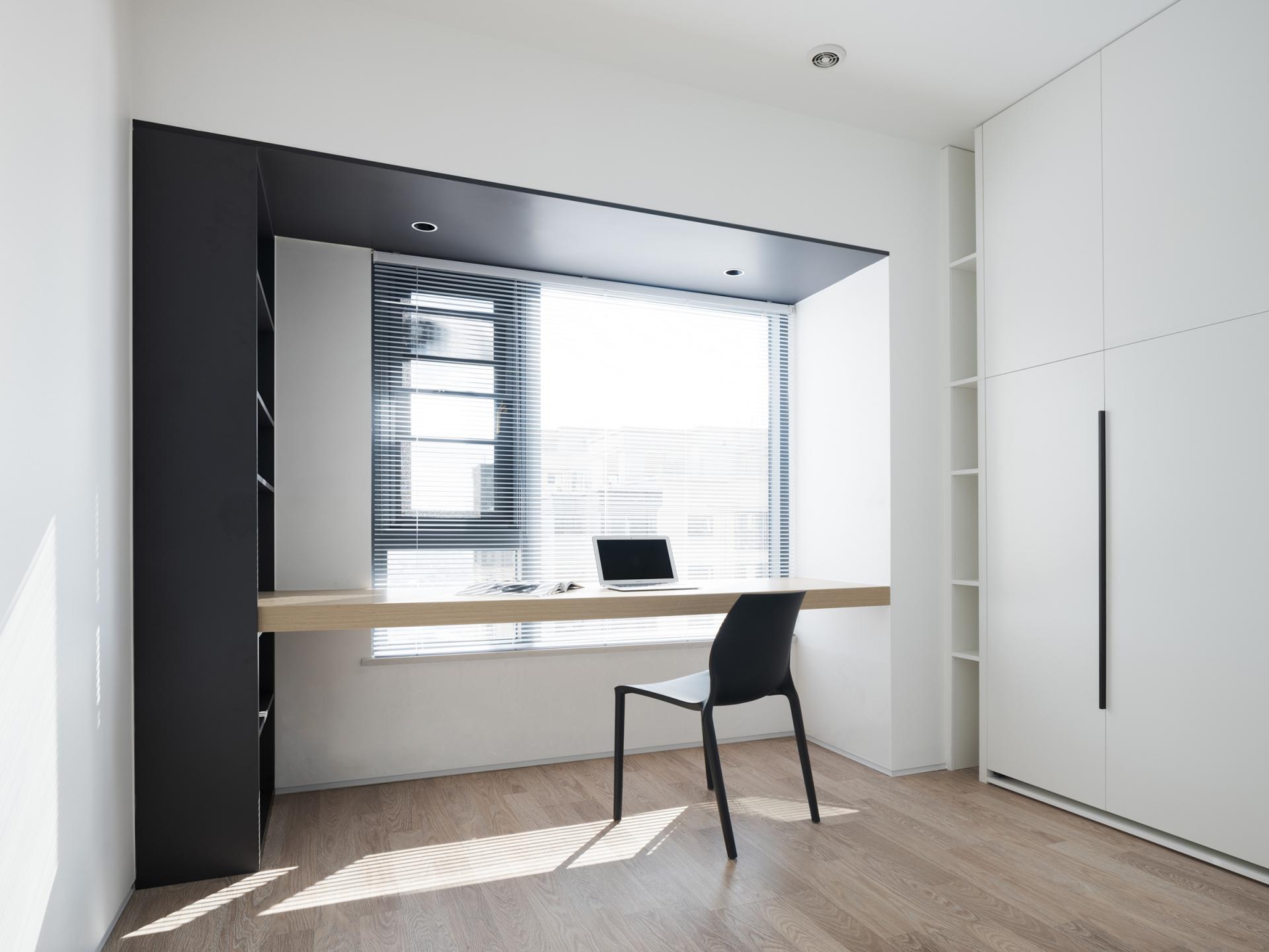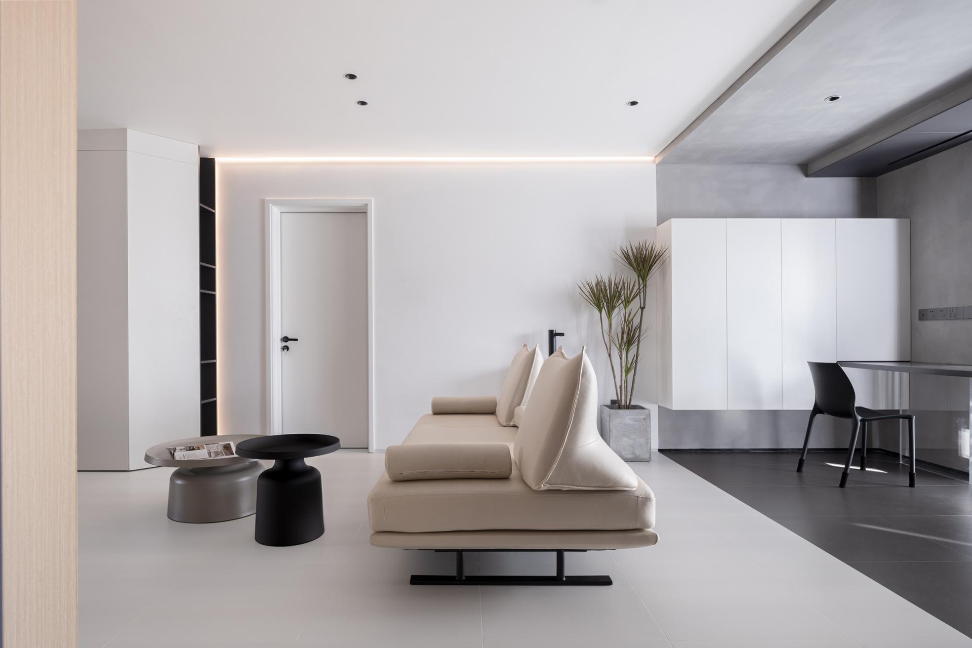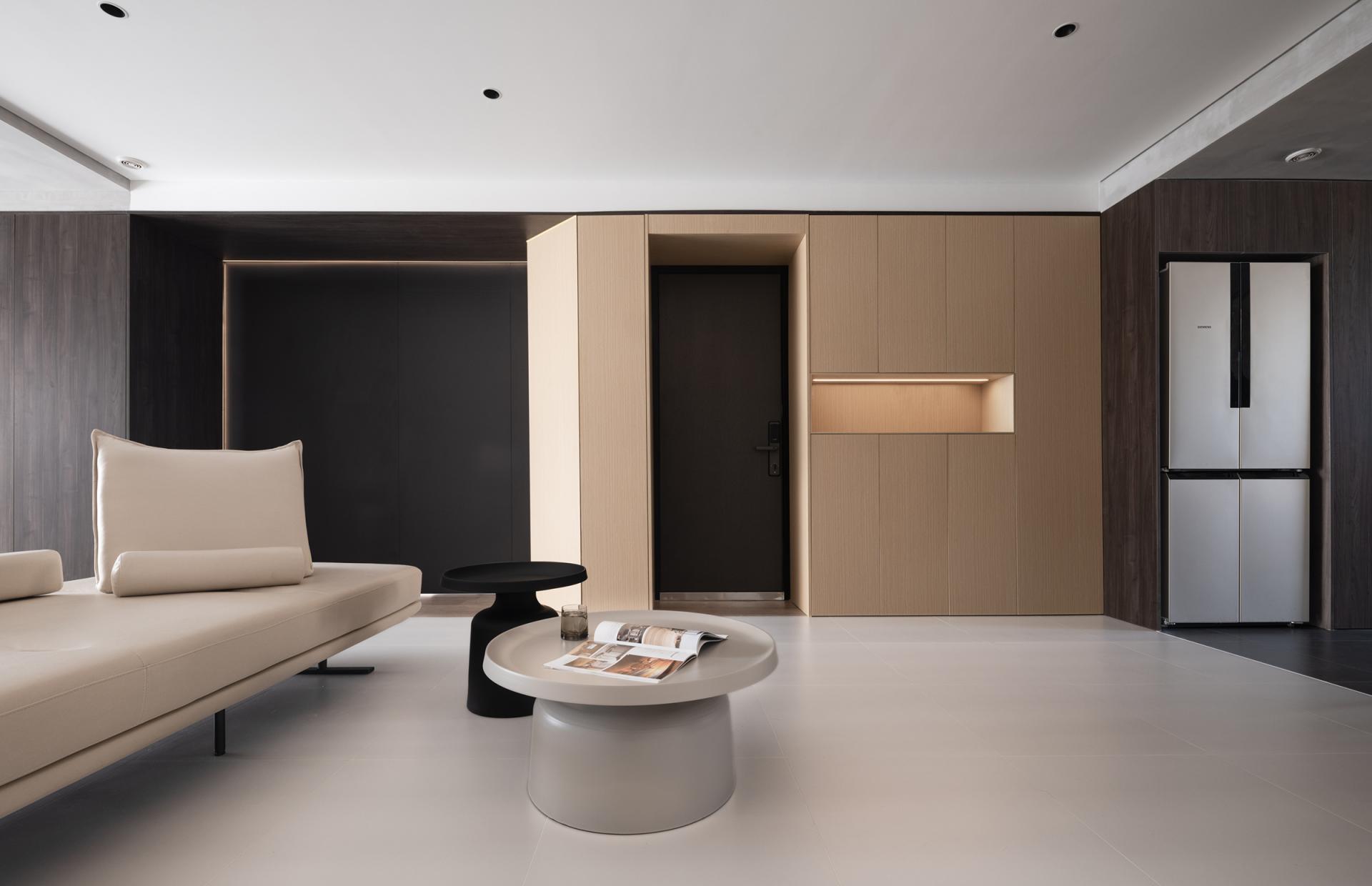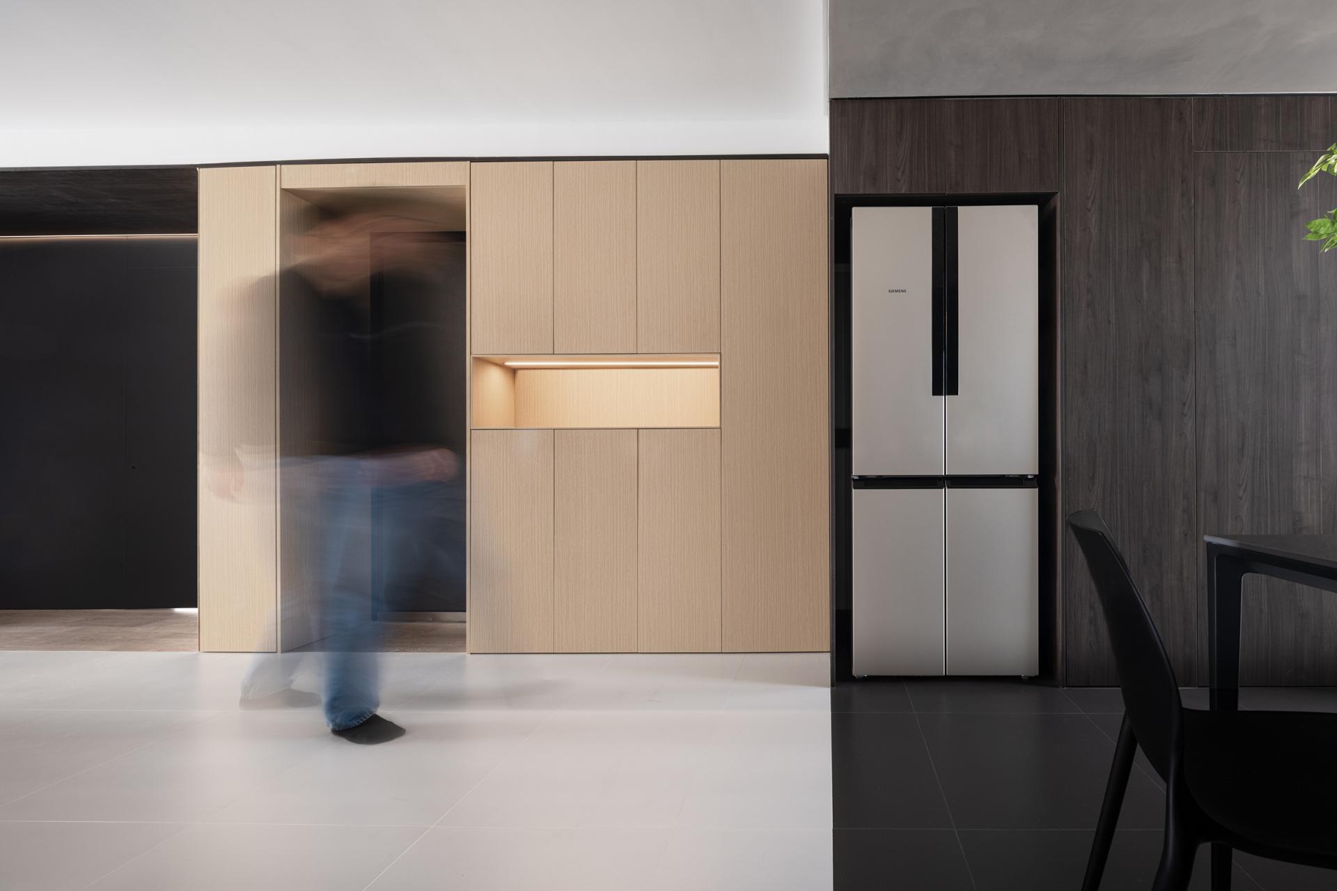 In the household renovation, original checkroom was removed to connect the living and dining spaces. Moving the living room toward the dining room and expanded the balcony space. The balcony has a particularly great view, and a large tabletop was placed on the balcony for drinking tea, reading, working, and playing cats. A whole wardrobe was added at the end of bed in the master bedroom. After calculation, the amount of clothing storage after renovation is much larger than the original checkroom. The checkroom was eliminated, while the master bedroom and guest bedroom were separated. By reducing the size of master bathroom and moving the vanity outward, it was designed as a triple-separation bathroom. Such renovation expanded the size of vanity countertop and shower space. The invisible door was designed on the external wall of the second bedroom, and when closed, the second bathroom and the second bedroom form an ensuite. The outside corner of original dining area is just right for the refrigerator, the dining room with dark color living room with light color, taking the refrigerator and outside corner to form a recess just right for the refrigerator, which makes the dining room form a complete box. The outside corner of living room is adjusted and weakened by the concept of cabinets and light and dark boxes to form a special back wall.