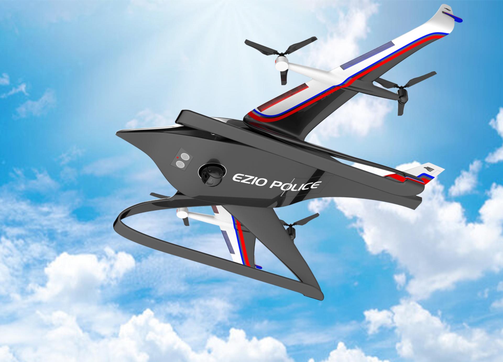 Ezio is a new generation of police drones with long-endurance, fast response, and a wide range of capabilities to help officers do their job more effectively and safely. The Ezio combines bionic design with the vertical take-off and landing airframe, taking inspiration from the fierce beak of the eagle and its one-piece streamlined body, resulting in better endurance and load capacity than traditional quadcopters. Ezio can be used for first response, first aid, aerial policing, and air tracking.