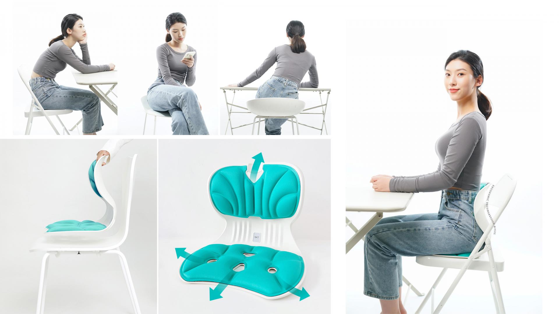 BKT Posture Supporting Chair is an ergonomic chair designed for "sedentary people". Inspired by the principles of human motion, it aims to better adjust the sitting posture during work, life and study. The product can carry weight evenly from the three key parts: back, waist and buttock, fitting the curve of the human body to stabilize the pelvis. Users will feel the relief of the waist, correct bad sitting posture, and start a healthy new life. This product is compact and lightweight, and easy to carry while ensuring the quality of use. Users can use it anytime and anywhere, and place it in the desired location according to their needs. Whether it is on the floor, the sofa, the chair, the bed, etc., this chair can be perfectly placed. The process is simple and convenient, helping users to enjoy the ultimate convenience. Generally speaking, it is difficult to maintain a correct sitting posture, and users are very likely to stay in incorrect postures such as bending over, hunched back, and tilting their legs when sitting, which may affect posture and body, and may even cause many health problems. BKT Posture Supporting Chair adopts the concept of protecting the vertebra. Combined with ergonomic design, it perfectly adapts to the body structure of sitting posture. "Long sitting without tire, protect your waist and back". Users will correct bad sitting habits and protect the health of the lumbar vertebra. With the patent of air circulation and heat dissipation, there are multiple cooling ventilation holes on the product to facilitate the air circulation between the body and the chair, effectively assisting heat dissipation. Even if it is used in summer, users will not feel dull and uncomfortable, effectively preventing the body from excessive sweat and greatly improving use experience.
