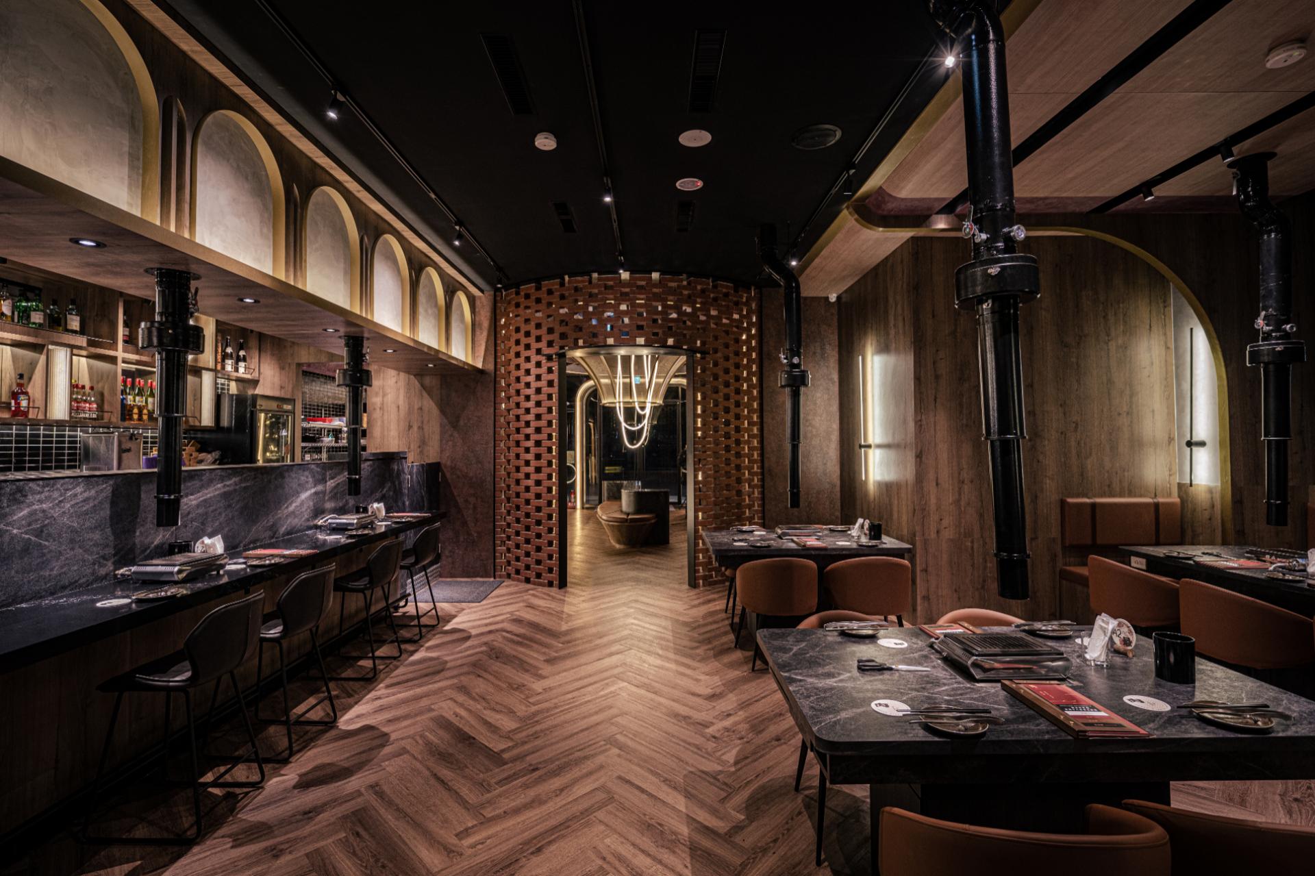 The whole building is two stories high; the first floor is divided into two areas: reception hall and dining area. The reception hall includes the reception counter, meat bar, and waiting area; the dining area includes the delivery bar and dining area. The second floor is the wine bar and dining area.