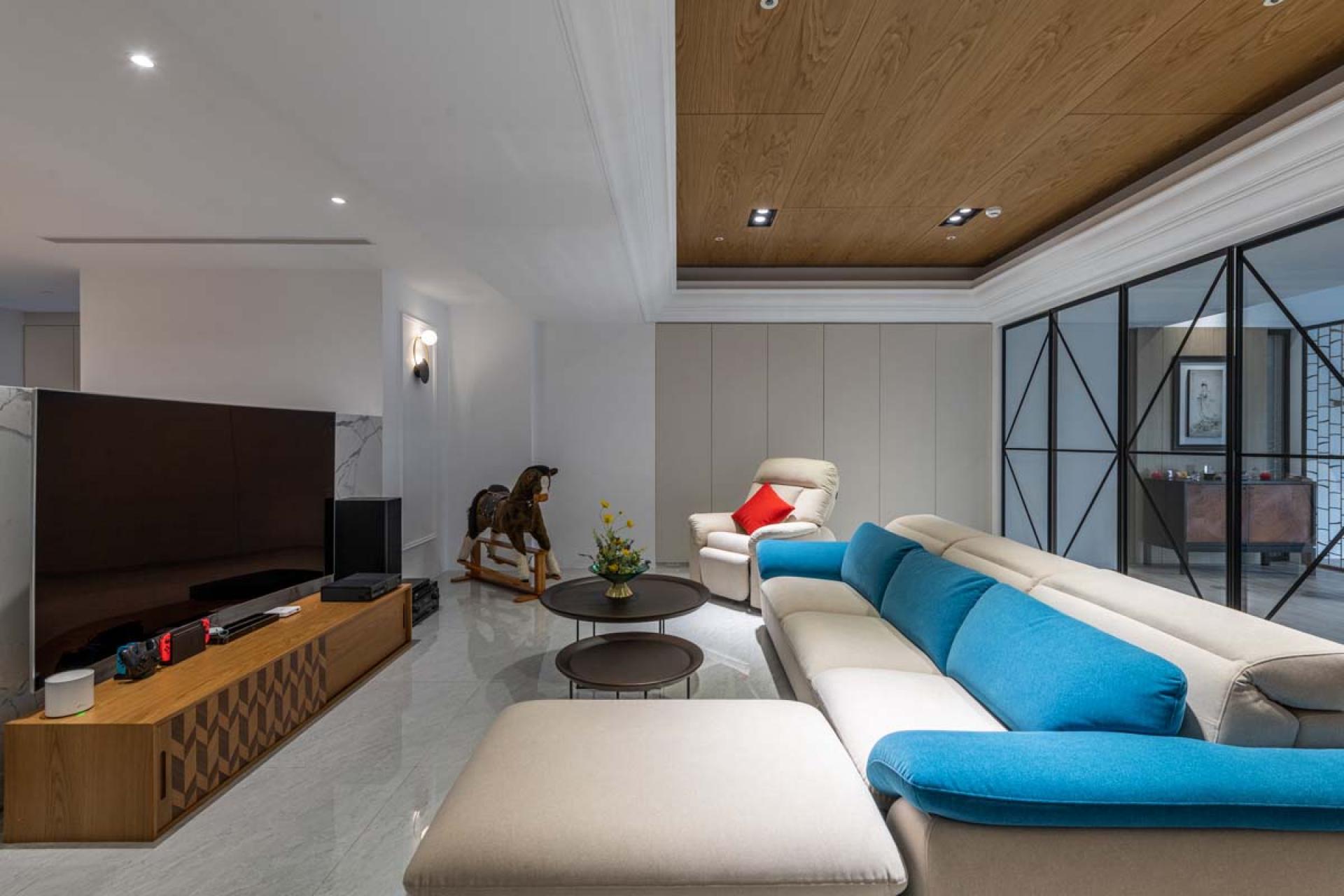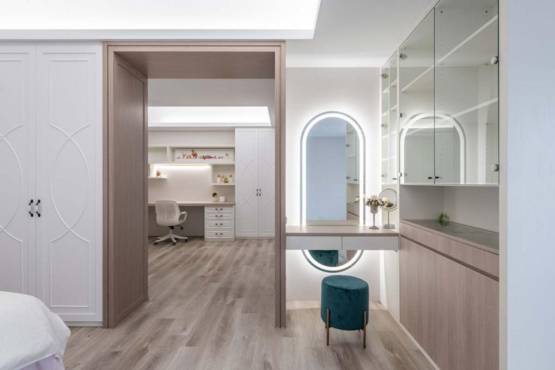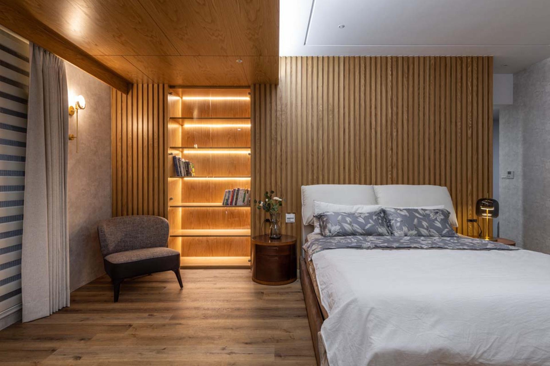 The height of the building in this project is relatively low, further complicated by large beams in the interior, making the space visually confined. The wall is decorated with indirect lighting and the doorway allows the area to emanate a sense of spaciousness. In addition, there were no partitions in the space at the beginning. The design team designed the layout according to the needs of the homeowners, ensuring the most satisfying layout and décor for the homeowners.