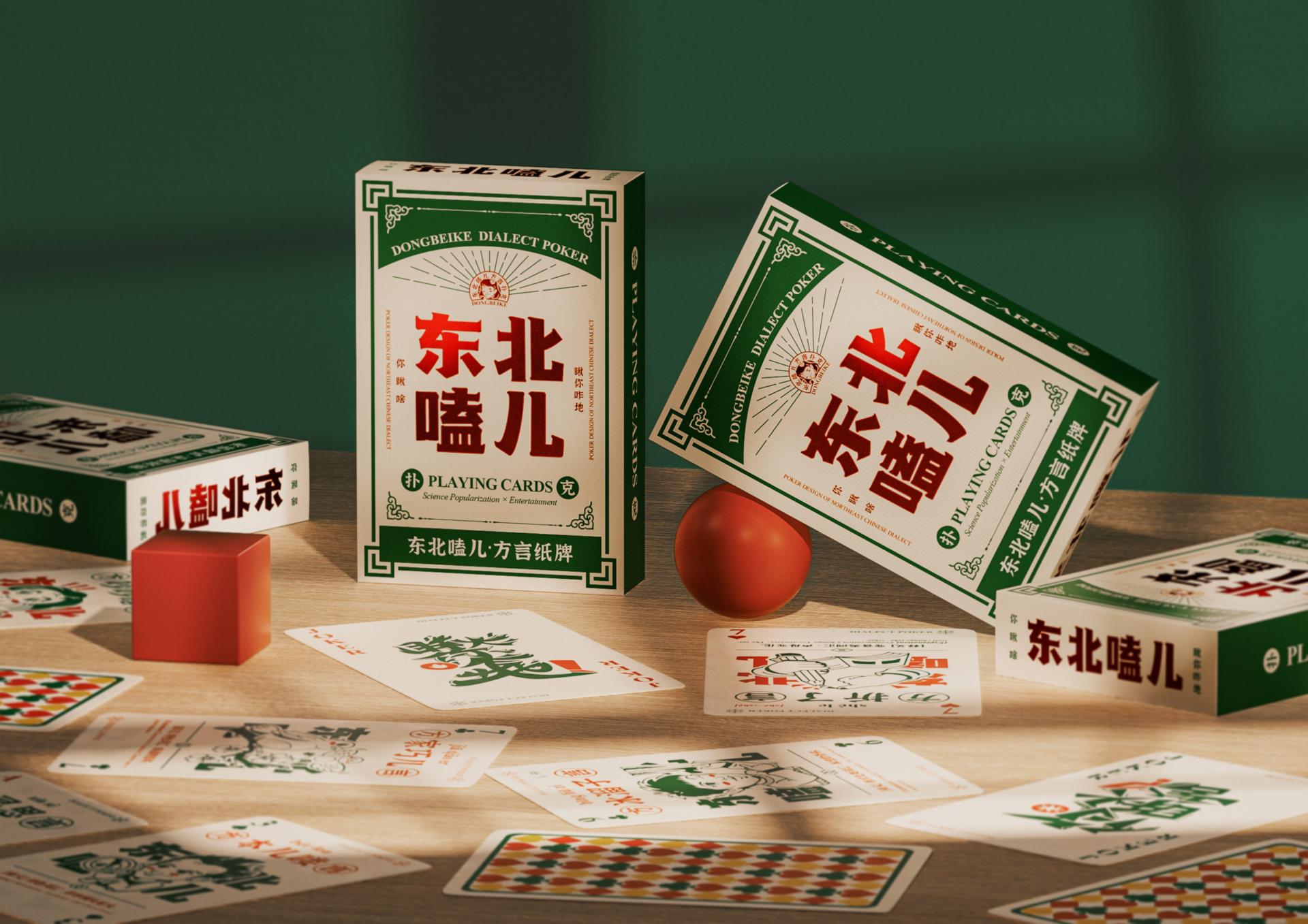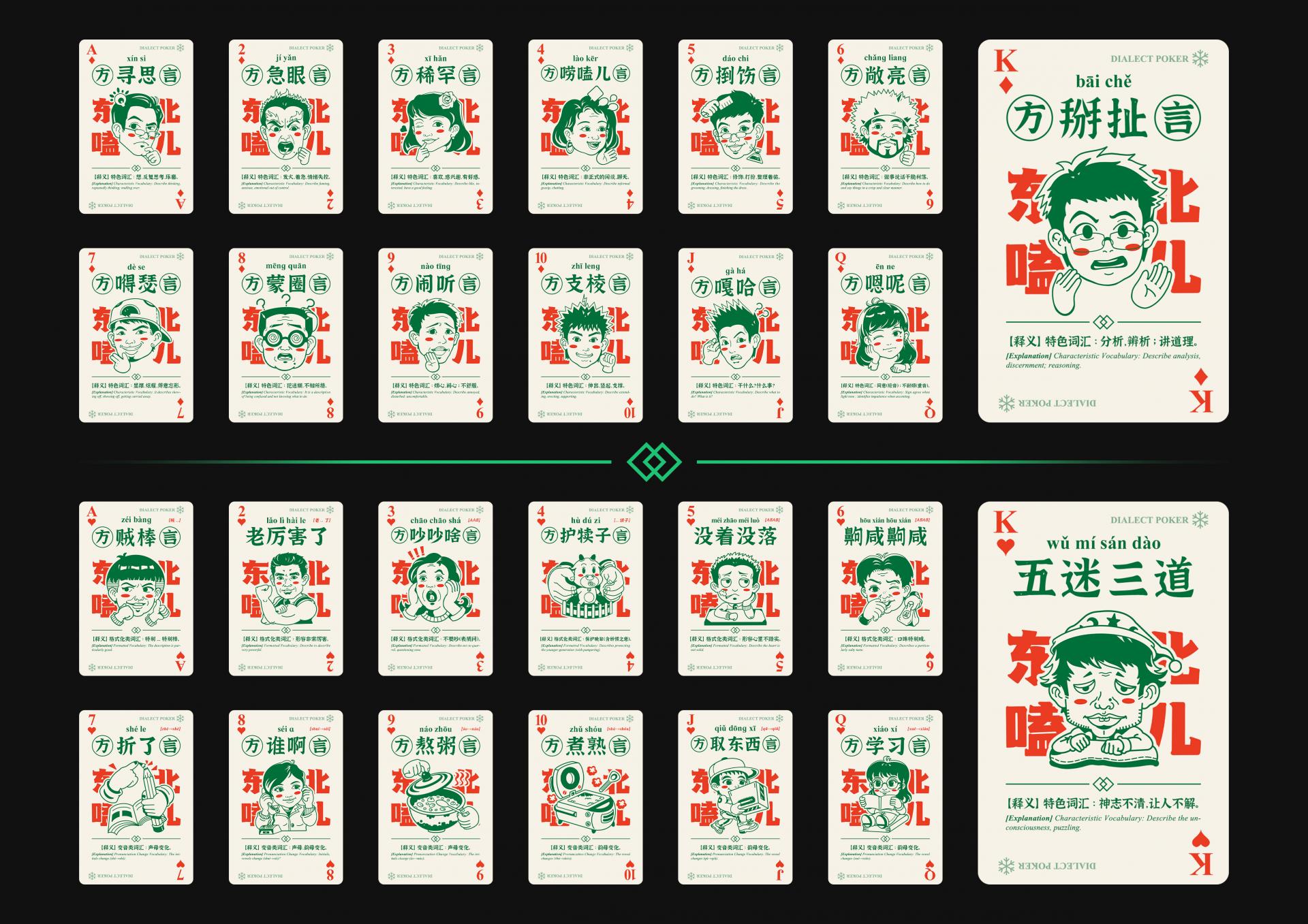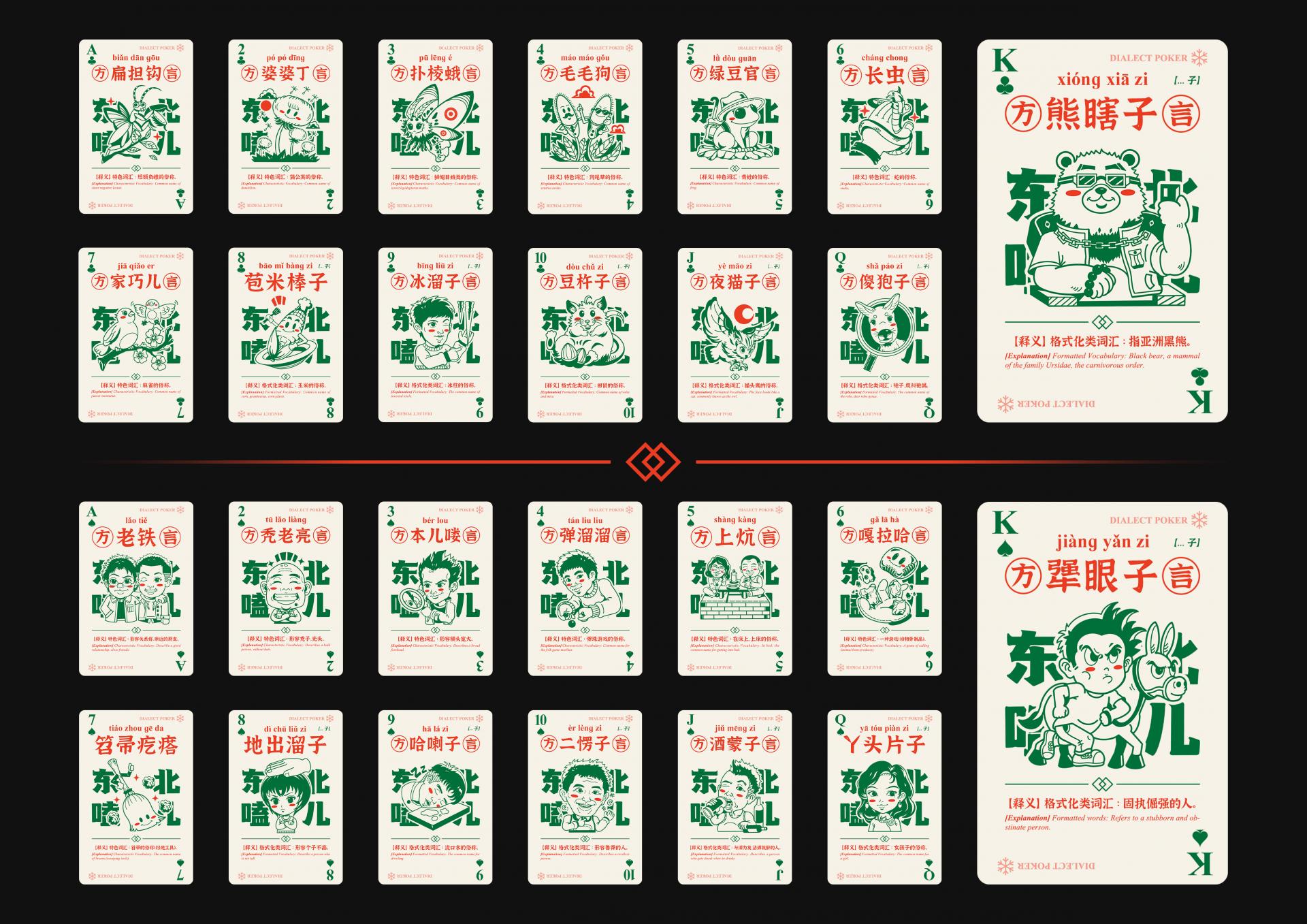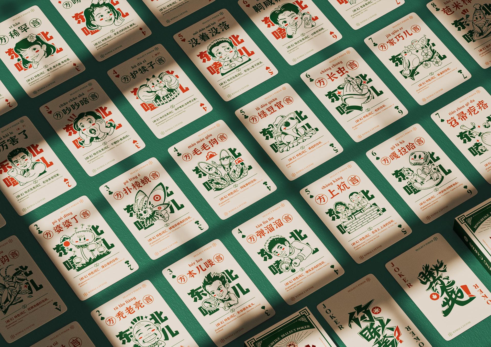 Language is an important carrier of culture and form of representation. The Northeast Chinese dialect, which is considered as a witty, humorous, straightforward and tough, has intense local characteristics and rustic atmosphere. The positive development of the Northeast Chinese dialect responds to the sustainable development of Northeast Chinese culture, and contributes to a good language ecosystem. This work is a collection of paper cards that resorts the symbol elements of Northeast Chinese dialect and makes it visualized. With the color scheme inspired by classic colors of “Da Hua Ao” (Northeast large flower cloth padded jacket) and in the form of solid class (typically green) and non-solid class (typically red), the cartoon-based paper cards show sound variant words, formatted words and featured words phonologically, grammatically and lexically. Cartoon images are artistic, popular and entertaining, more approachable and readily acceptable to young consumers. Texts and pictures help user learn the dialect and implied meanings in the game play. The design aim of this work, learning through play, is attained by an affordable and popular form of communication.