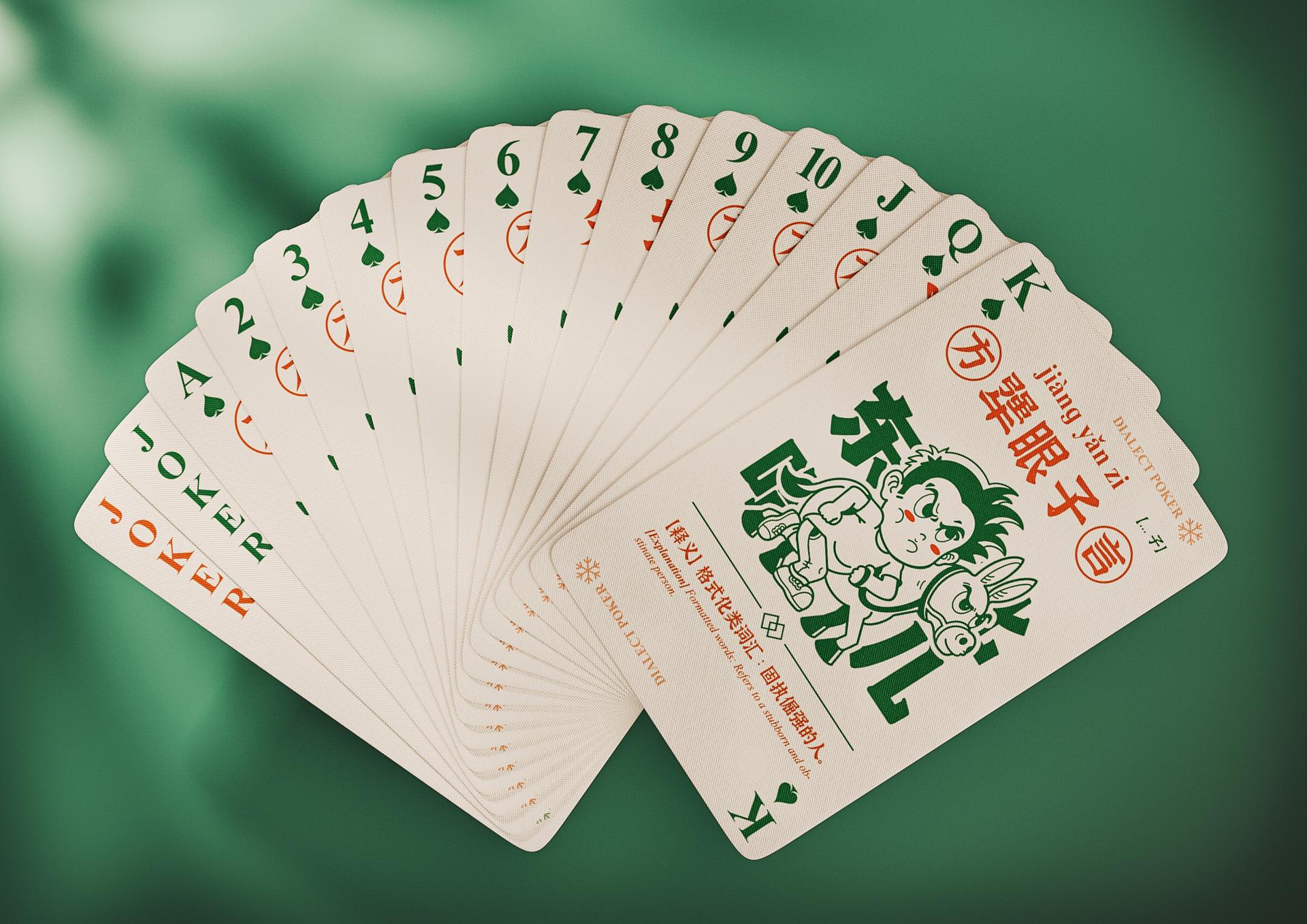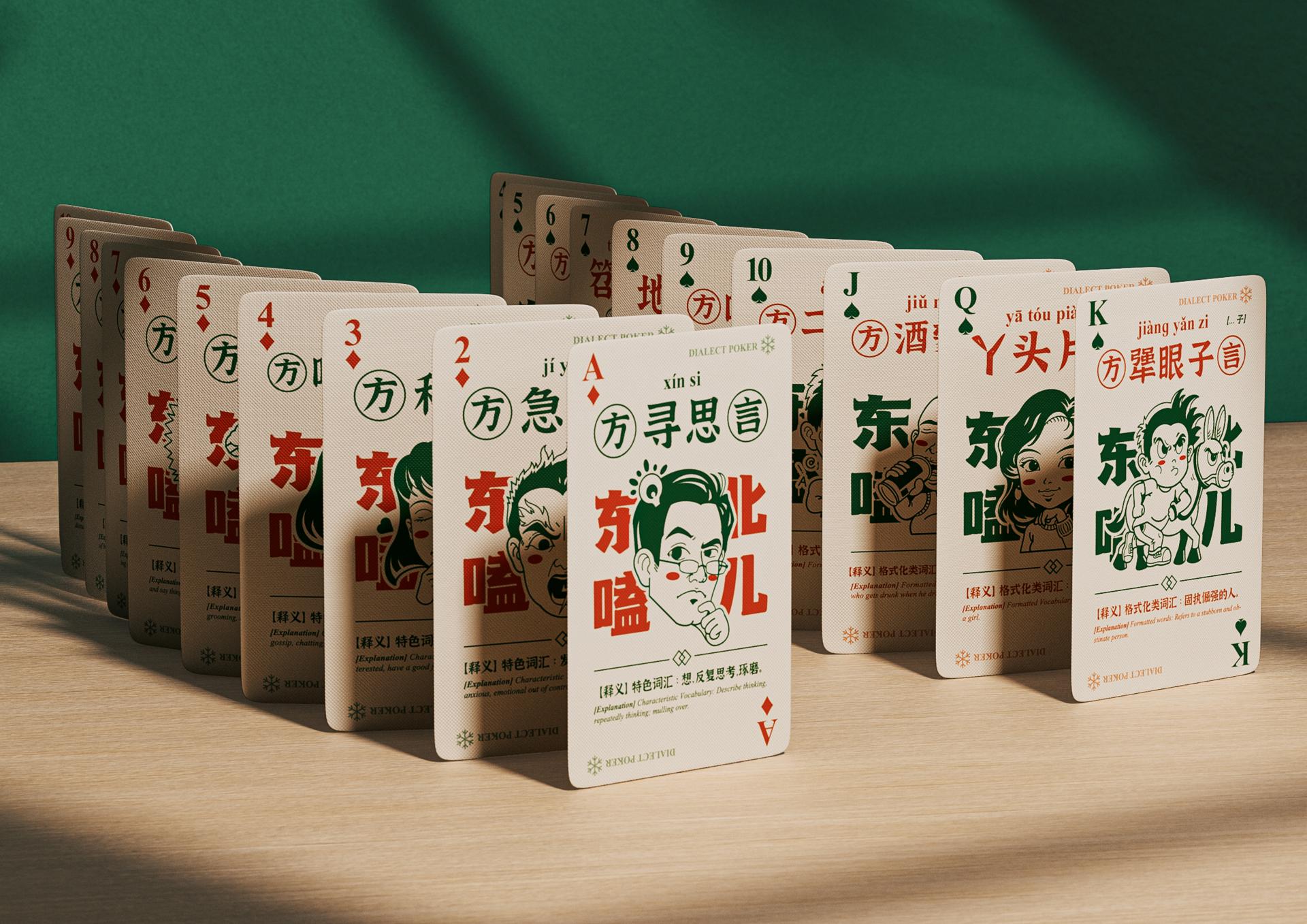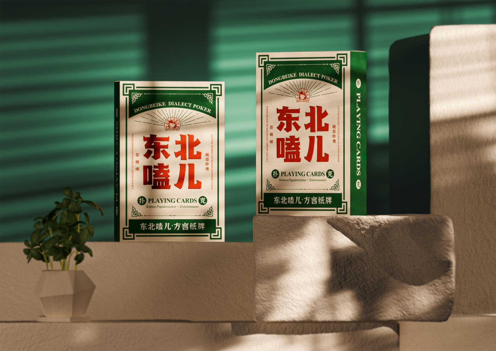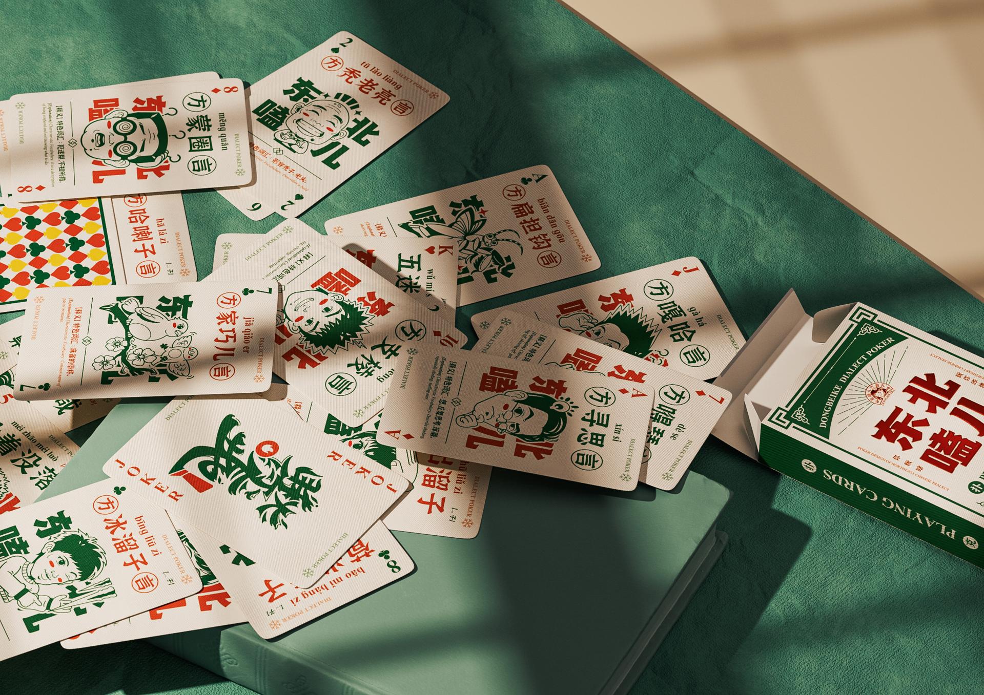Language is an important carrier of culture and form of representation. The Northeast Chinese dialect, which is considered as a witty, humorous, straightforward and tough, has intense local characteristics and rustic atmosphere. The positive development of the Northeast Chinese dialect responds to the sustainable development of Northeast Chinese culture, and contributes to a good language ecosystem. This work is a collection of paper cards that resorts the symbol elements of Northeast Chinese dialect and makes it visualized. With the color scheme inspired by classic colors of “Da Hua Ao” (Northeast large flower cloth padded jacket) and in the form of solid class (typically green) and non-solid class (typically red), the cartoon-based paper cards show sound variant words, formatted words and featured words phonologically, grammatically and lexically. Cartoon images are artistic, popular and entertaining, more approachable and readily acceptable to young consumers. Texts and pictures help user learn the dialect and implied meanings in the game play. The design aim of this work, learning through play, is attained by an affordable and popular form of communication.
