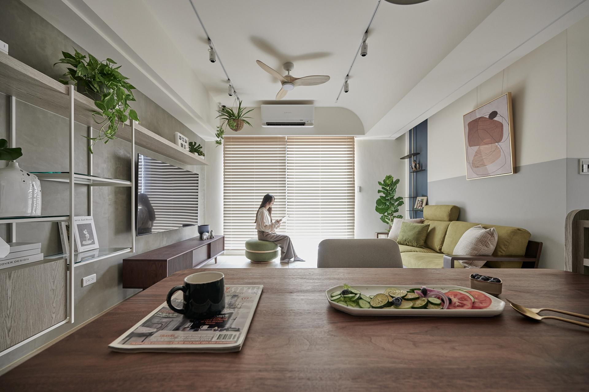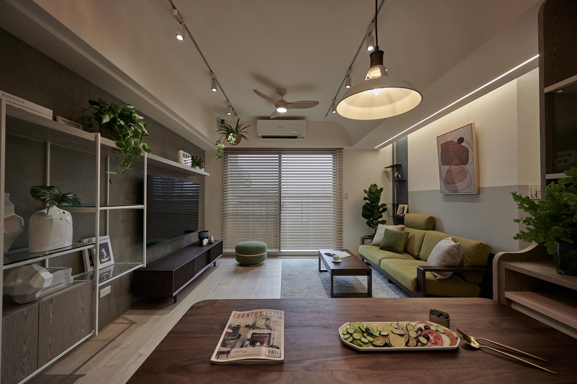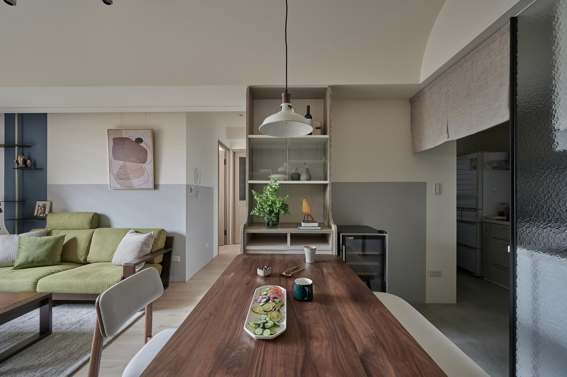 Upon entering the room, one will find the designer used raw concrete materials to decorate the entrance, dining, and kitchen floors and combined them with the circular flooring design to subtly distinguish them from the wood veneer flooring in the living room. In addition, two round glass ball ceiling lights are placed at the entrance to add a finishing touch. From the foyer to the living room, the designer has planned a whole side of storage cabinets and shelves to extend the space's visual effect and meet the homeowner's storage needs. Among them, the designer has set up an iron shelf on the back wall of the sofa, and the gray-blue wall’s unique shape is the space's highlight. The entire space is decorated with wooden furniture. Through the designer's skillful selection of different wood textures and color shades, they match each other, making the space harmonious and simultaneously containing a sense of layers. The low saturation of blue and green are used to decorate the space, which is not too abrupt but can also enliven the imagery.