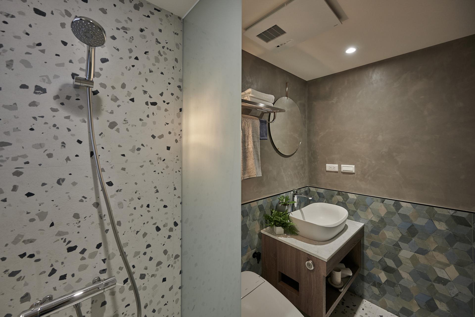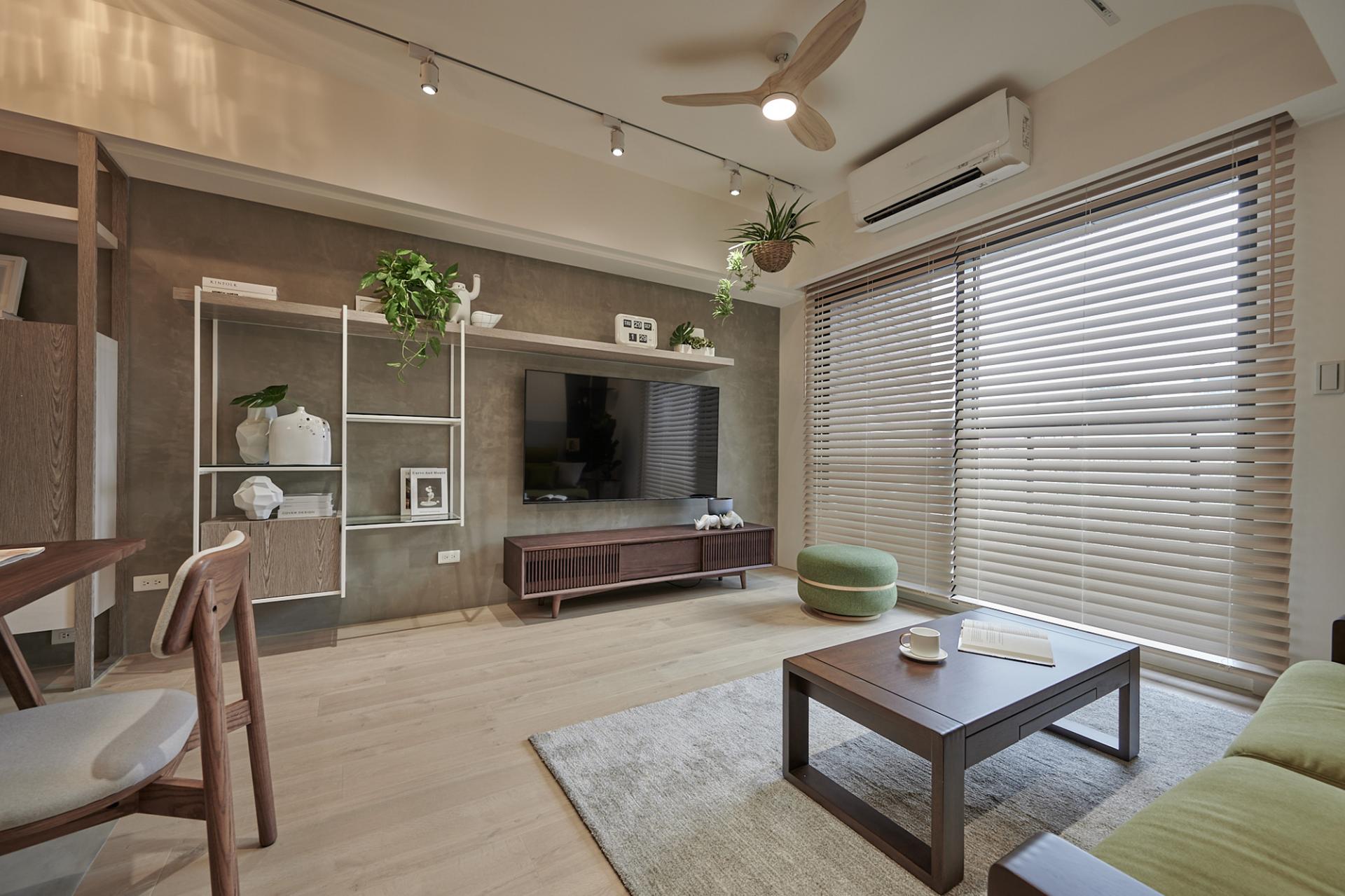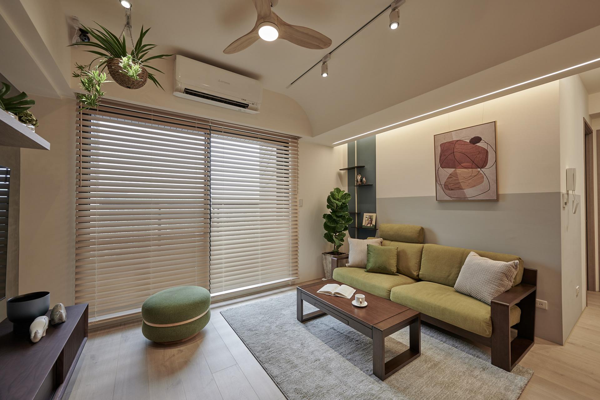Upon entering the room, one will find the designer used raw concrete materials to decorate the entrance, dining, and kitchen floors and combined them with the circular flooring design to subtly distinguish them from the wood veneer flooring in the living room. In addition, two round glass ball ceiling lights are placed at the entrance to add a finishing touch. From the foyer to the living room, the designer has planned a whole side of storage cabinets and shelves to extend the space's visual effect and meet the homeowner's storage needs. Among them, the designer has set up an iron shelf on the back wall of the sofa, and the gray-blue wall’s unique shape is the space's highlight. The entire space is decorated with wooden furniture. Through the designer's skillful selection of different wood textures and color shades, they match each other, making the space harmonious and simultaneously containing a sense of layers. The low saturation of blue and green are used to decorate the space, which is not too abrupt but can also enliven the imagery.