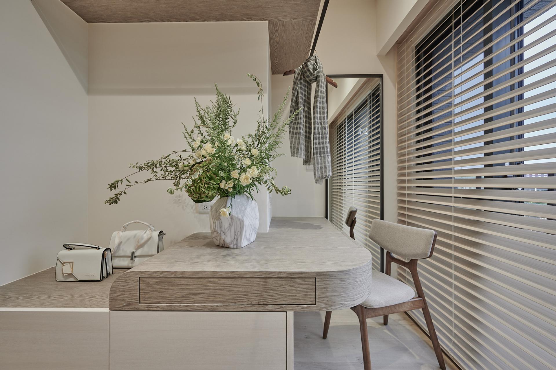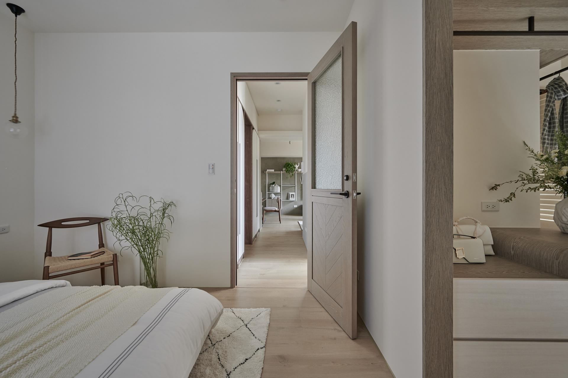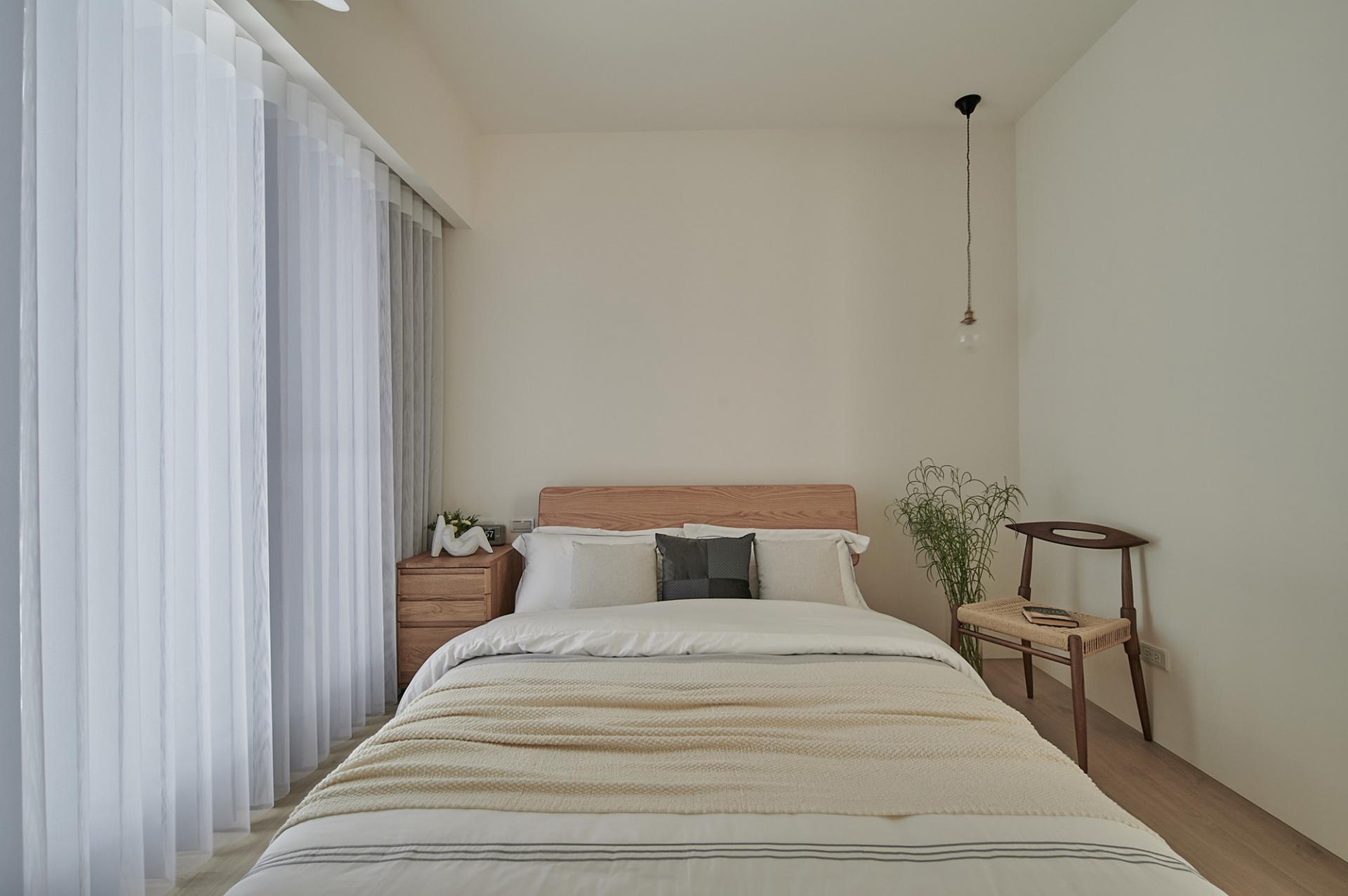 Moving slowly to the bedroom, one will see the light white color is planned as the main spatial focus instead of the wood color in the shared living area, presenting a light and elegant space texture. Among them is a retro glass orb chandelier, adding a touch of literature and art. The floor-to-ceiling windows on one side of the bed allow natural light to flow freely through the space, providing residents a warm and relaxing atmosphere.