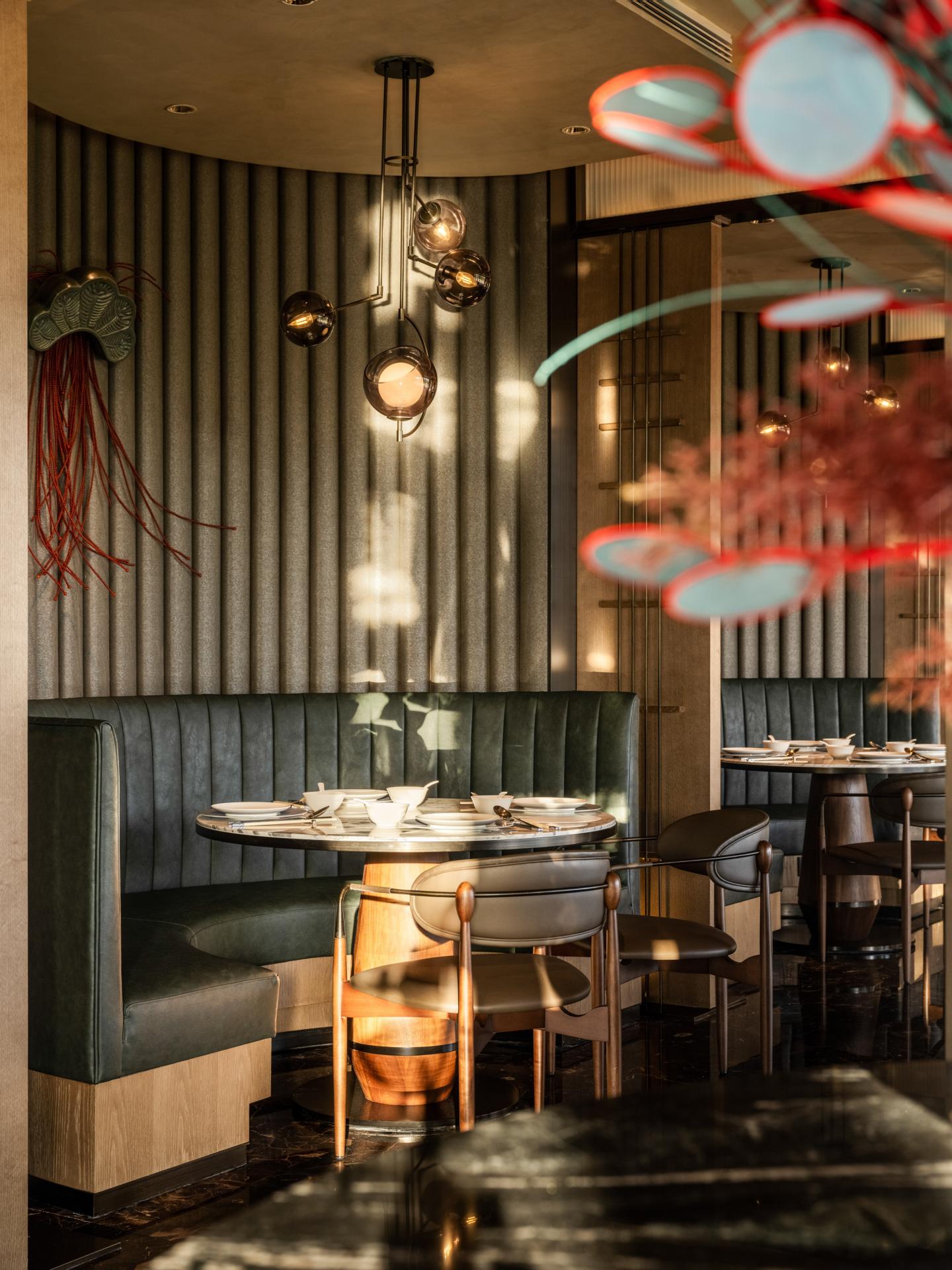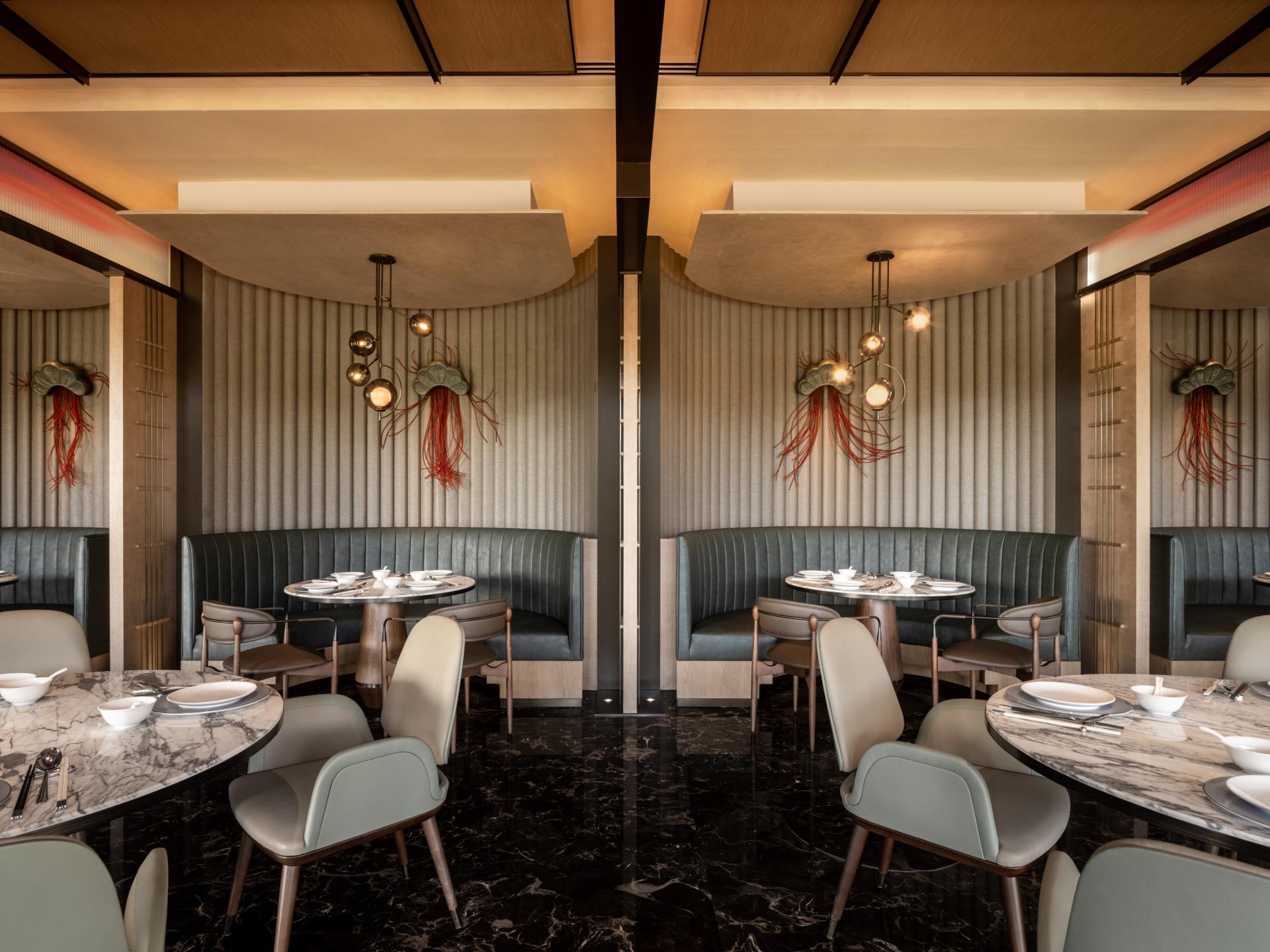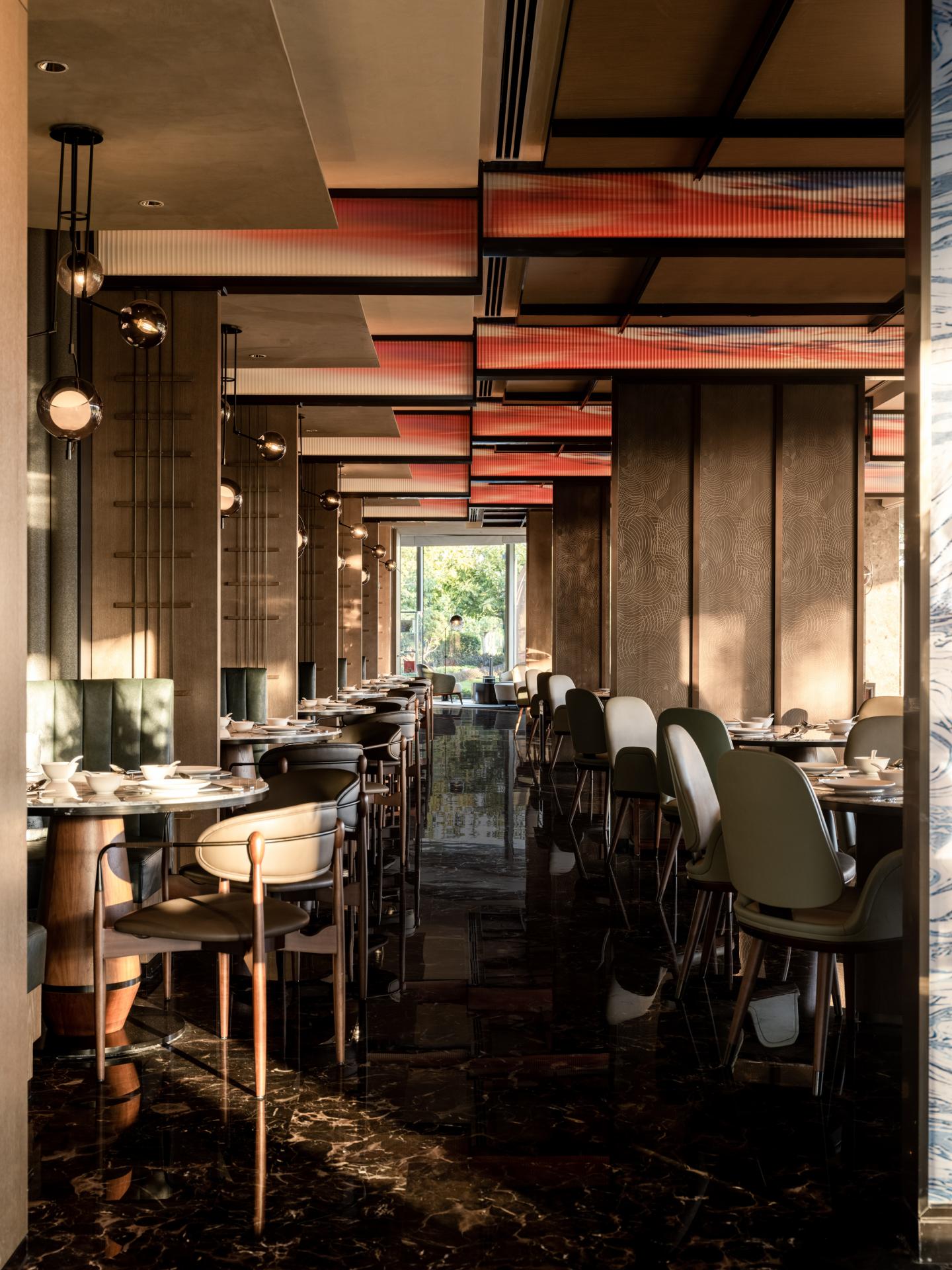 The design language of Chinese Restaurant extracts from Cantonese Opera originating in Guangzhou to give a sense of locality to the Chinese Restaurant in the hotel. The designers seek to develop the design language through color, instrument detailing, and stage decoration to symbolize local music artists—ceiling and Spacing structures inspired by stage curtains.