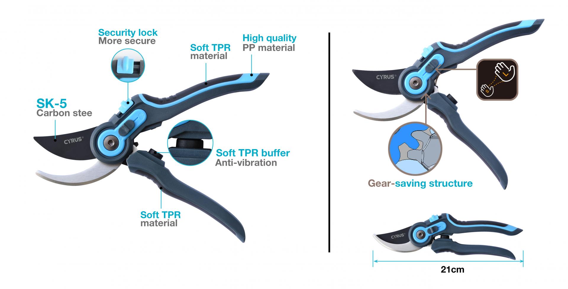 The product is a labor-saving, flexible, and efficient trimming tool. Not only dose it have basic cutting functions, but also it has innovatively developed gear-saving structure and adjustment function designed for large or small hands, to meet the different needs of users when trimming branches or gardens. Combined with the gear-saving structure and the adjustable scissors opening size feature, it improved the labor-intensive disadvantage for shearing of traditional gardening shears and provides a more flexible cutting method, helping users easily complete shearing tasks and improving work efficiency.The product adopts pre-rotation and gear structure patented technologies. Before shearing, the handle rotation drives the blade rotation through the pre-rotation structure, allowing the scissors blades to be securely fastened beforehand by applying a certain amount of pressure to the branches or leaves in advance. The gear structure gradually cuts through the branches or leaves, making the pruning process more efficient. At the same time, this design can reduce the effort required from users, making trimming easier and more labor-saving, thus enhancing the user experience.The product features an adjustable scissors opening size function, allowing users to freely adjust the degree of opening of the shears according to the size, thickness, or hardness of the branches or leaves. This enables the shears to adapt to different gardening trimming tasks, achieving a versatile tool for multiple cutting uses, thereby providing users with a a more flexible user experience.