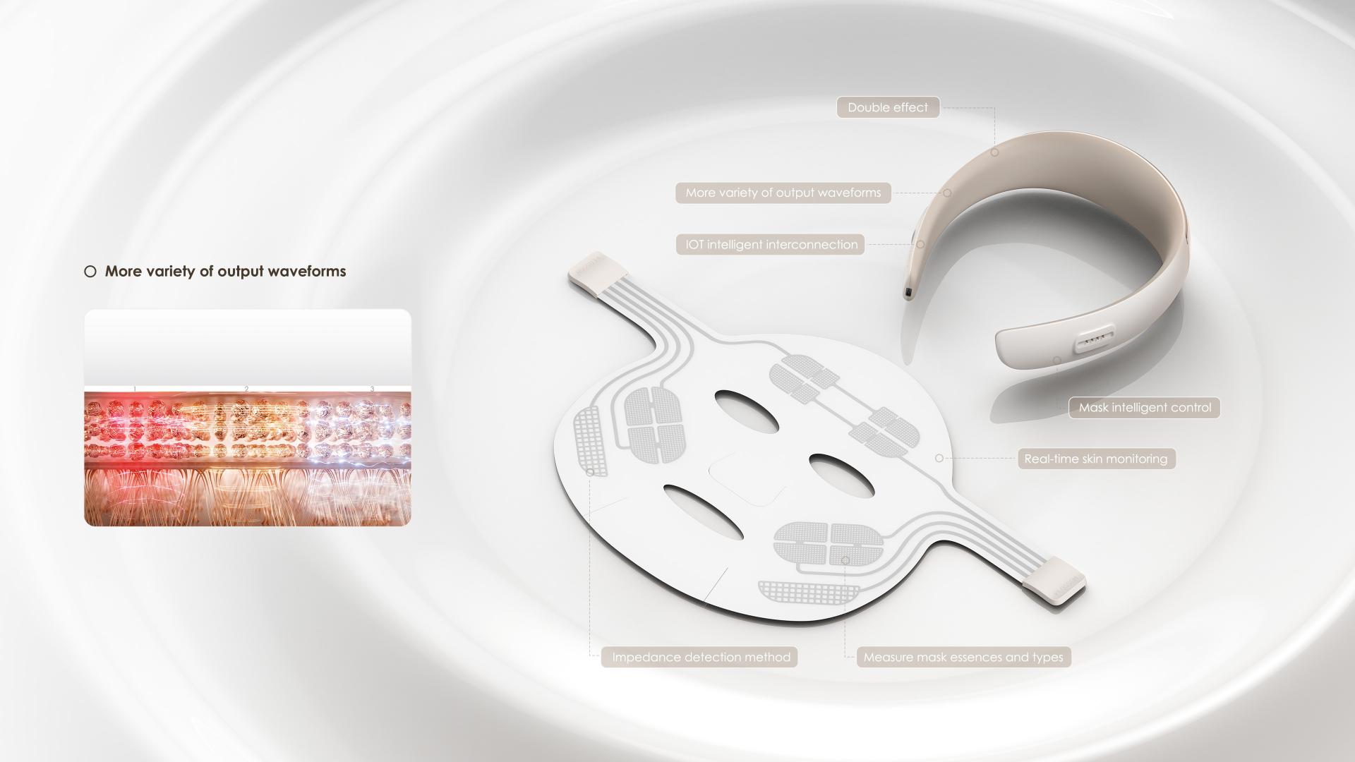 This product is based on the impedance detection method of electronic masks, using algorithms to exclude interference from the mask itself and perform skin impedance detection. Algorithms are used to calculate impedance and accurately measure and distinguish between different types of mask essences. By applying IoT smart connectivity technology, intelligent control of electronic masks is realized for the first time. In addition, impedance detection technology is added to real-time monitor the skin's impedance status, and adjust the current energy output accordingly, making it safer and more effective. The existing electronic masks in the industry primarily focus on promoting absorption with a single function. This product focuses on lifting while also promoting absorption, achieving a dual effect in one treatment. Equipped with a headband connector, it can output a variety of waveforms and provide a rich tactile experience, which is a significant difference compared to existing competitors.
