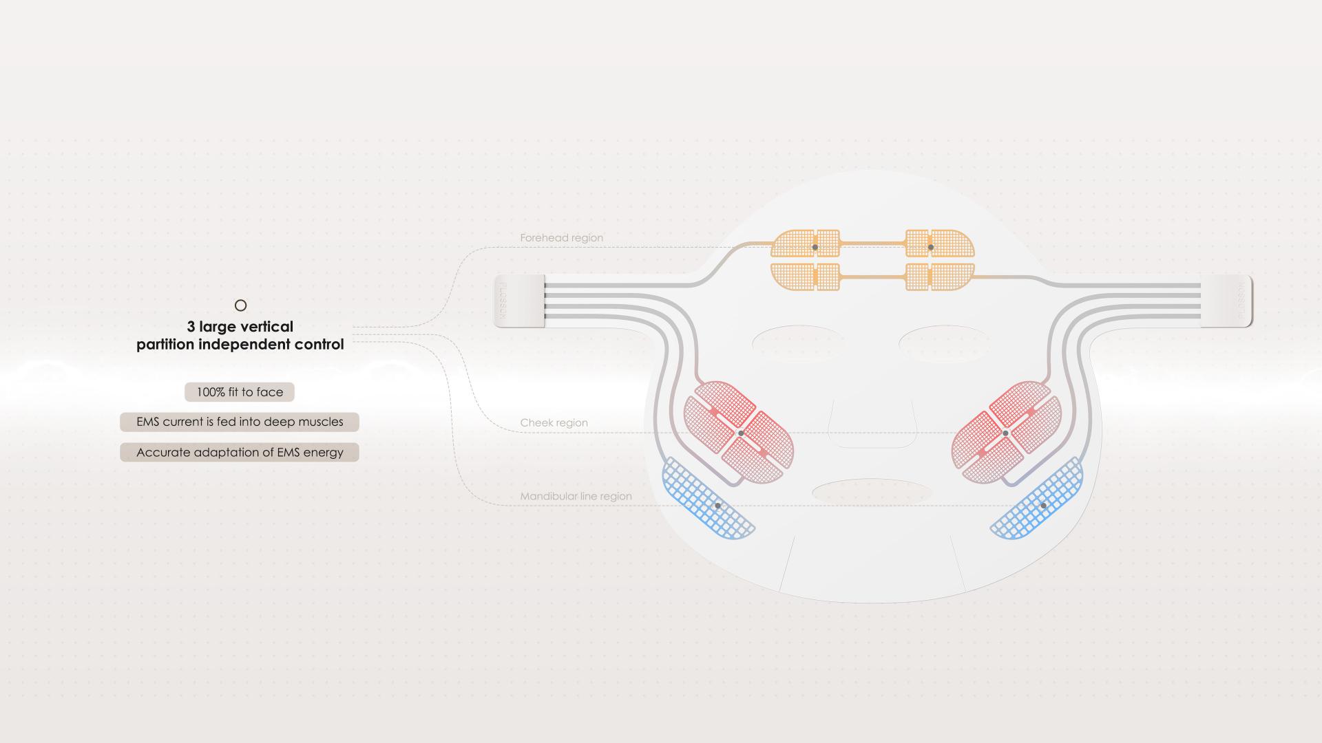 This product takes inspiration from medical devices and combines EMS current technology with flexible electrode materials to create a new type of wearable electronic beauty device. The flexible conductive material is soft, skin-friendly, and has excellent conductivity, allowing the electrodes to perfectly fit the face and ensure the delivery of EMS current to deep muscle layers. Compared to conventional handheld EMS beauty devices, this product can more accurately and extensively target key facial expression muscles, achieving a lifting and contouring effect. Matrix is equipped with a self-developed intelligent energy adjustment algorithm that precisely adapts the EMS energy. It automatically calculates the appropriate energy based on the characteristics of different facial zones, making it more precise and intelligent. Users can accurately control the output of different current energy levels and current types, independently controlling the three major prone areas of the face (forehead, cheeks, jawline), making the treatment more precise and tailored.