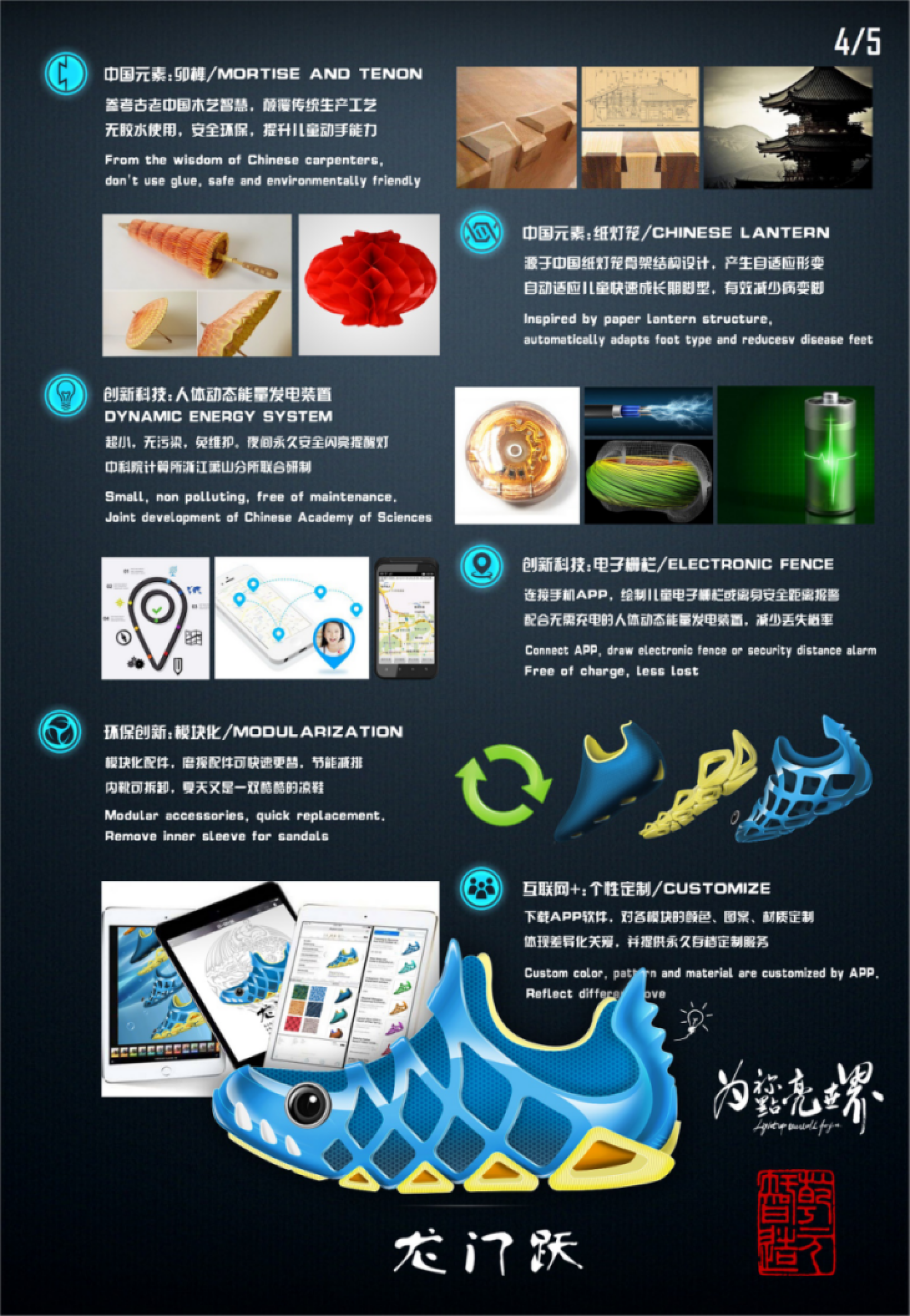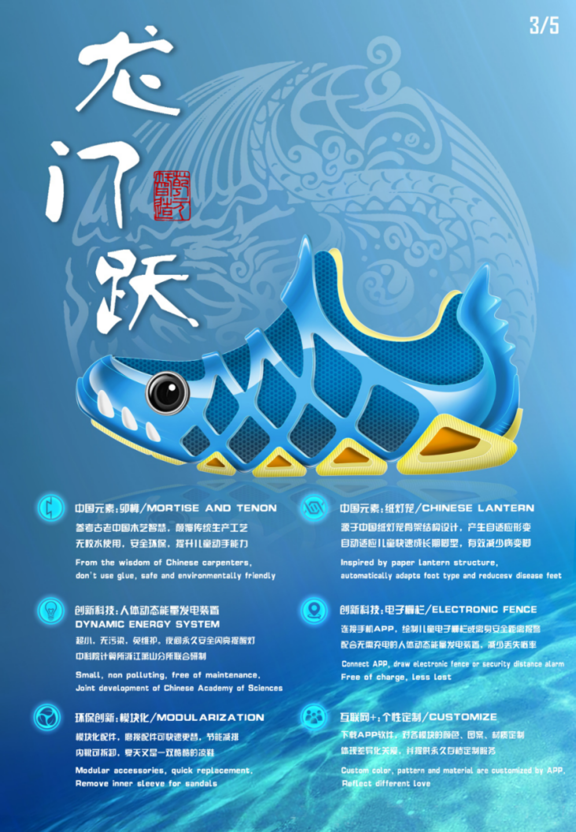 We use transparent TPU material and integrate a dynamic micro-energy generation system that converts the kinetic energy from each step into light, ensuring nighttime safety. The unique "growth" mechanism allows size adjustments through interchangeable modules, accompanying every stage of a child's development while reducing resource waste. Additionally, we have infused the design with the cultural symbolism of the "Carp Leaping Over the Dragon Gate," turning each pair of shoes into an emotional vessel that carries parents' hopes for their children's bright future.