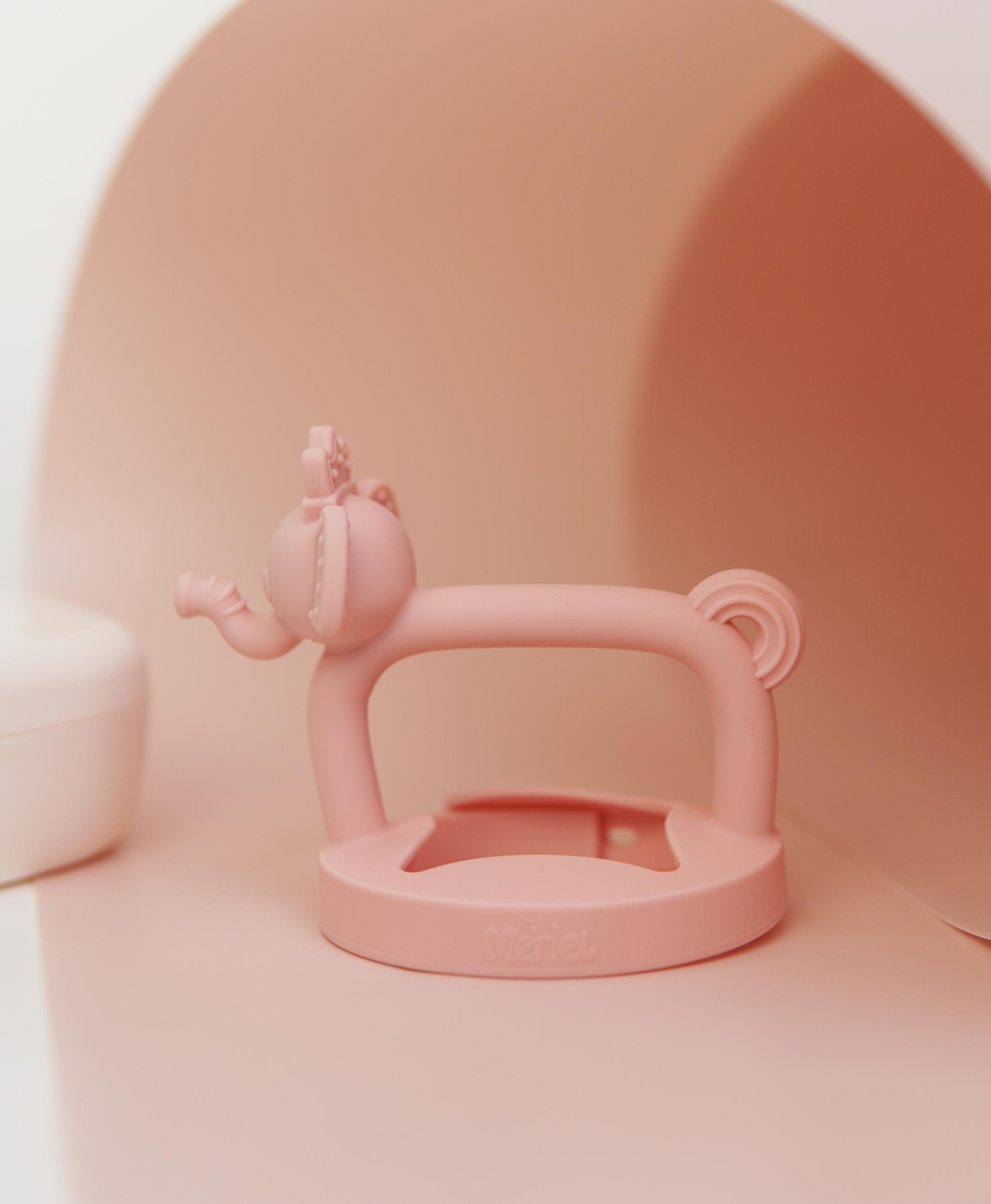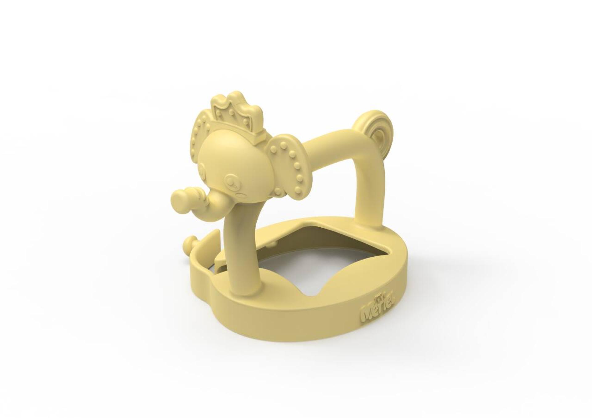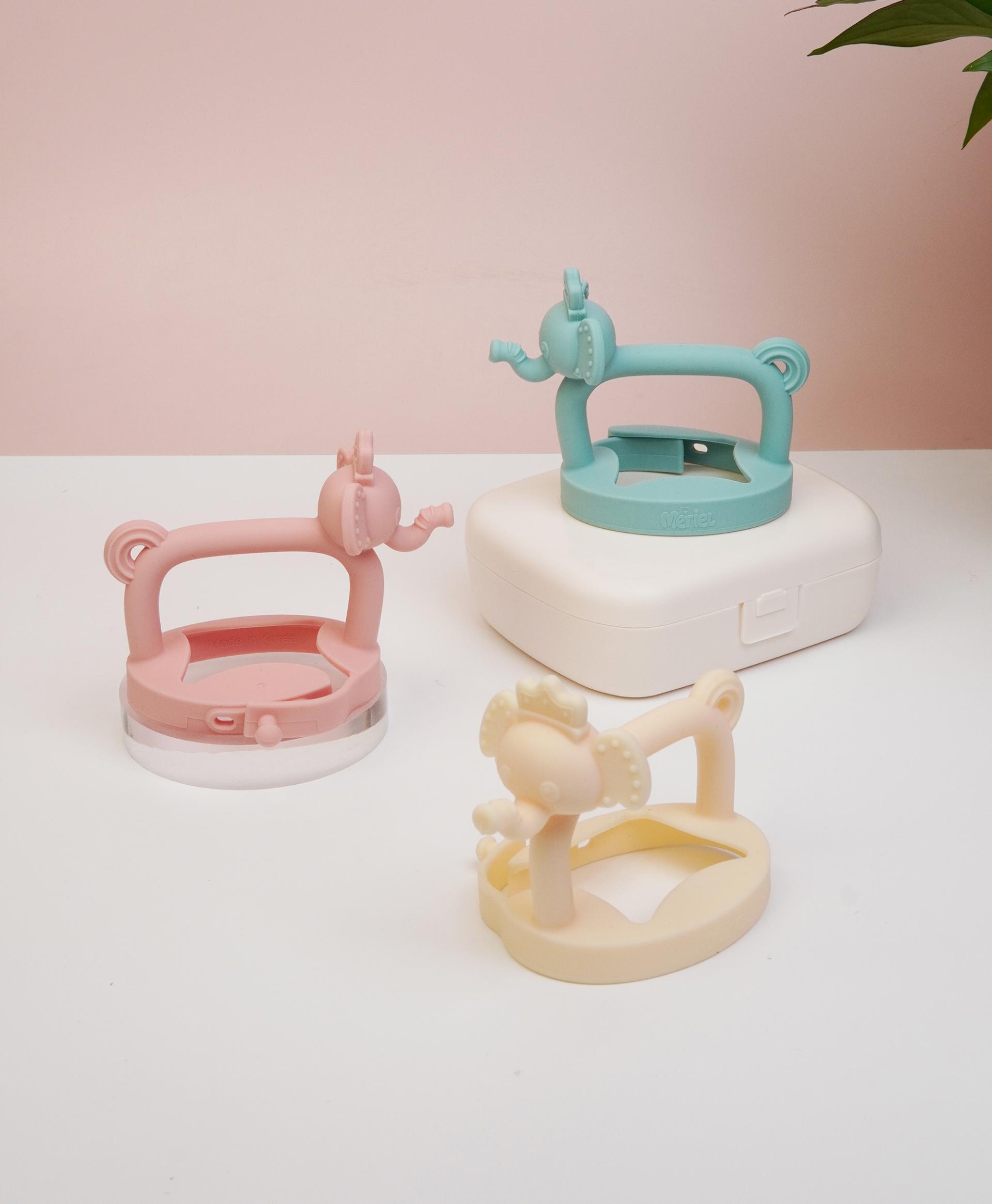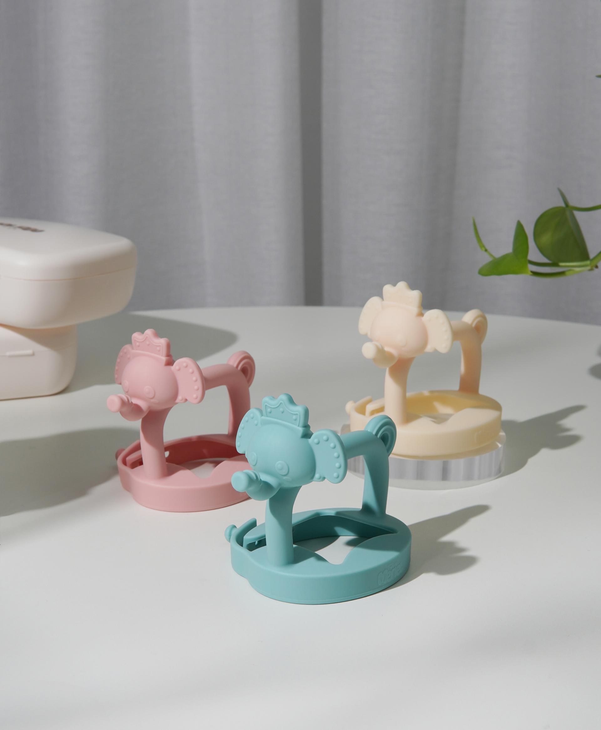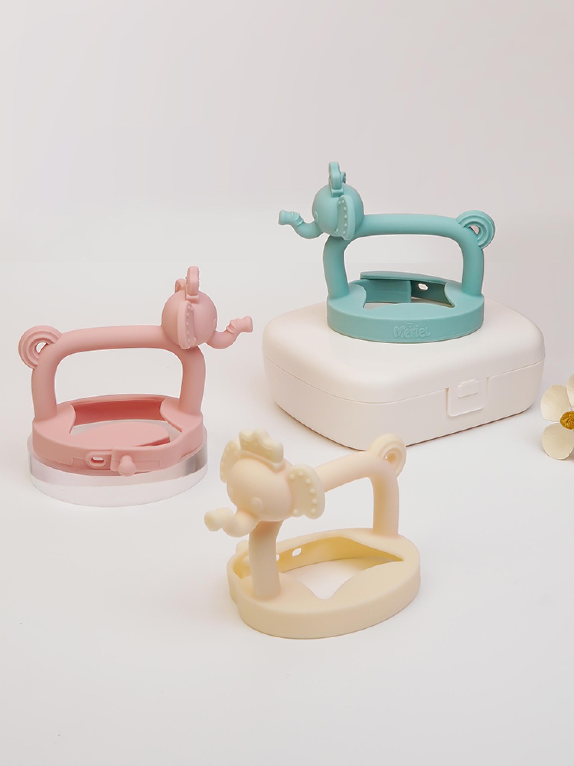 This is a bracelet type baby teether in the shape of elephant, which is characterized by being worn directly on the hand to prevent it from falling, and the bracelet can be adjusted according to the needs of the elastic which can be fastened on the armrest of baby stroller during the outing. The middle crossbar part is designed to be easy to grasp for babies. The teether is made of liquid silicone as a whole, which help the baby to bite more comfortably. The cute elephant character is used in the design which attracts the baby. The teether has a total of 5 bite points, and the baby can grasp a variety of ways which keeps the teether more fresh feeling for play and bite.