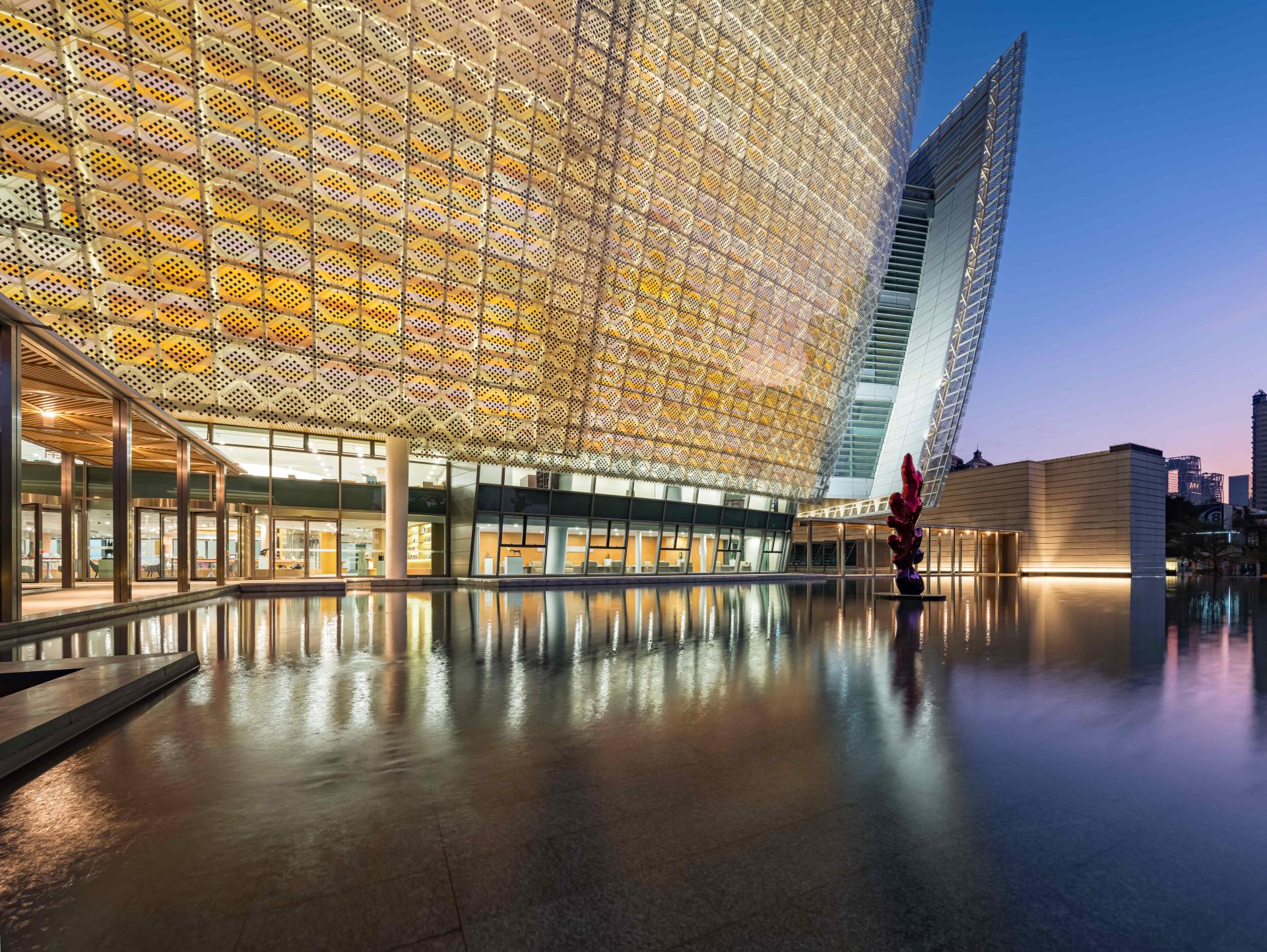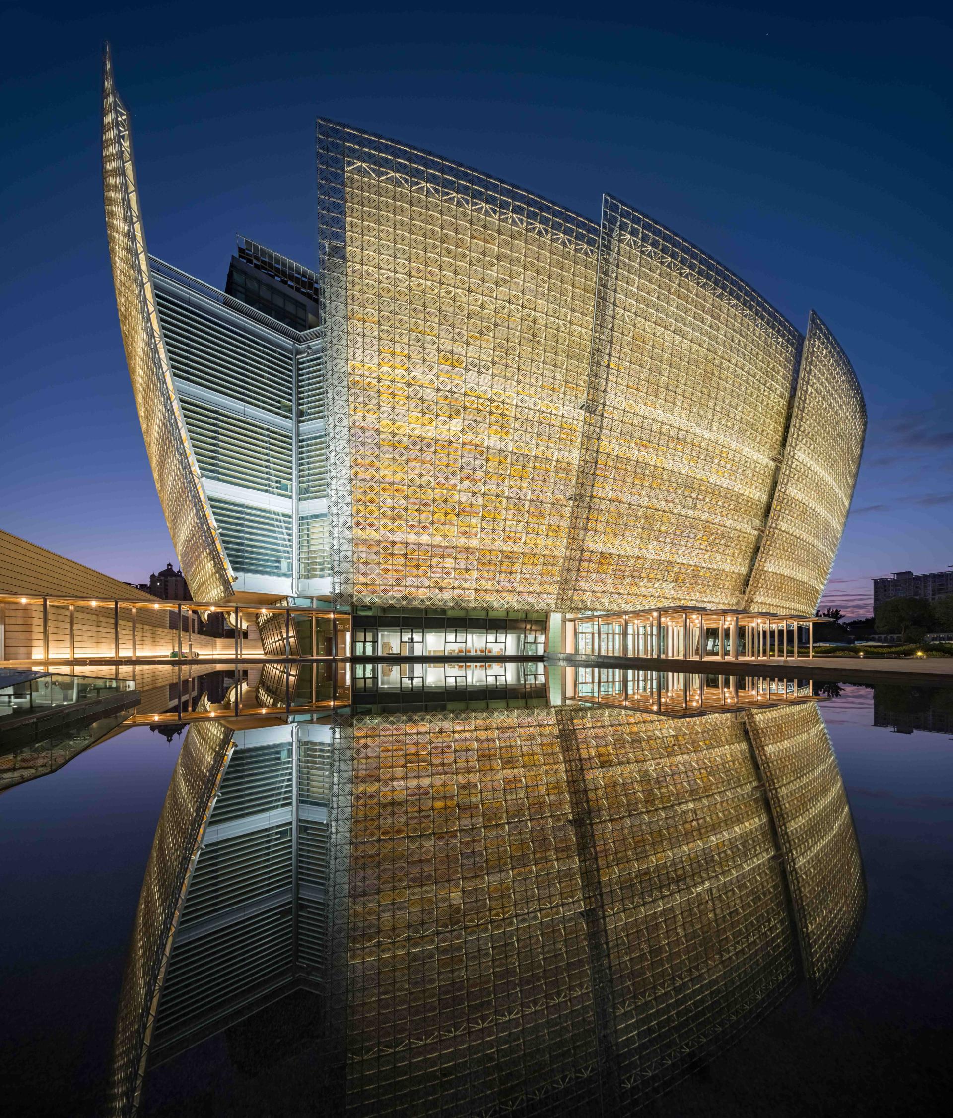Guangzhou has an old and a new central axes. Along the latter lies the new Guangzhou Museum of Art, which resembles a flower blooming heroically. The building is surrounded by 12 “petals” (three on each side), 35 meters tall and 34 meters wide each, and connected organically. The exterior is composed of 21,008 photovoltaic glass panels pieced together by hand, forming the largest PV panel set on the exterior wall of any public building.