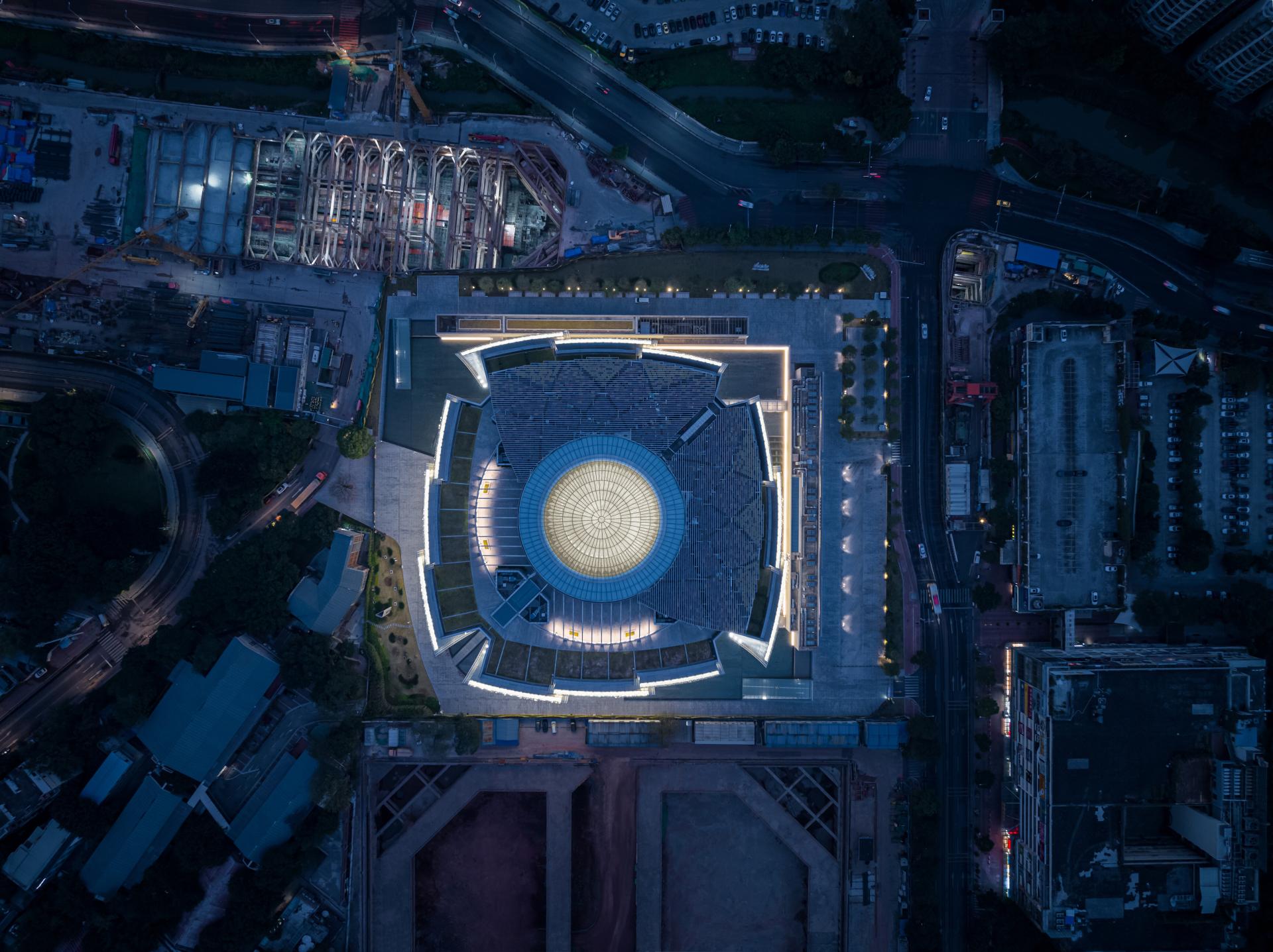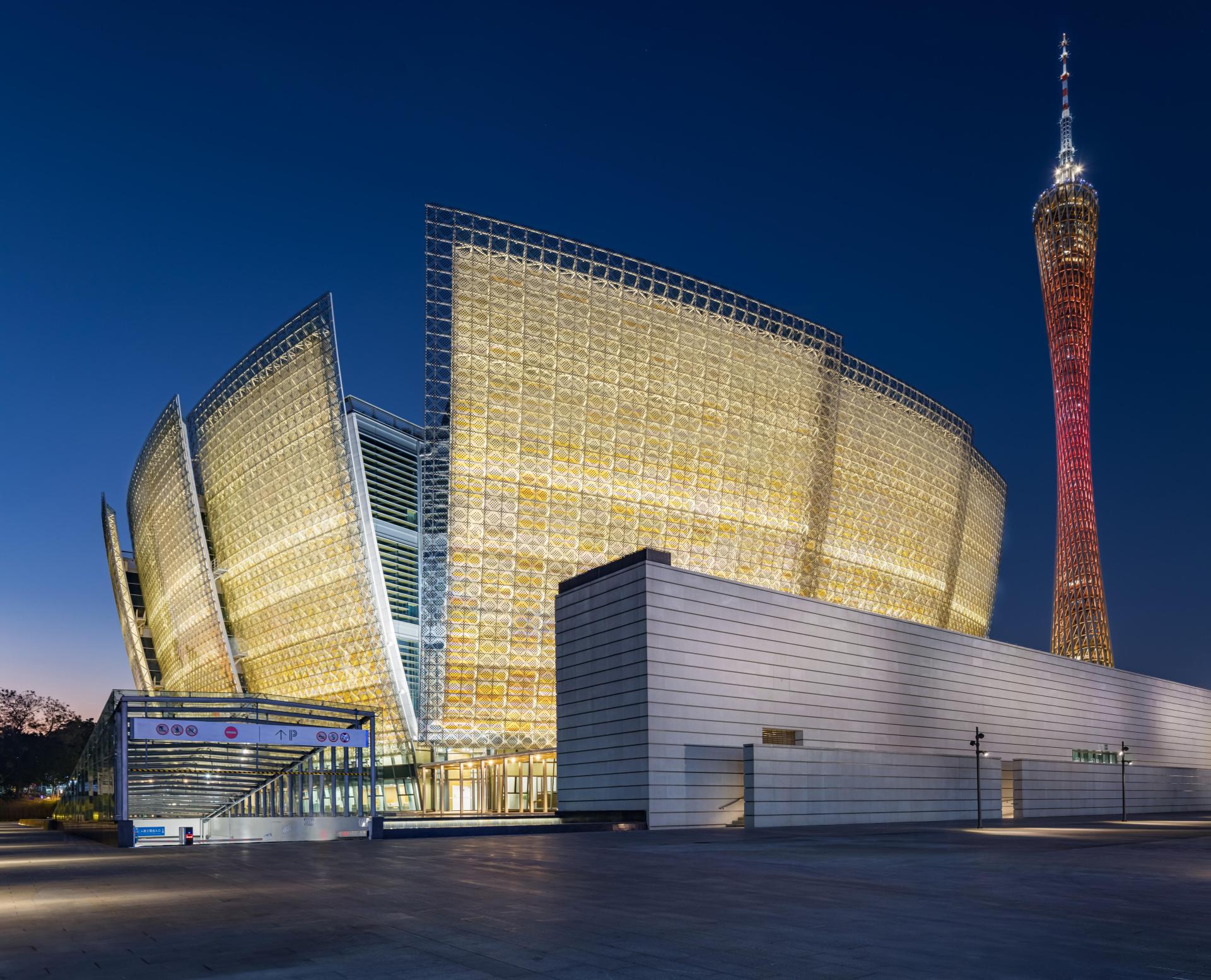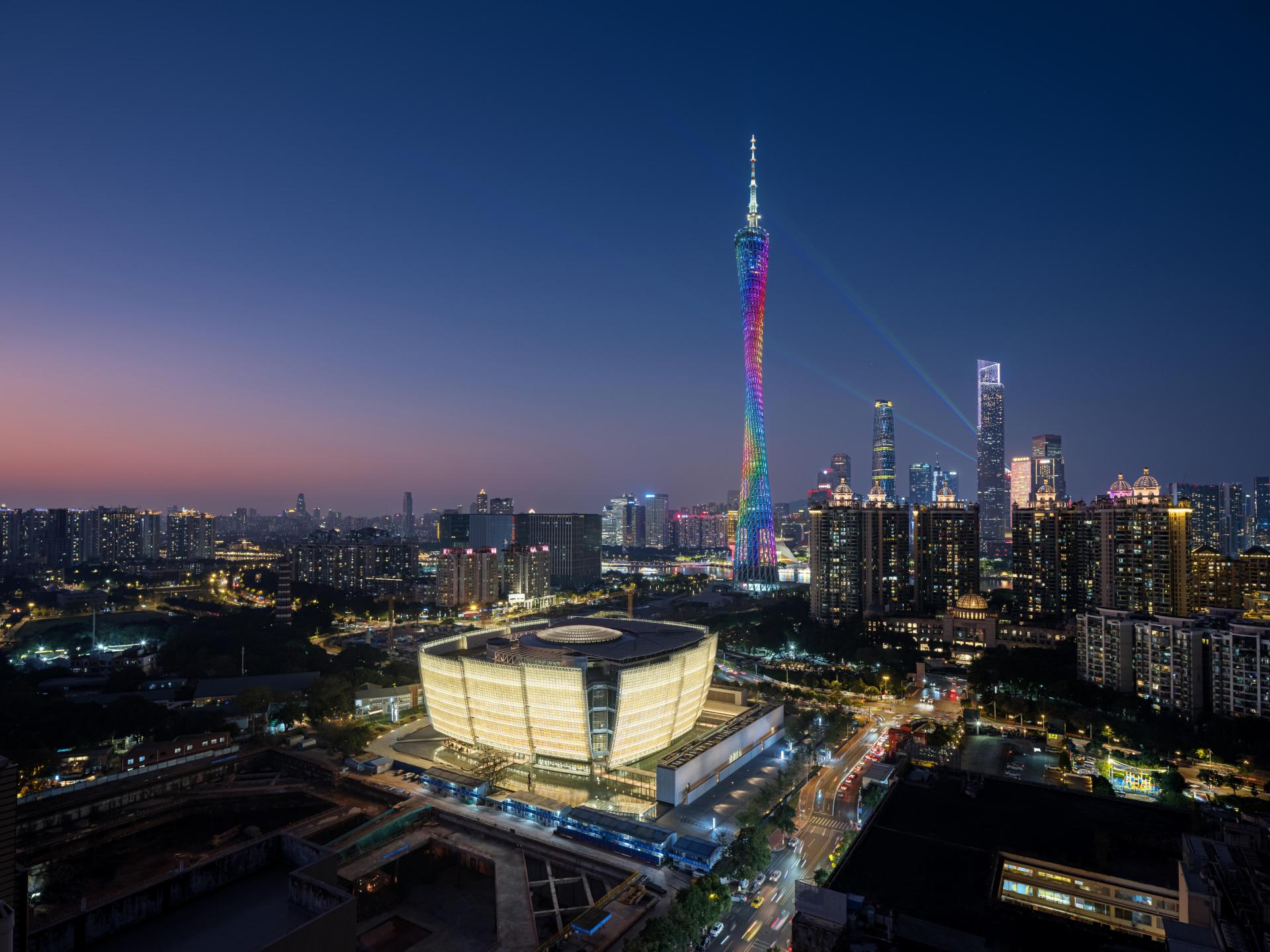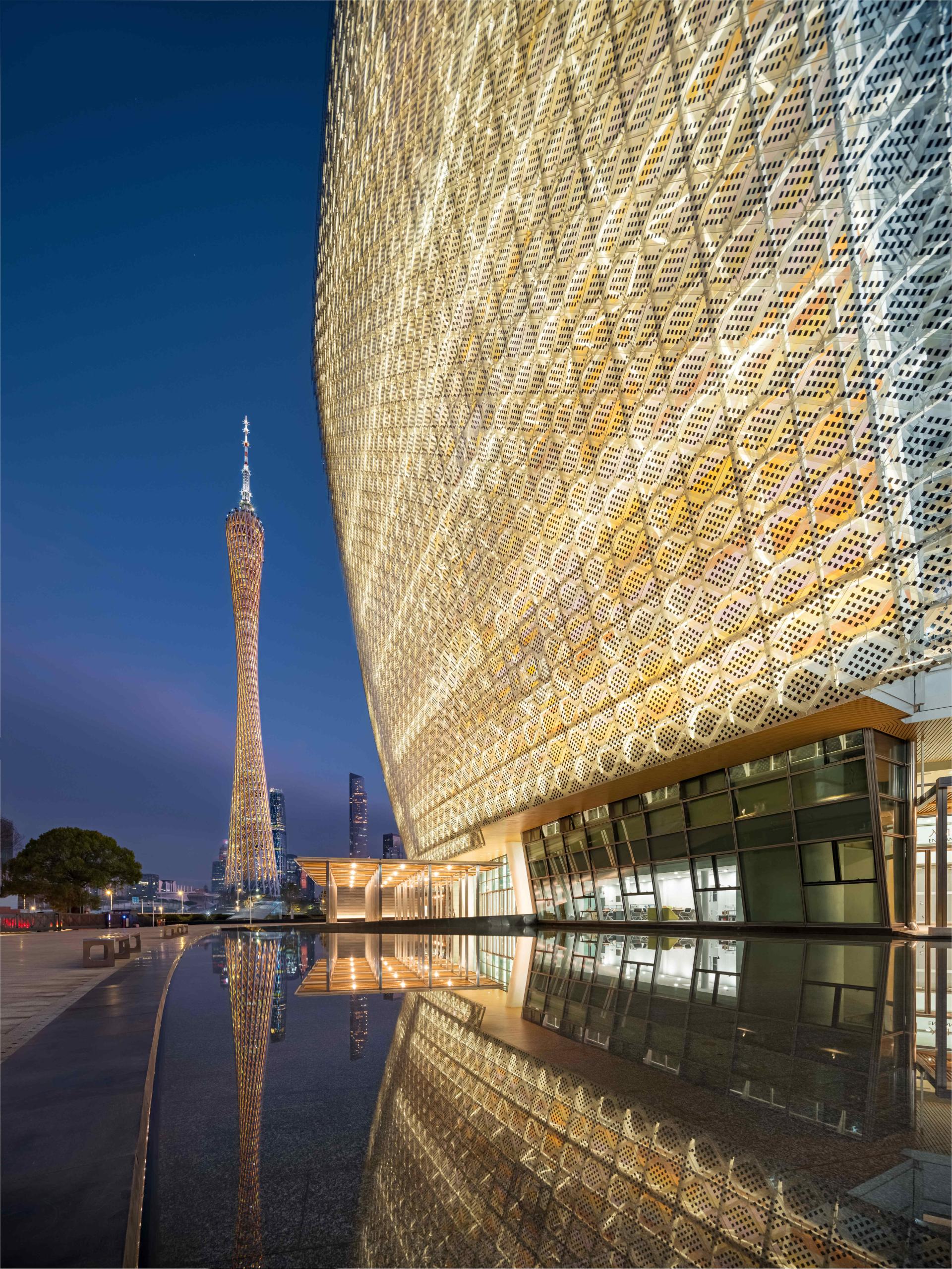 At night, the large building stands out from the surroundings despite the low intensity of the lighting. In a bird’s-eye view, the museum and the Canton Tower in the distance set each other off like a beautiful flower in front of a slender woman, outlining the city’s new axis and showing us the true splendor of this “heroic flower”.