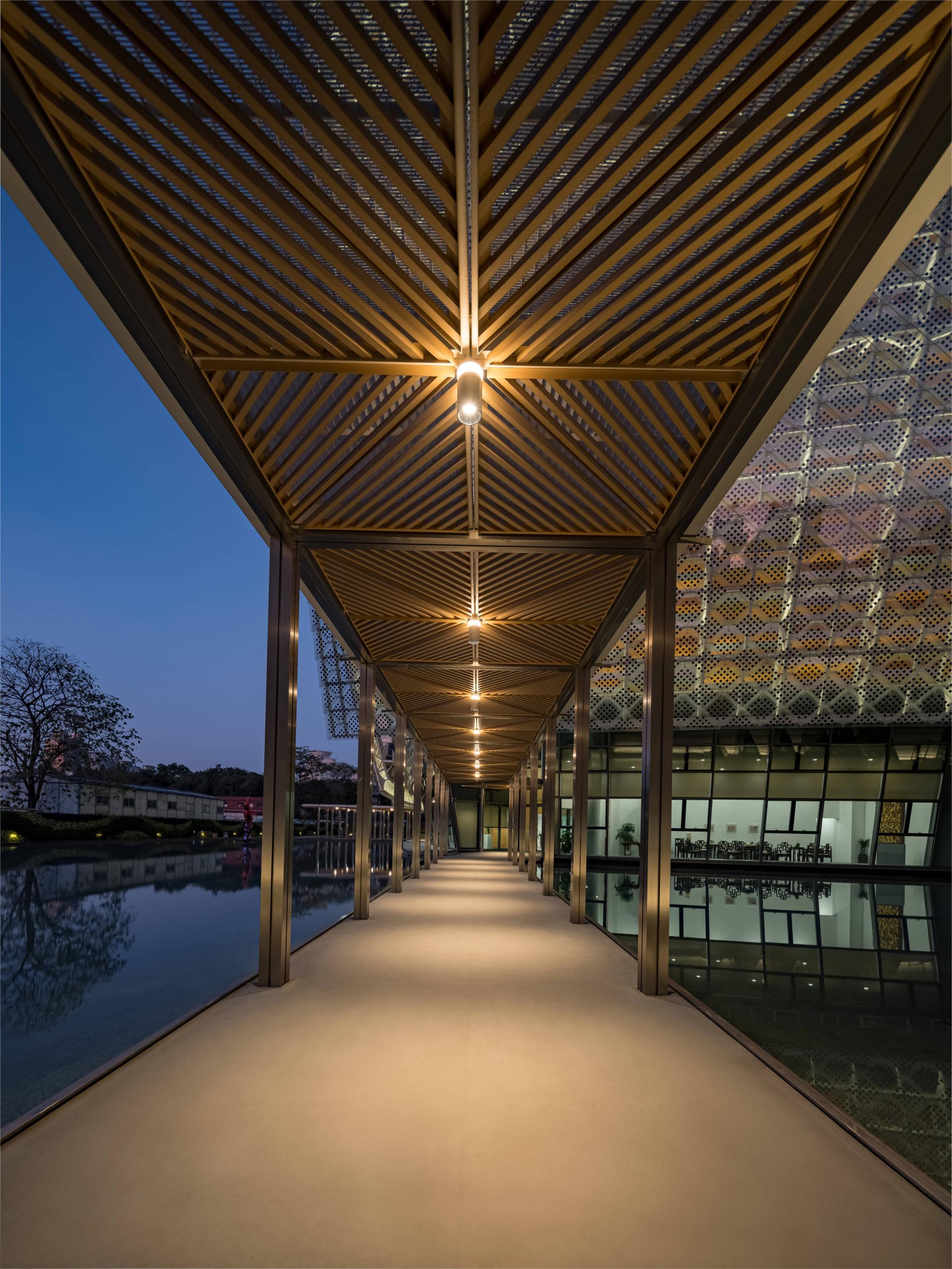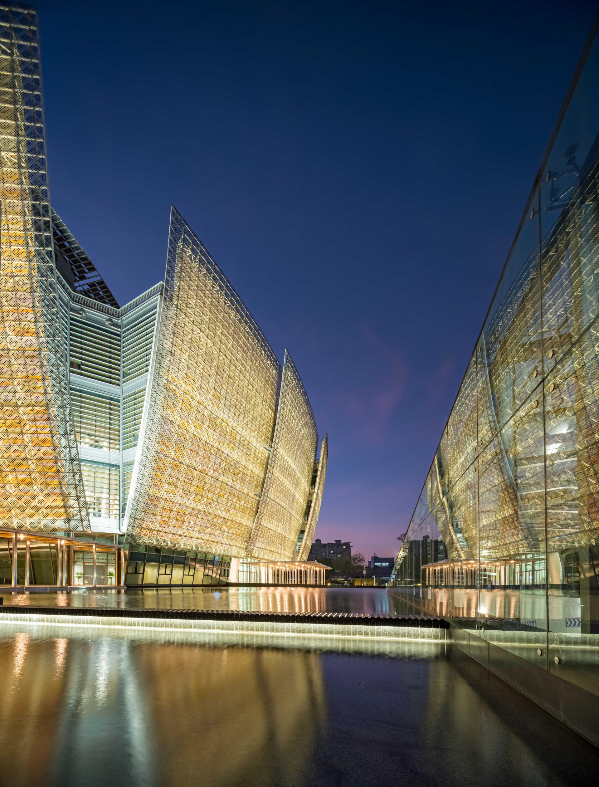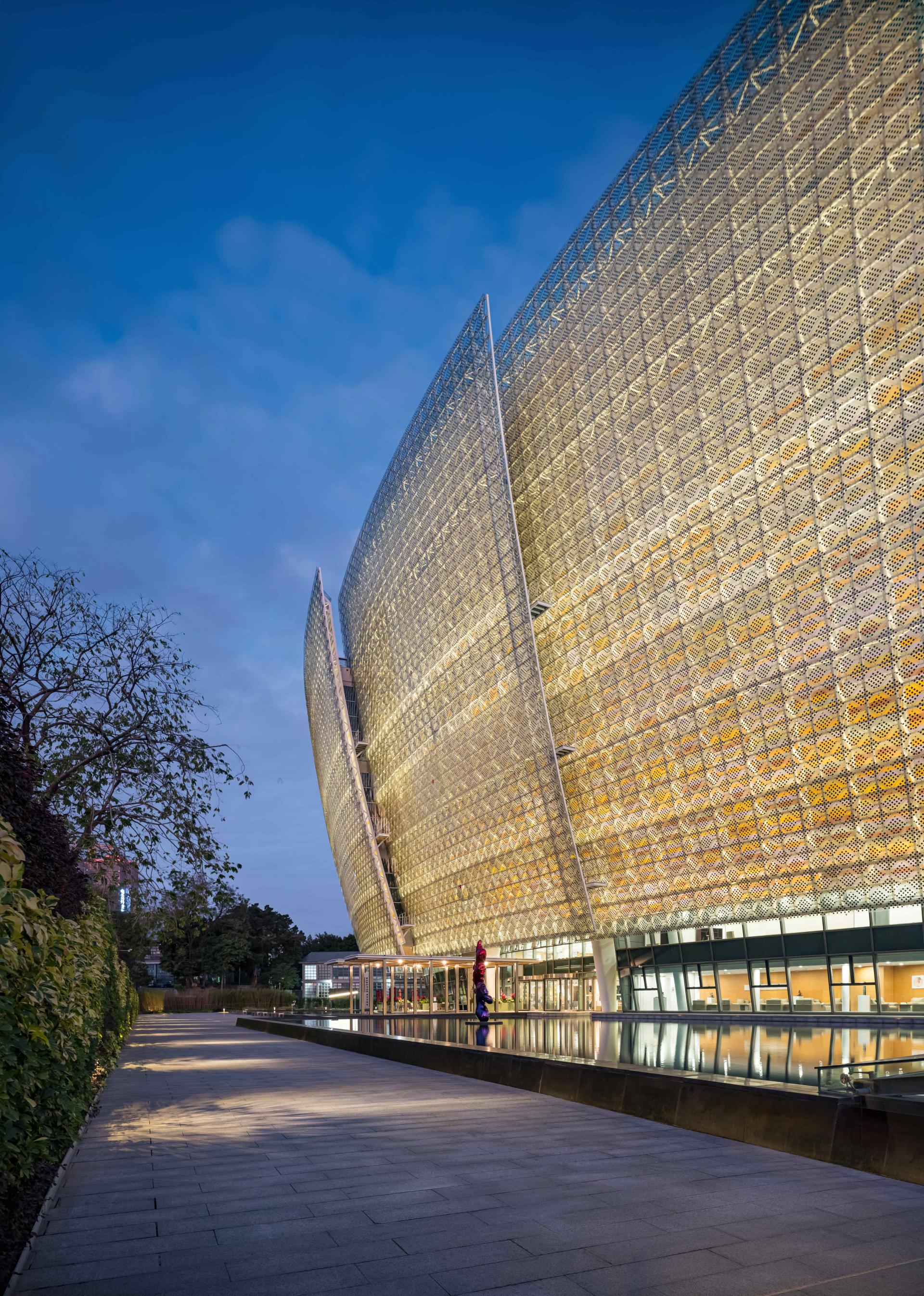 The lights are fixed to the horizontal trusses between the panels and backing, illuminating all the nearby space and making visible the colors and patterns of the inner structural components and ornamental panels. The most appealing aspect of the museum building is its double exterior, which is also the focus of the lighting. The backing for the curtain wall is made of aluminum. The panels, 240 cm x 25 cm each, are painted with a RAL D2 color scheme and joined together. The color is rich and thick at the top and paler at the bottom, making it look like flower petals and forming a unique color rhythm on the inner wall. With the exterior glass installed at a 45-degree angle and the pattern of the black PV components, a rich display of light and shadow is created, giving the “flower” an intense sense mystery.