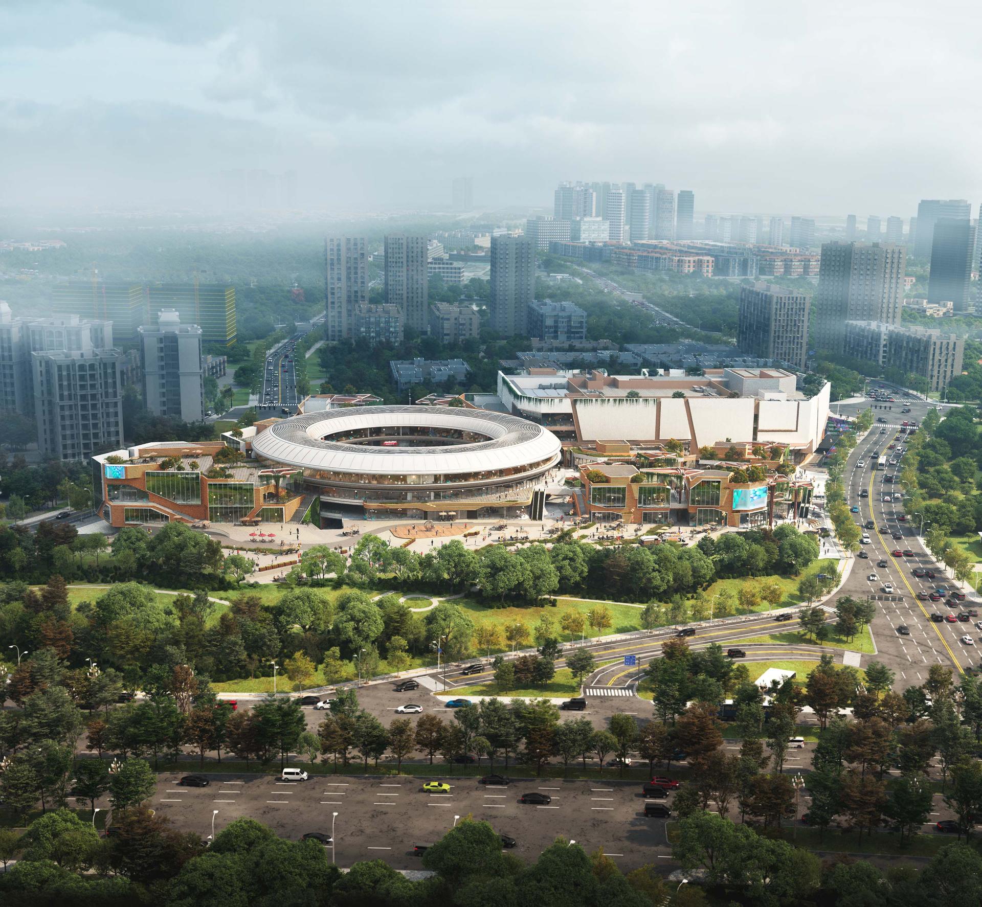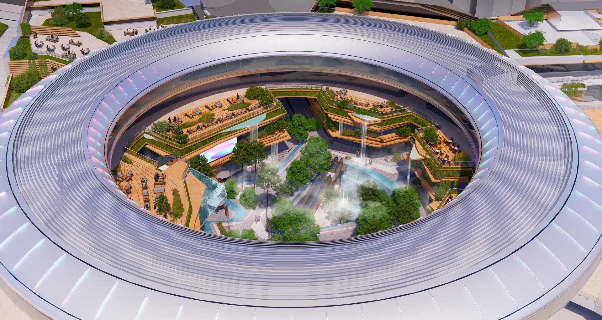 Above the central square floats a geometric ring-shaped structure, offering 360-degree city views and unique perspectives of the square. From a distance, it appears like a UFO above a mountain forest.
