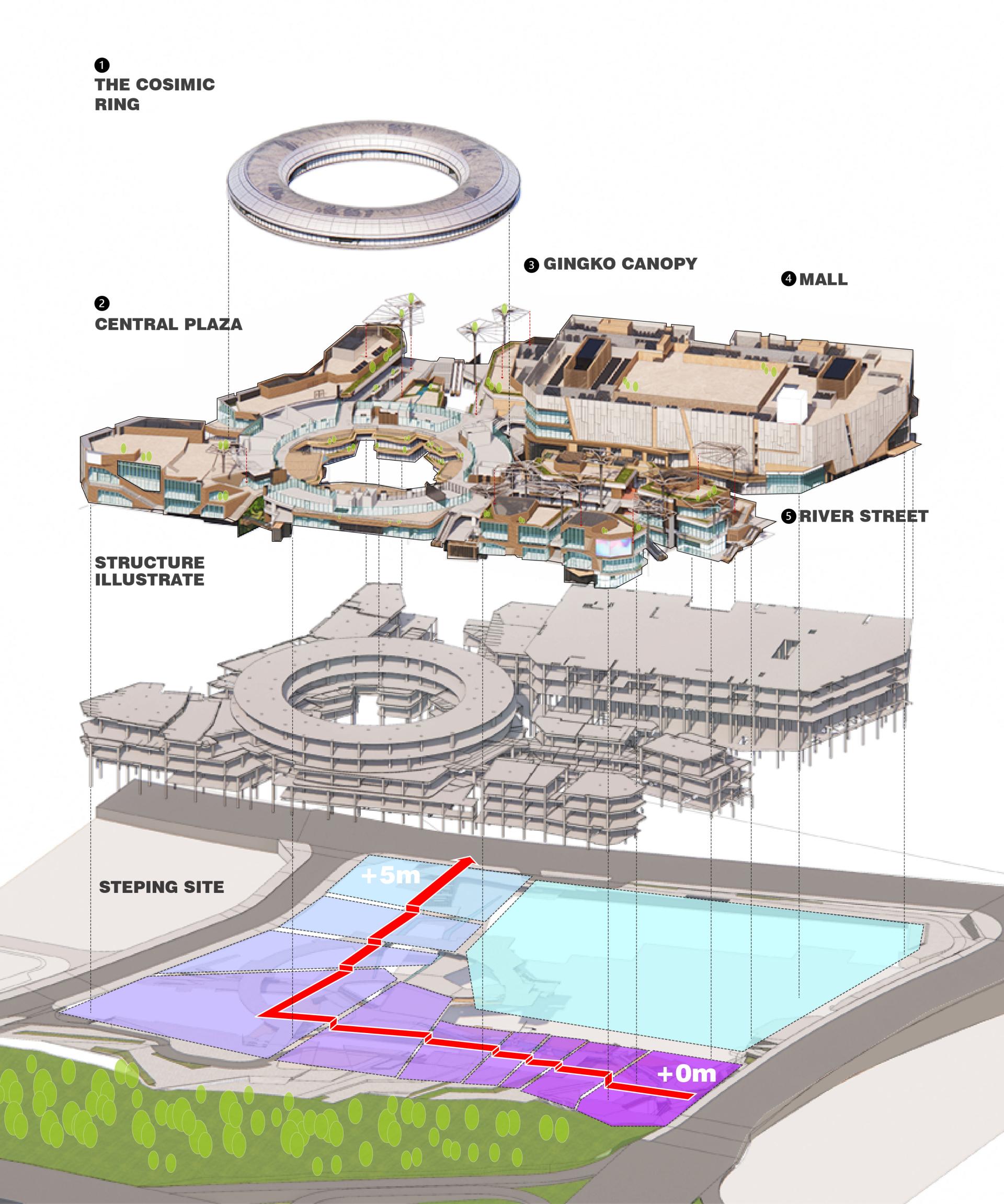 Utilizing the natural one-floor elevation difference between the site's southwest and northeast corners, an "L-shaped" main water system was created, carving through the land like a natural river. Buildings are arranged in terraced steps along the river, connected by gentle slopes, offering a continuous and engaging walking experience.