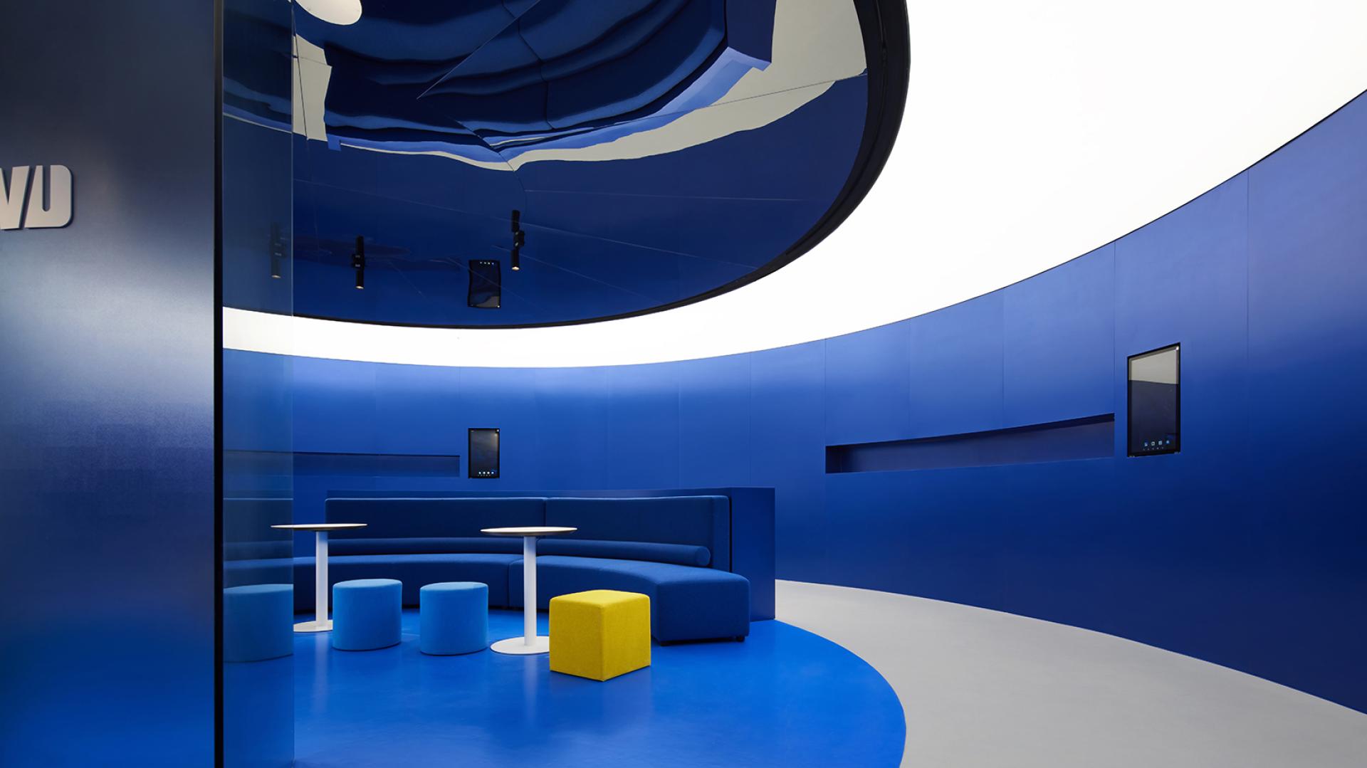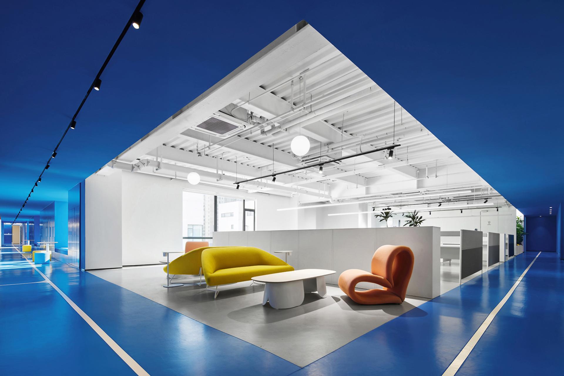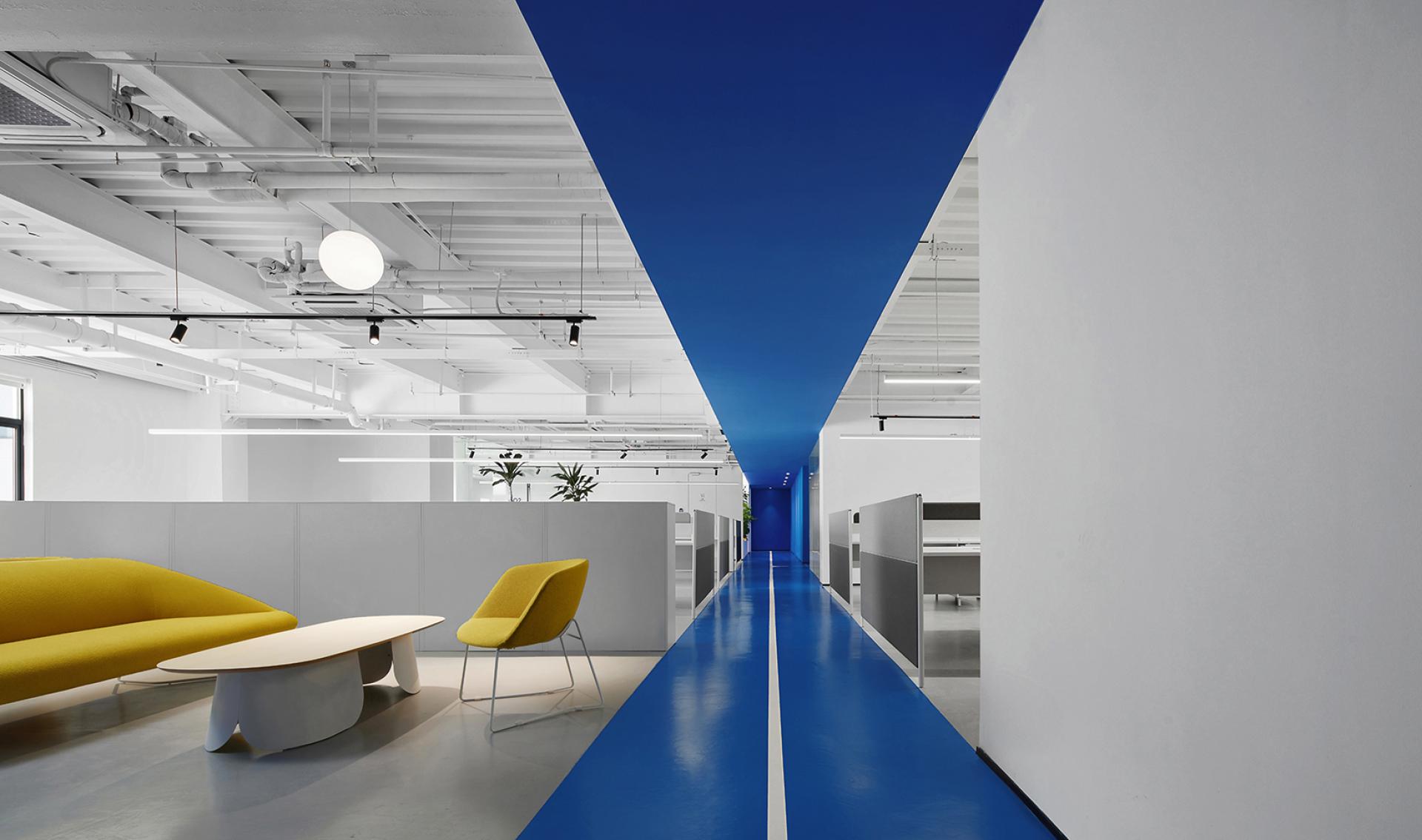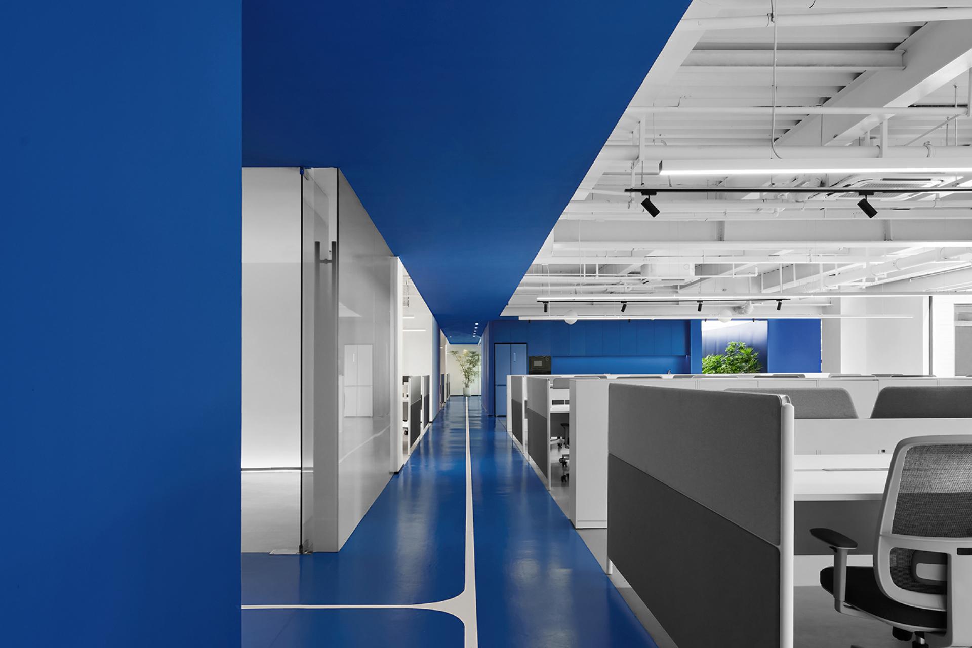品牌色在齐物科技品牌视觉创达中起到核心作用,作为空间的主题色齐物蓝,发挥色彩冷静、专注、智慧的视觉情感应用于空间设计中。