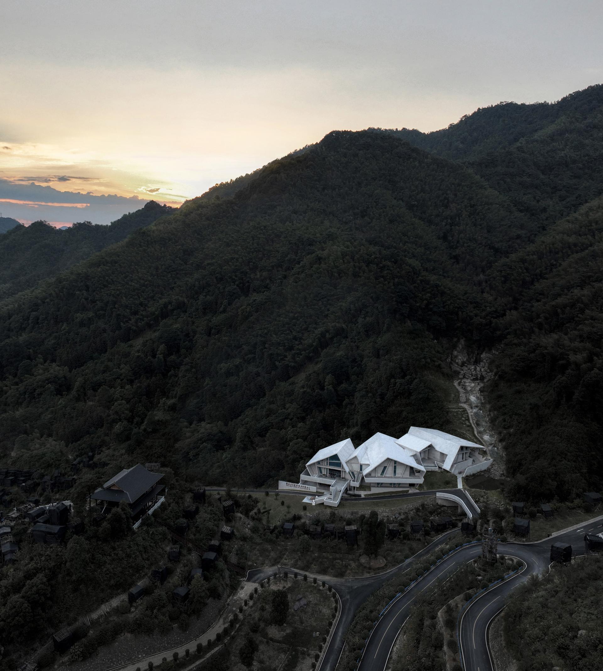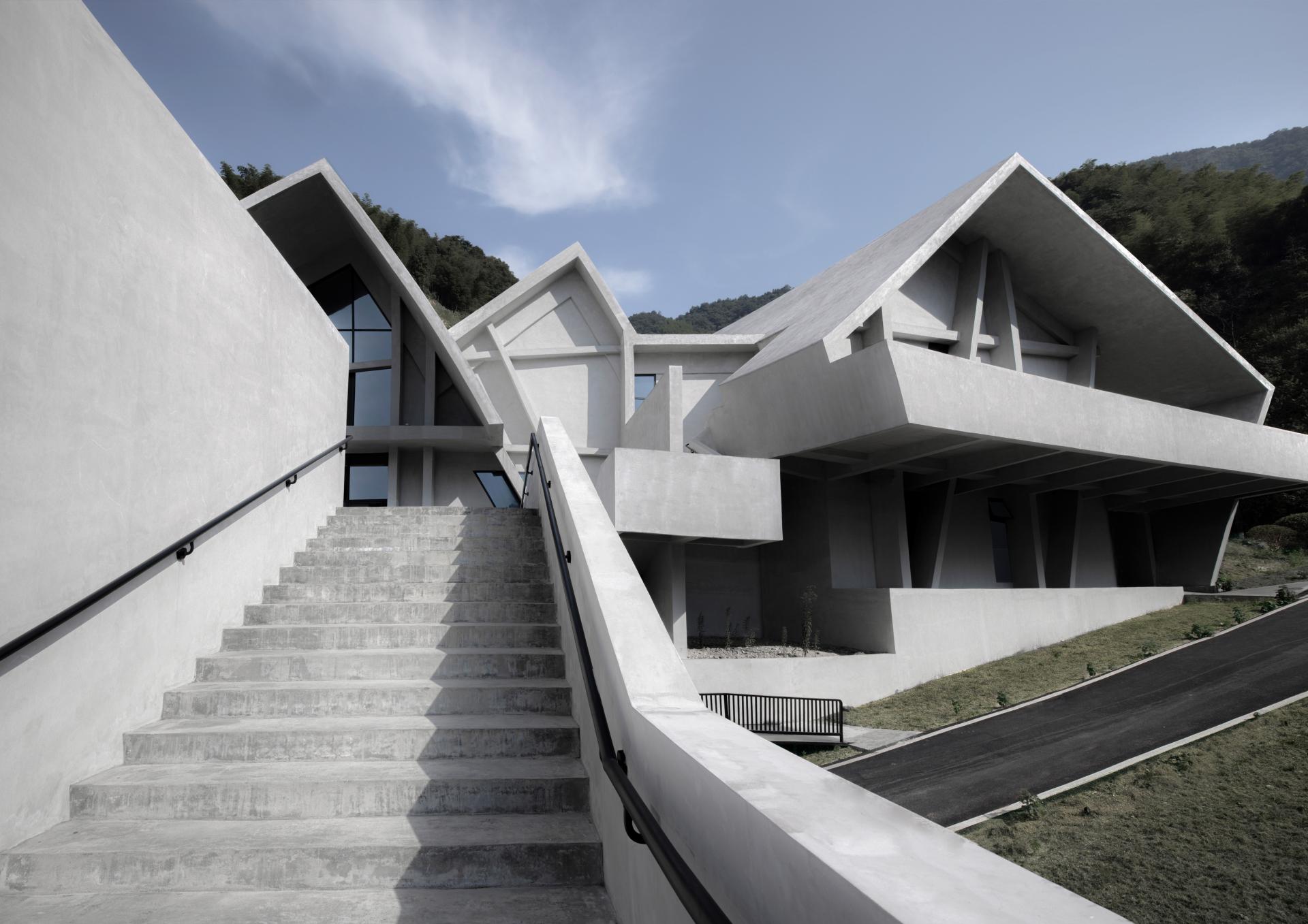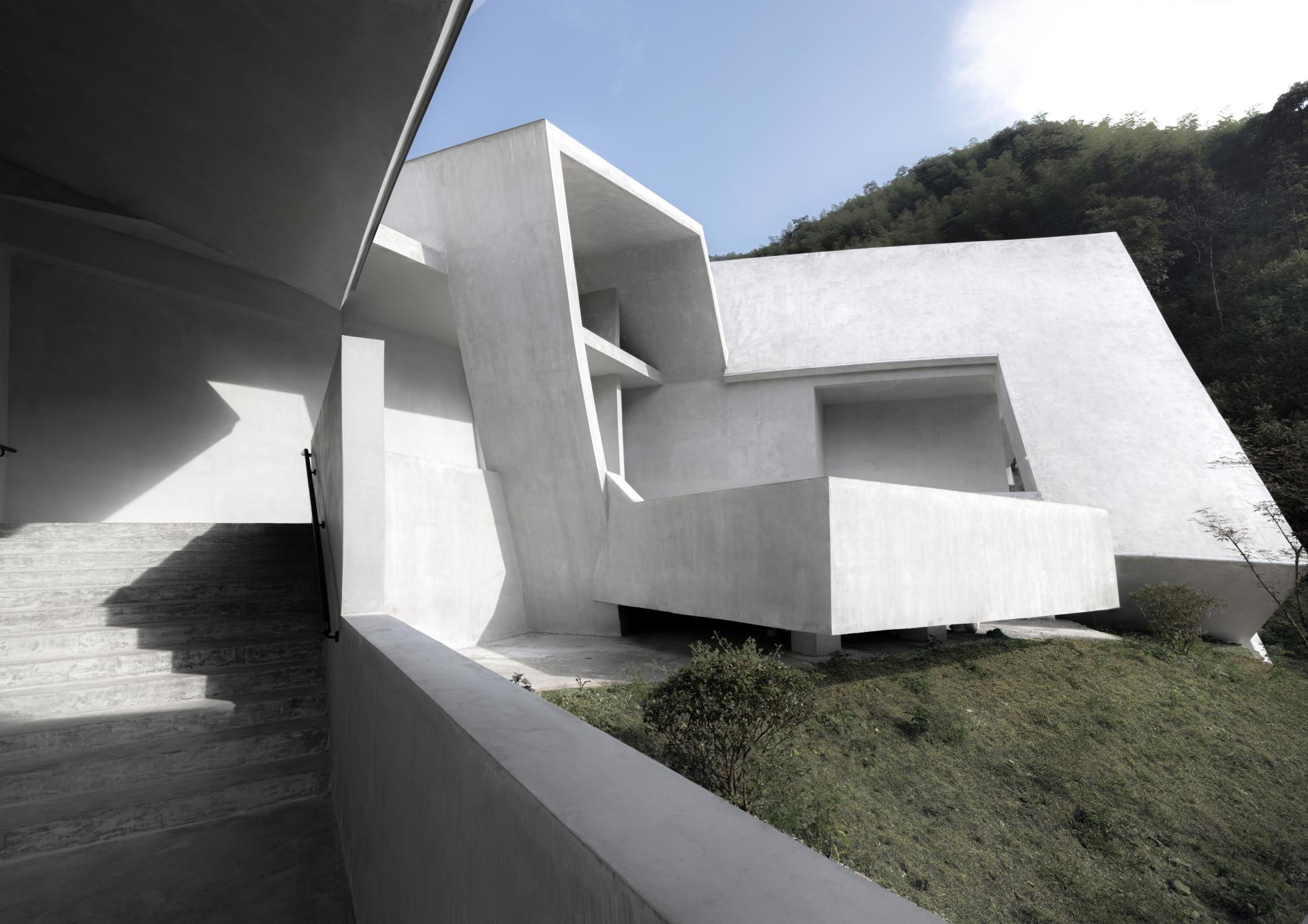 The building falls along the mountain, fully integrating with the terrain, and stands in the scenic area with the momentum of leaning against the mountain and facing the water. Considering the humidity and landslide risks in the mountainous area, the building slightly intervenes into the mountain in the form of a stilt house. Floor-to-ceiling glass is used at the entrance to maximize the introduction of scenery, while long vertical windows are opened in the exhibition area to blur the boundaries between indoor and outdoor. The art gallery breaks and fragments the building volume, eliminates its scale difference, and blurs the site division with the mountain and stream.