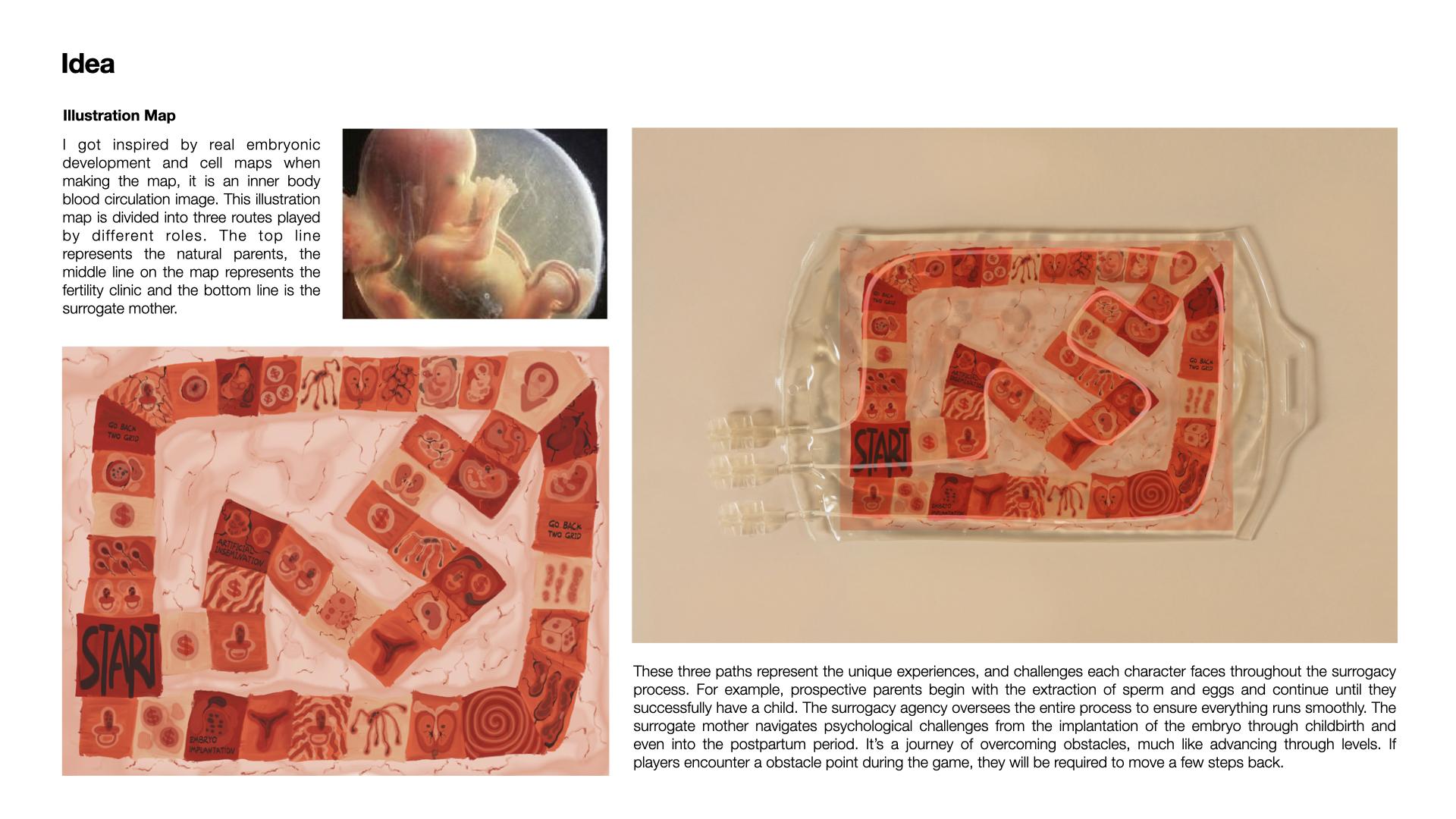 This project is a broad game themed around surrogacy, a controversial topic with no absolute right or wrong, allowing for diverse opinions. The surrogate mother plays a crucial role in this arrangement, making financial gains while her body is exploited. The game aims to express the relationships between natural parents, fertility clinics, and surrogate mothers, exploring the perspective of the surrogate during the process as a profit-driven experiment for the upper class and humanities. Numerous ethical questions arise regarding surrogacy. Many view it as a social justice issue, arguing that it exploits women in developing countries, whose wombs are commodified to satisfy the reproductive needs of wealthier individuals. While some contend that surrogacy offers a vital source of income for impoverished women, critics highlight that the lack of legislation in these countries often allows profits to flow to middlemen and agencies rather than to the surrogate mothers themselves.So this game mainly aim at express the relationship between natural parents, fertility clinic and the surrogate mother as the angle of a surrogate mother during a surrogate process, it is a profit- driven experiment for upper-class and humanities.