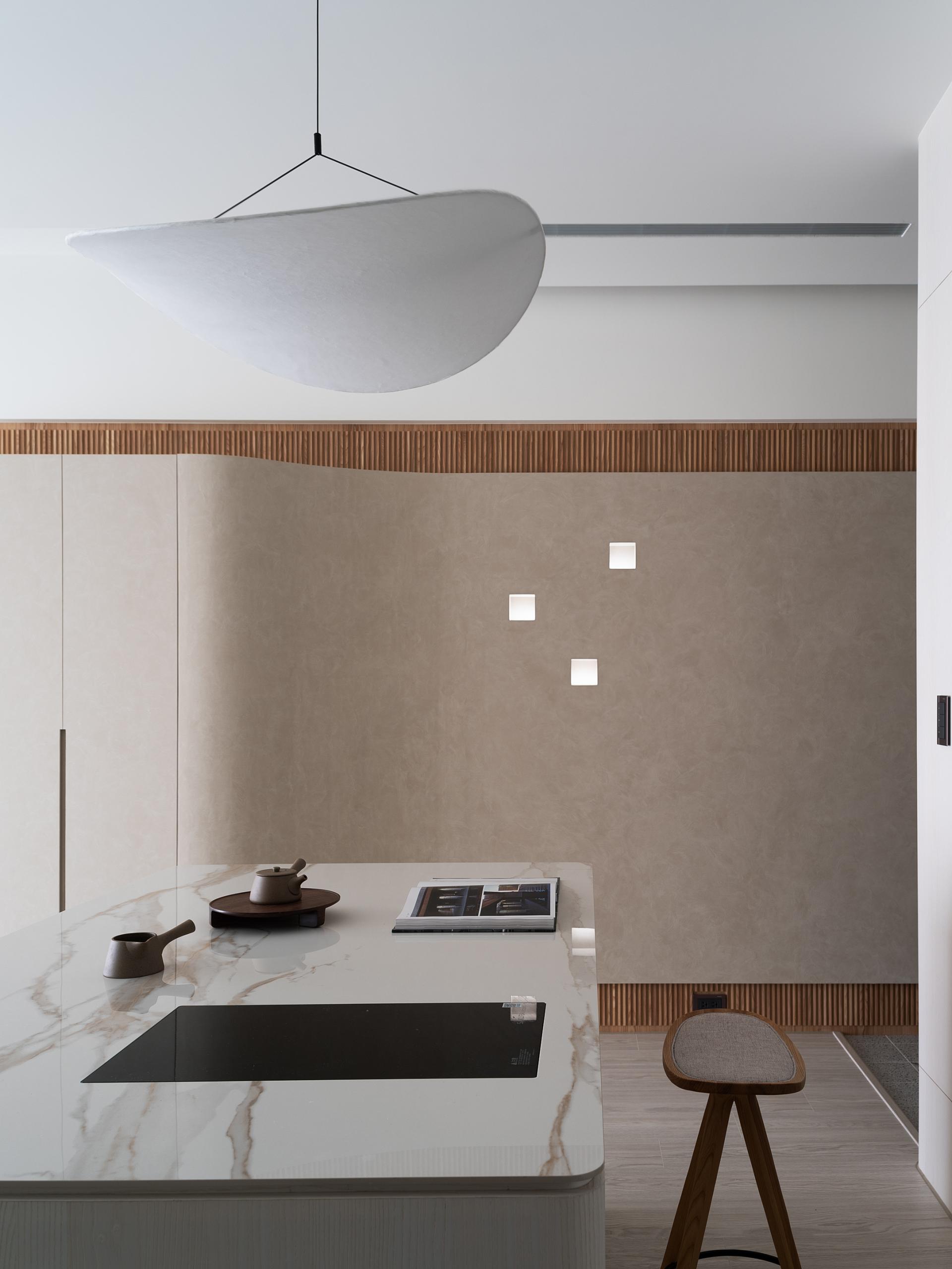 The fast pace of modern life can bring about anxiety and stress. Therefore, the core concept of this project is to promote a sense of calm and tranquility for the residents. This is achieved through the use of soft colors and lines, as well as the incorporation of natural light and shadow to create a comfortable and peaceful atmosphere. Additionally, the designer has implemented a concealed cabinet configuration and ergonomic furniture layout to optimize space usage and provide convenient functionality for the occupants.