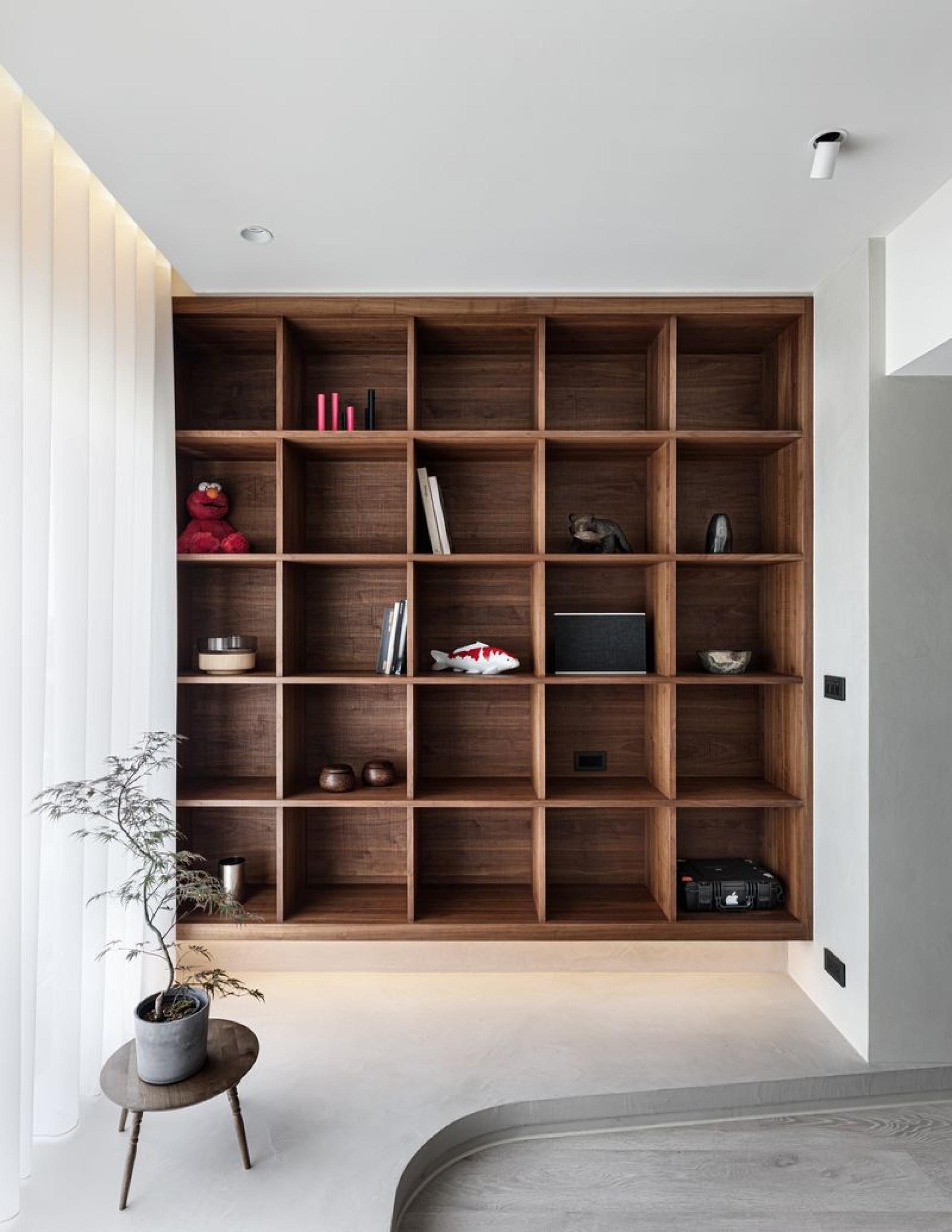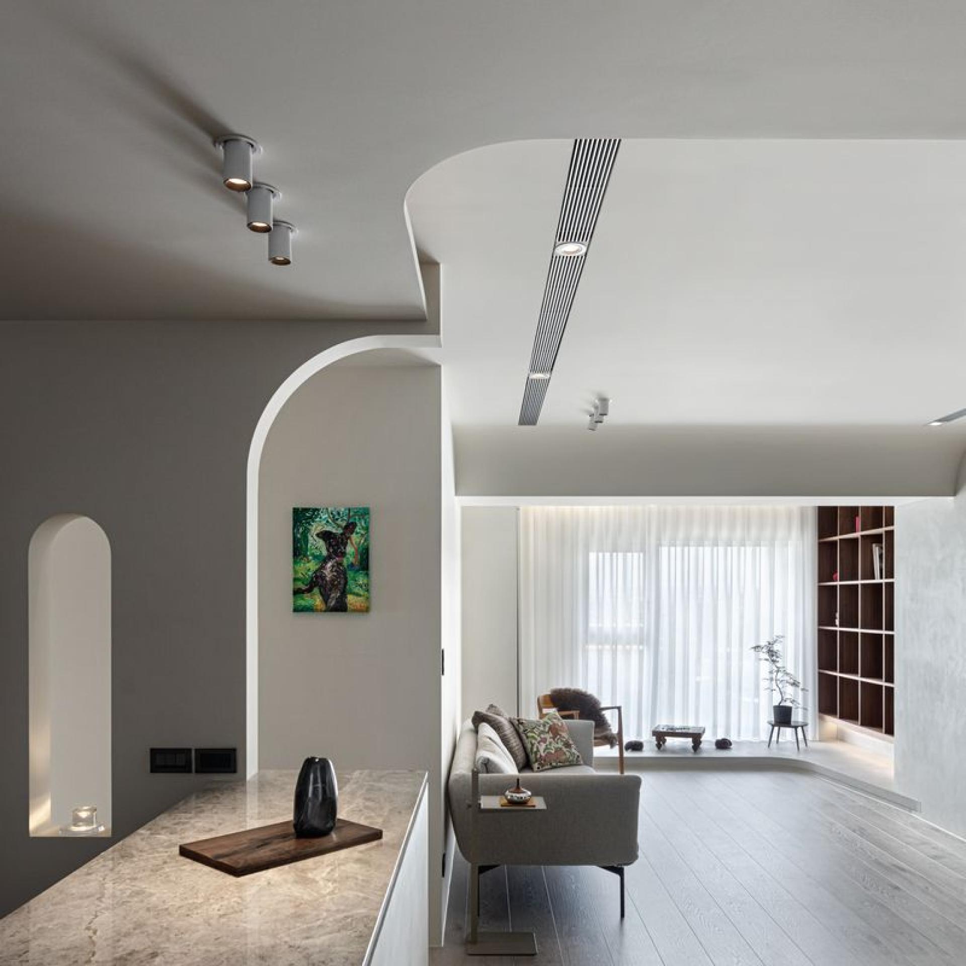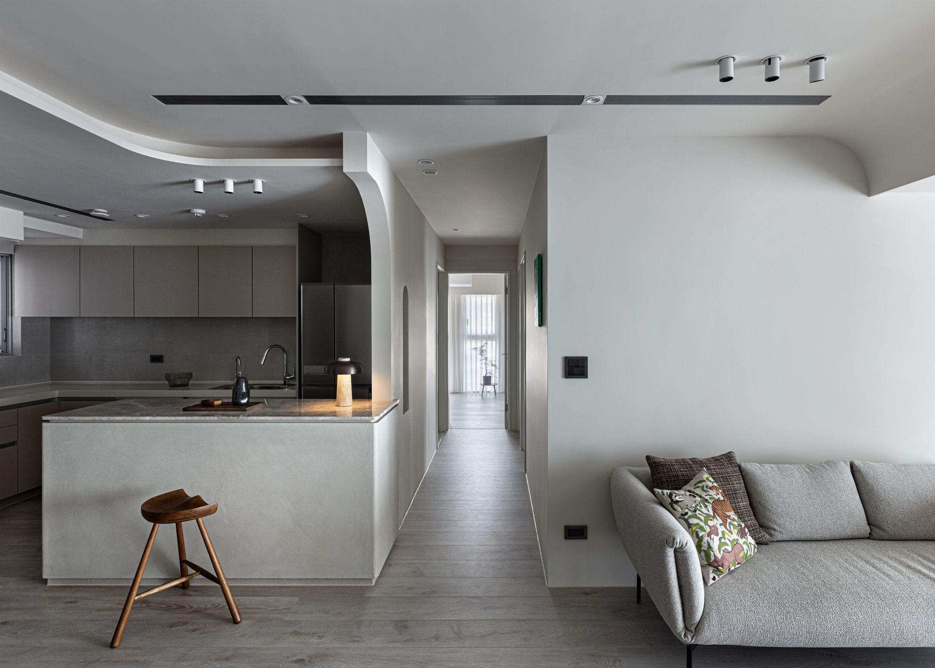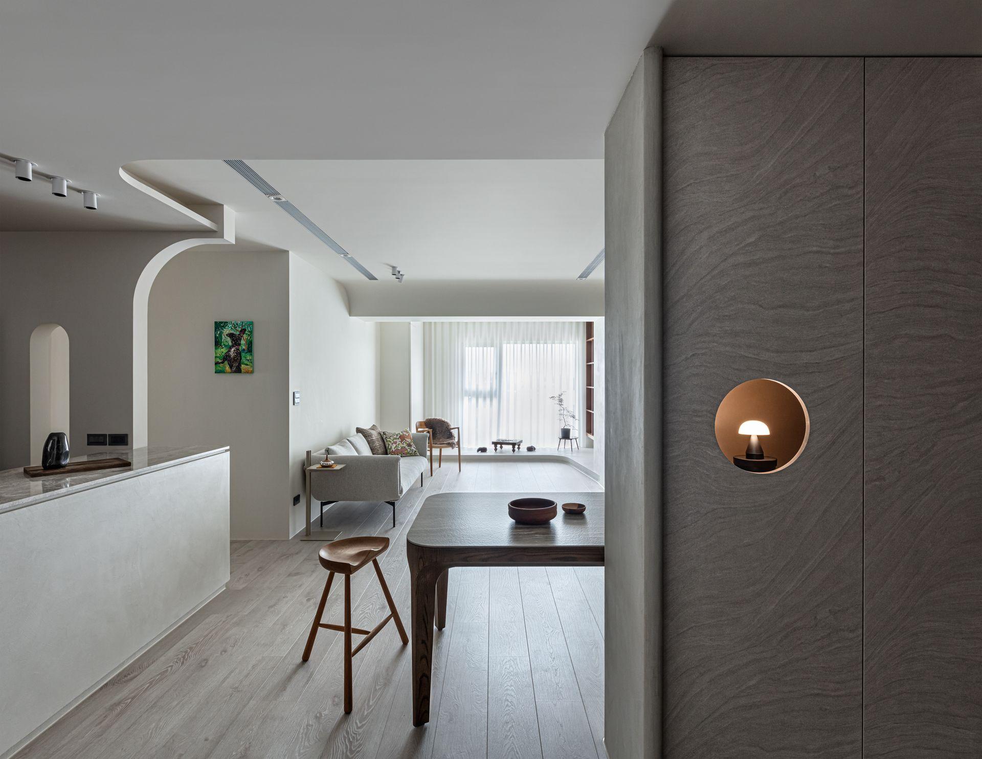 The essence of the space lies in the purity of its design. Stripped of superfluous opulence, the design embraces the beauty of natural light and materials, using textures and colors to define the space. Open layouts and curved motifs seamlessly connect different areas, enhancing the tranquility and comfort of daily life. By integrating cultural elements and the interplay of light and shadow, the design exudes a refreshing, artistic ambiance, highlighting a serene and elegant living environment. The entire space is enveloped in a specially formulated coating, evoking a soft, understated texture reminiscent of subtle gray clay, embodying a sense of understated elegance. This careful choice of materials reveals the home's rustic charm and humanistic qualities. Moreover, a custom metal display rack, crafted with artistic techniques incorporating acrylic materials, infuses the space with a minimalist yet artistic flair, serving as a distinctive visual focal point that enhances the overall design narrative. The open-plan design harmoniously connects the living room, dining area, and kitchen into an interactive and versatile space. A reading nook is thoughtfully placed adjacent to the living room, featuring expansive open shelving that provides ample storage and display opportunities. The use of natural wood veneers adds a warm and inviting atmosphere, creating a cozy and intimate spatial narrative.