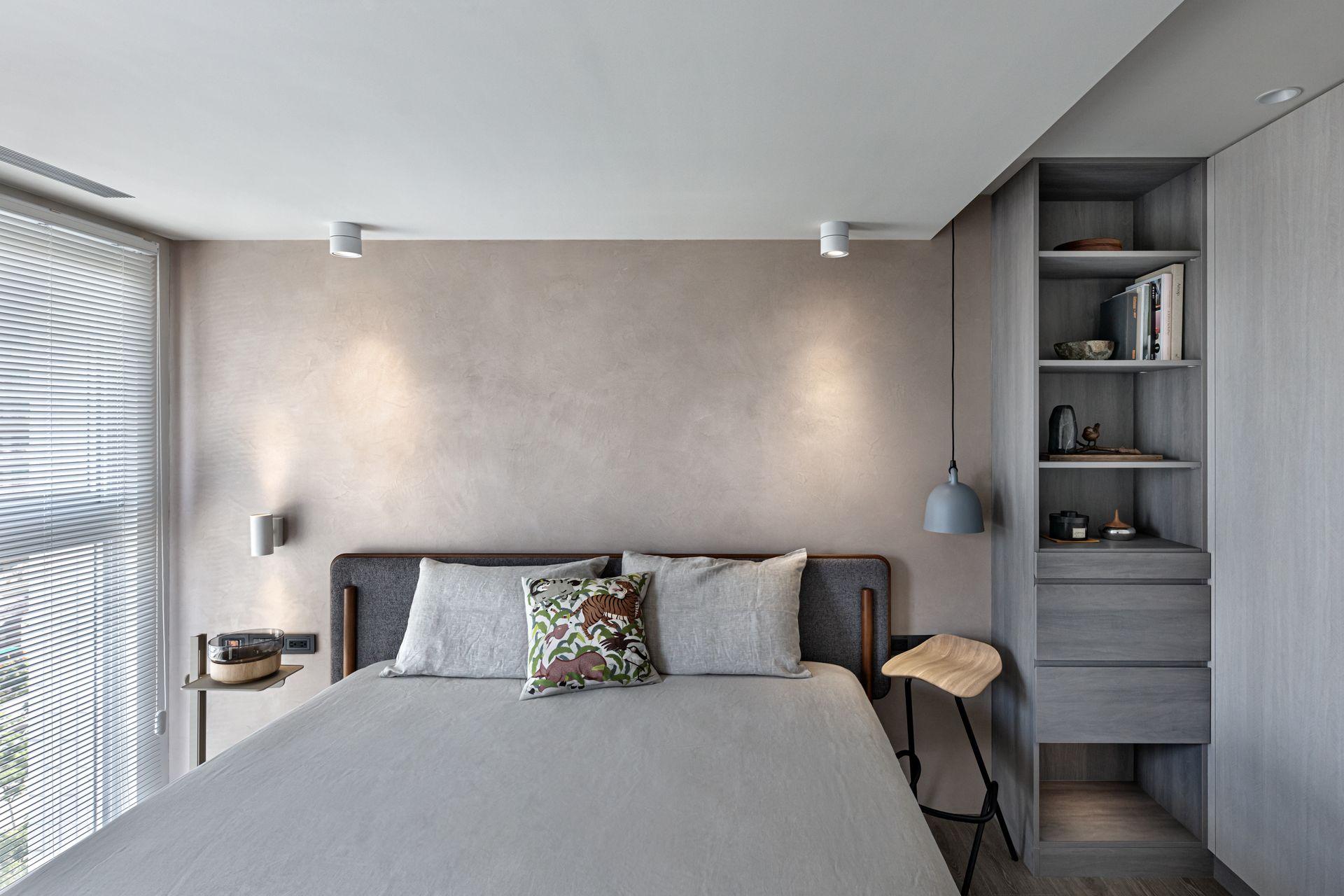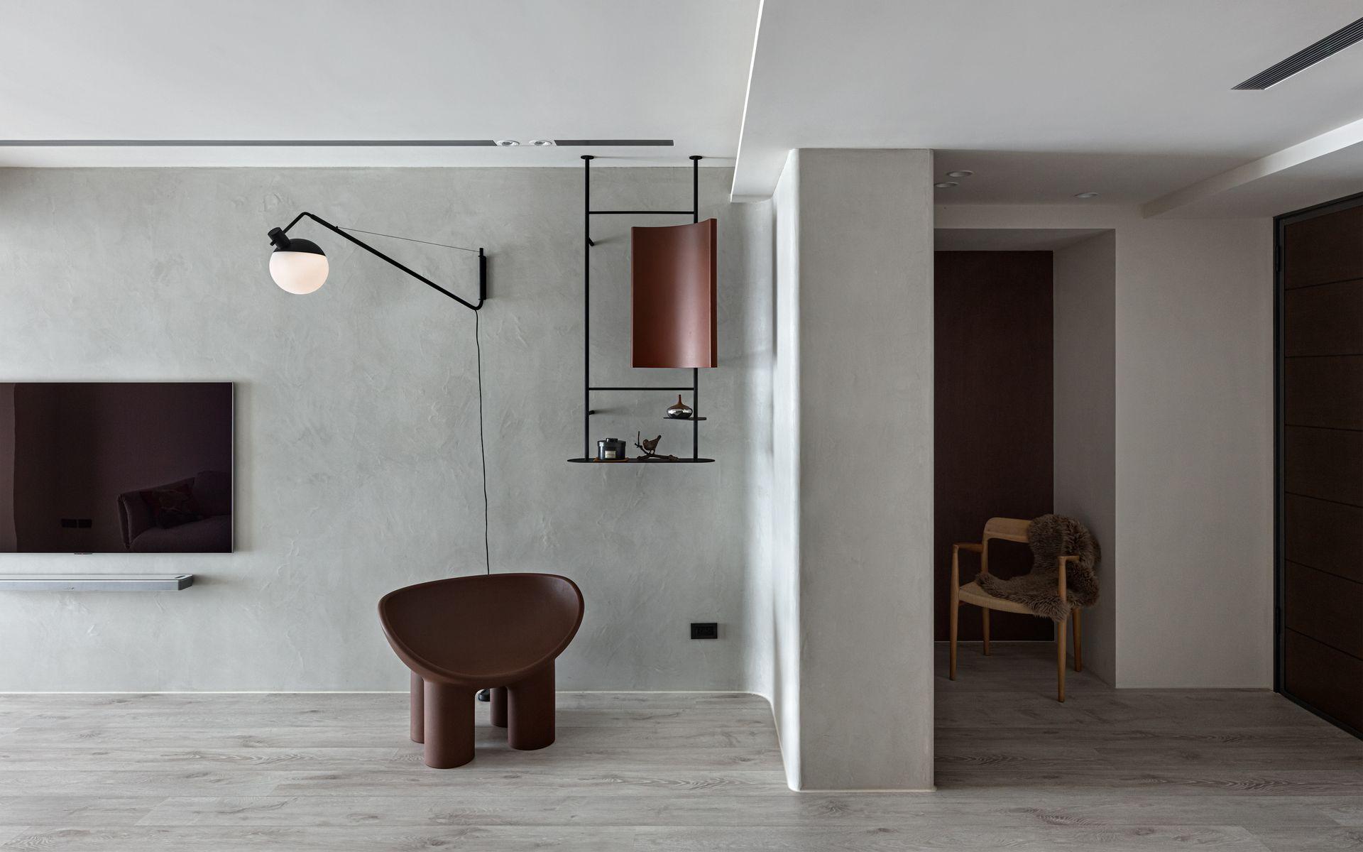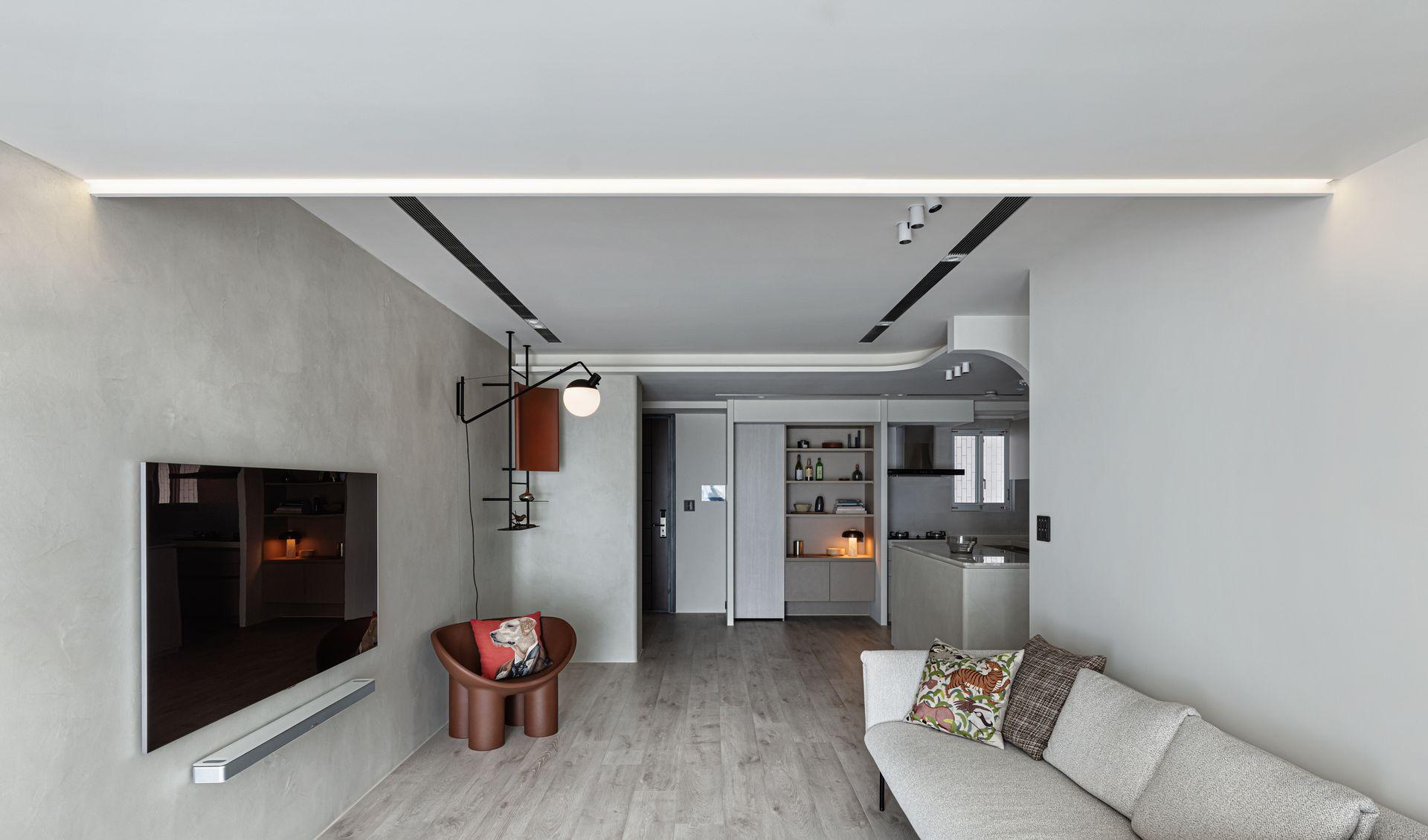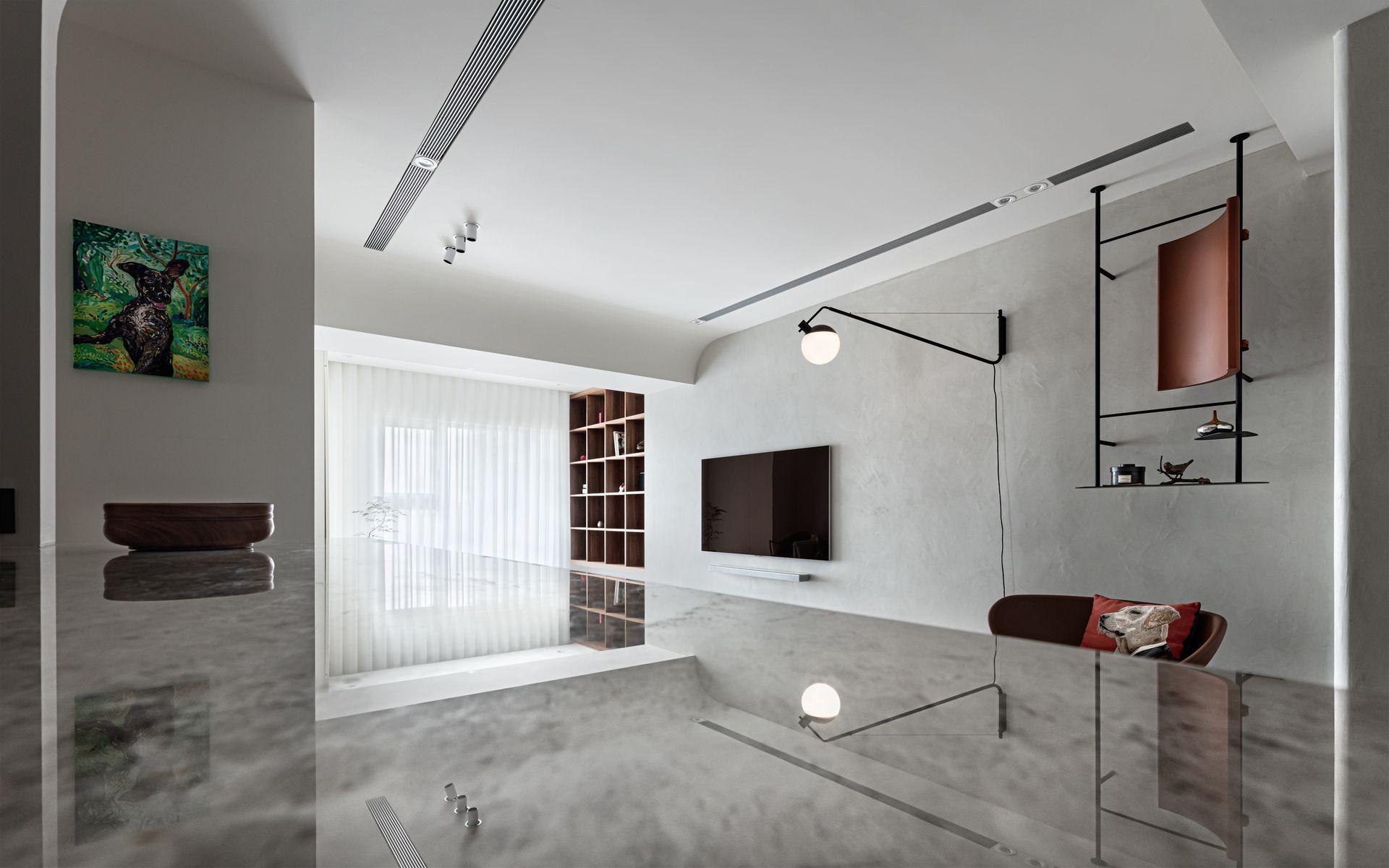 The essence of the space lies in the purity of its design. Stripped of superfluous opulence, the design embraces the beauty of natural light and materials, using textures and colors to define the space. Open layouts and curved motifs seamlessly connect different areas, enhancing the tranquility and comfort of daily life. By integrating cultural elements and the interplay of light and shadow, the design exudes a refreshing, artistic ambiance, highlighting a serene and elegant living environment. The entire space is enveloped in a specially formulated coating, evoking a soft, understated texture reminiscent of subtle gray clay, embodying a sense of understated elegance. This careful choice of materials reveals the home's rustic charm and humanistic qualities. Moreover, a custom metal display rack, crafted with artistic techniques incorporating acrylic materials, infuses the space with a minimalist yet artistic flair, serving as a distinctive visual focal point that enhances the overall design narrative. The open-plan design harmoniously connects the living room, dining area, and kitchen into an interactive and versatile space. A reading nook is thoughtfully placed adjacent to the living room, featuring expansive open shelving that provides ample storage and display opportunities. The use of natural wood veneers adds a warm and inviting atmosphere, creating a cozy and intimate spatial narrative.