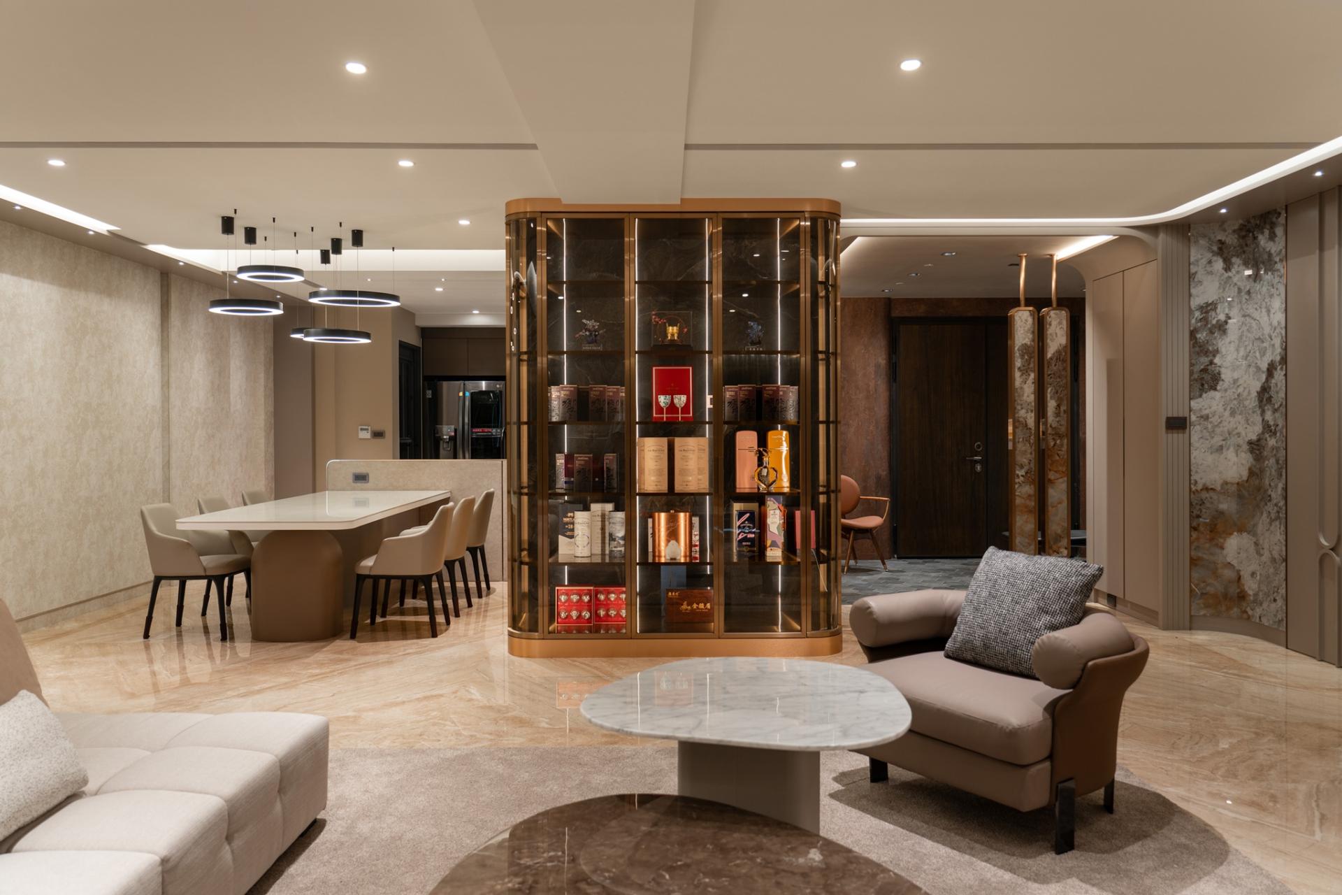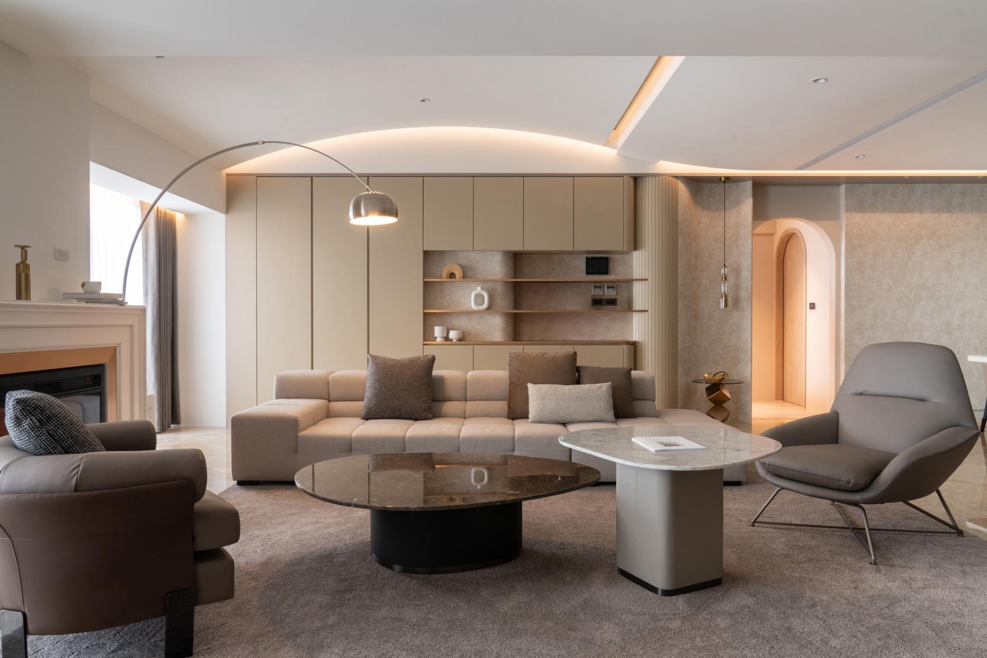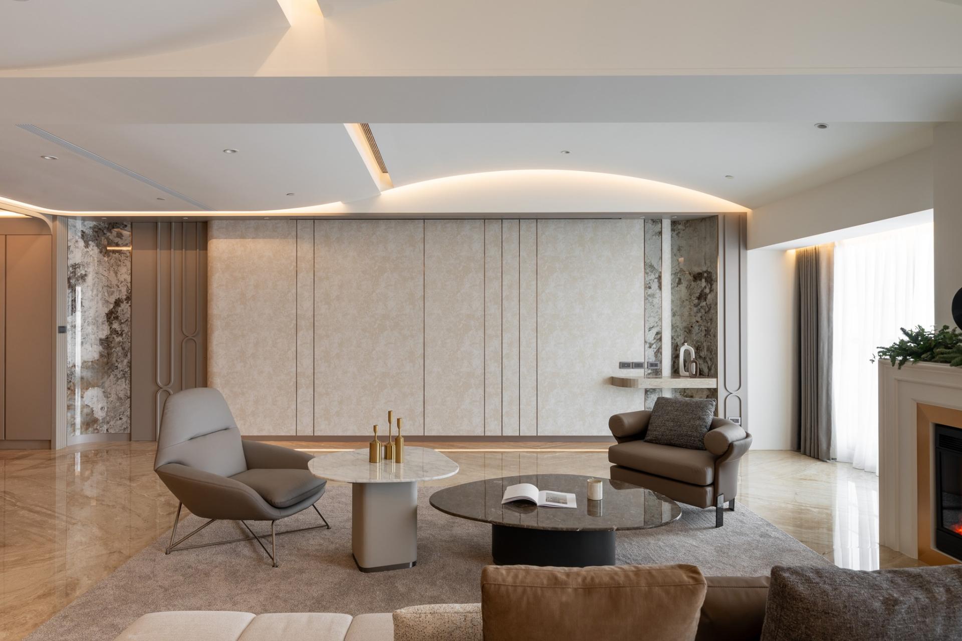 The entrance features a cloakroom in brown color and floor tile in gray, along with a water-shaped chandelier and a wall repeated of an L-shaped design, showing a simple decorative art style to reflect the husband's preference. The dining room is filled with creamy color, and the texture of the wallpaper reflects the warm and unadorned texture of wabi-sabi. The two rounded corners of the TV wall are curved with PATAGONIA tiles, minimum showing the luxury craftsmanship of Art Deco.