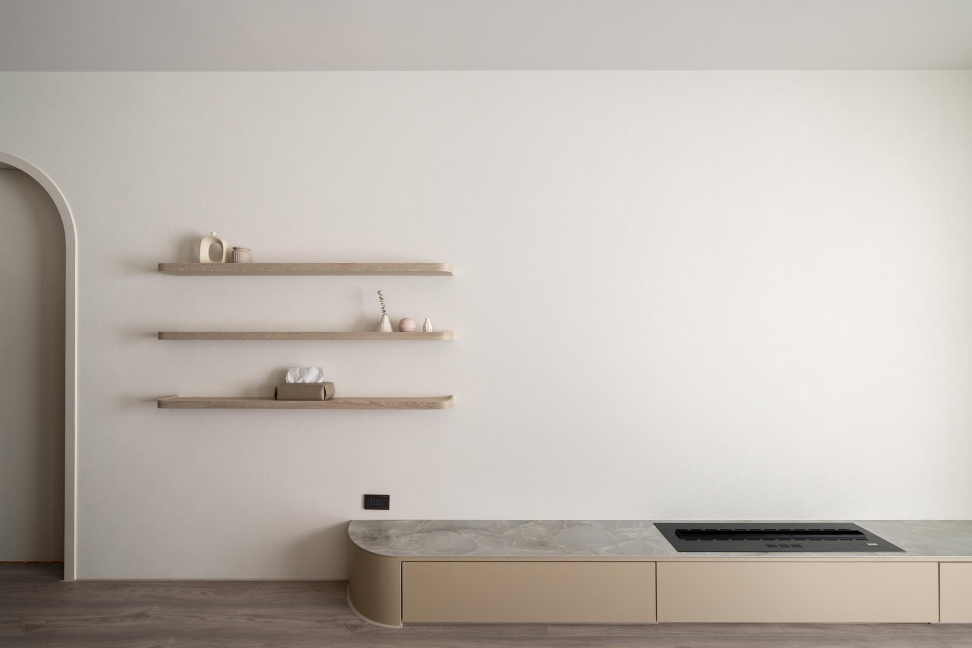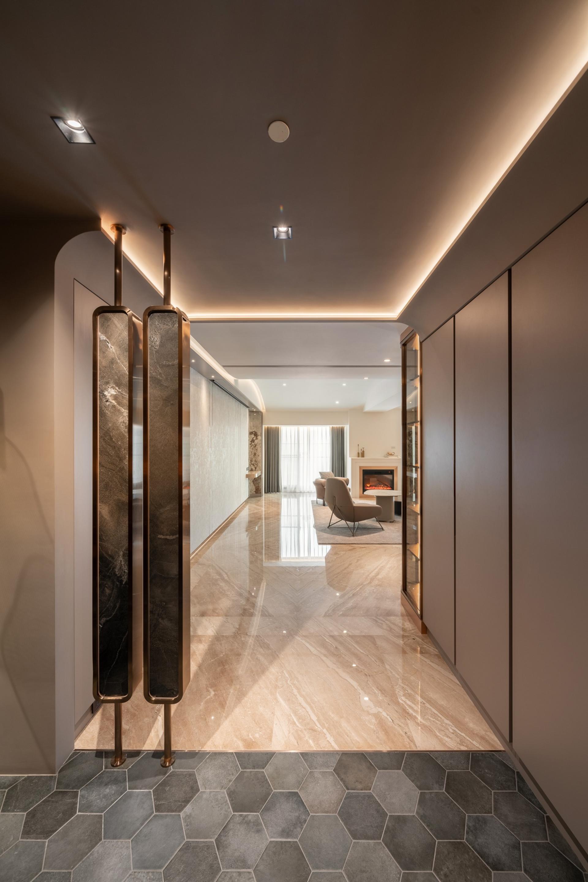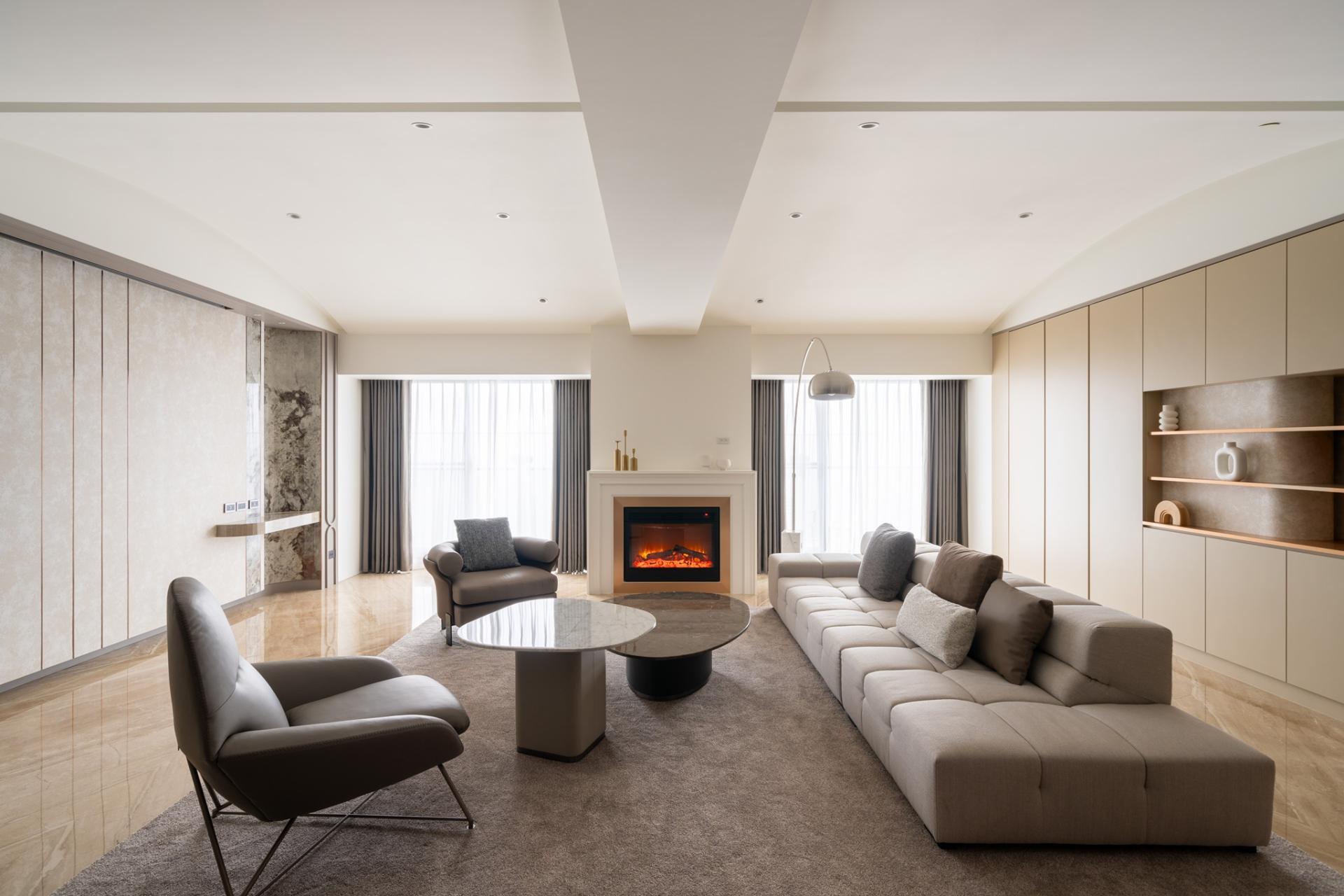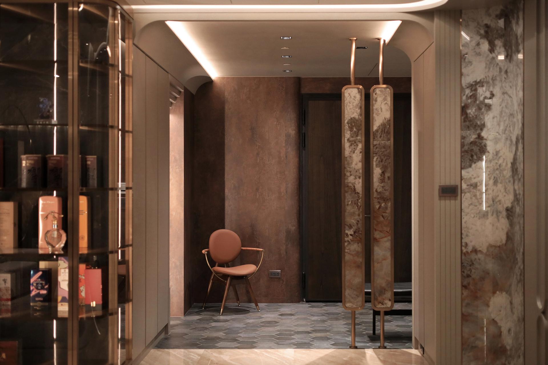 The entrance features a cloakroom in brown color and floor tile in gray, along with a water-shaped chandelier and a wall repeated of an L-shaped design, showing a simple decorative art style to reflect the husband's preference. The dining room is filled with creamy color, and the texture of the wallpaper reflects the warm and unadorned texture of wabi-sabi. The two rounded corners of the TV wall are curved with PATAGONIA tiles, minimum showing the luxury craftsmanship of Art Deco.
