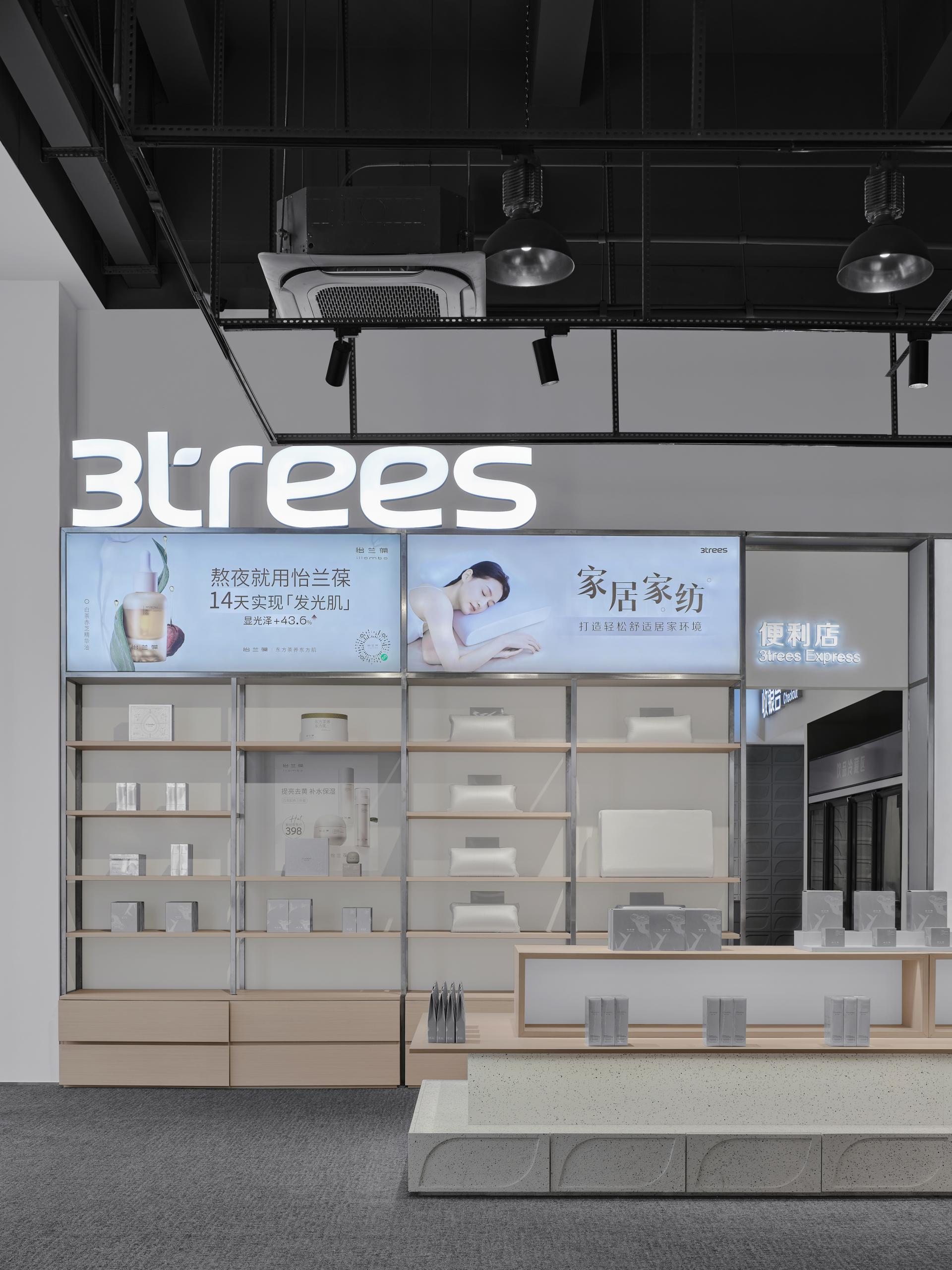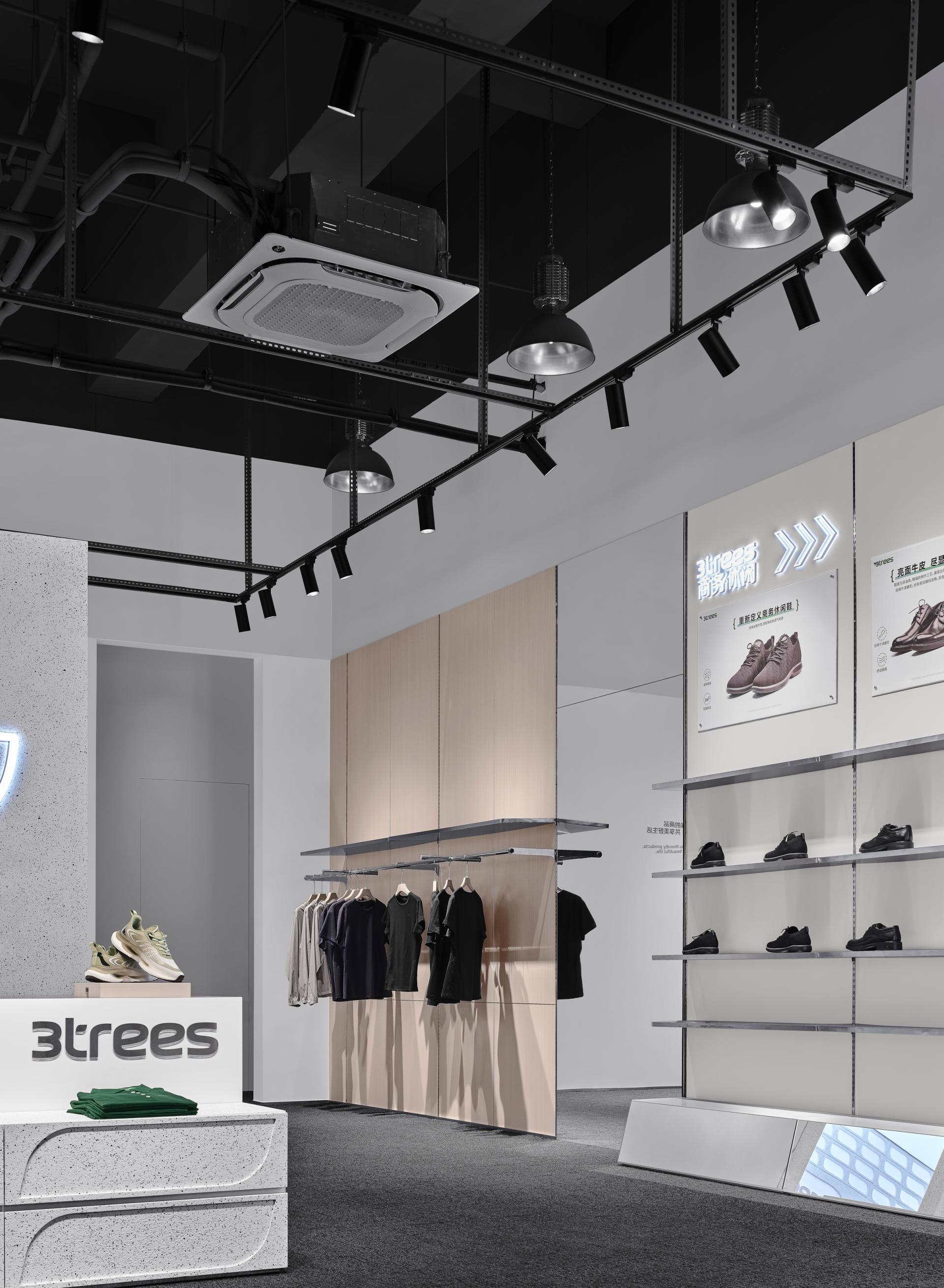 In terms of spatial design, the 3TREES Beautiful Life Experience Hall meticulously incorporates the minimalist concept of 'less is more' to craft a simple, yet fashion-forward and dynamic brand art space. The experience hall adeptly utilises a light gray as the primary tone, not only bestowing the space with an industrial aesthetic and fostering a stylish and delightful shopping ambience but also accentuating the texture and hues of the products showcased within. Furthermore, the brand's signature element of leaves has been cleverly integrated into multiple details, featuring prominently in the delicate details of door handles, hangers, back walls, and other places, effectively showcasing the brand's distinctive allure through the discerning selection and harmonious pairing of shapes and materials. Moreover, the skilful use of a variety of materials and grains, such as art paint and emulsion paint, contributes to enriching the visual depth and aesthetic appeal of the space.