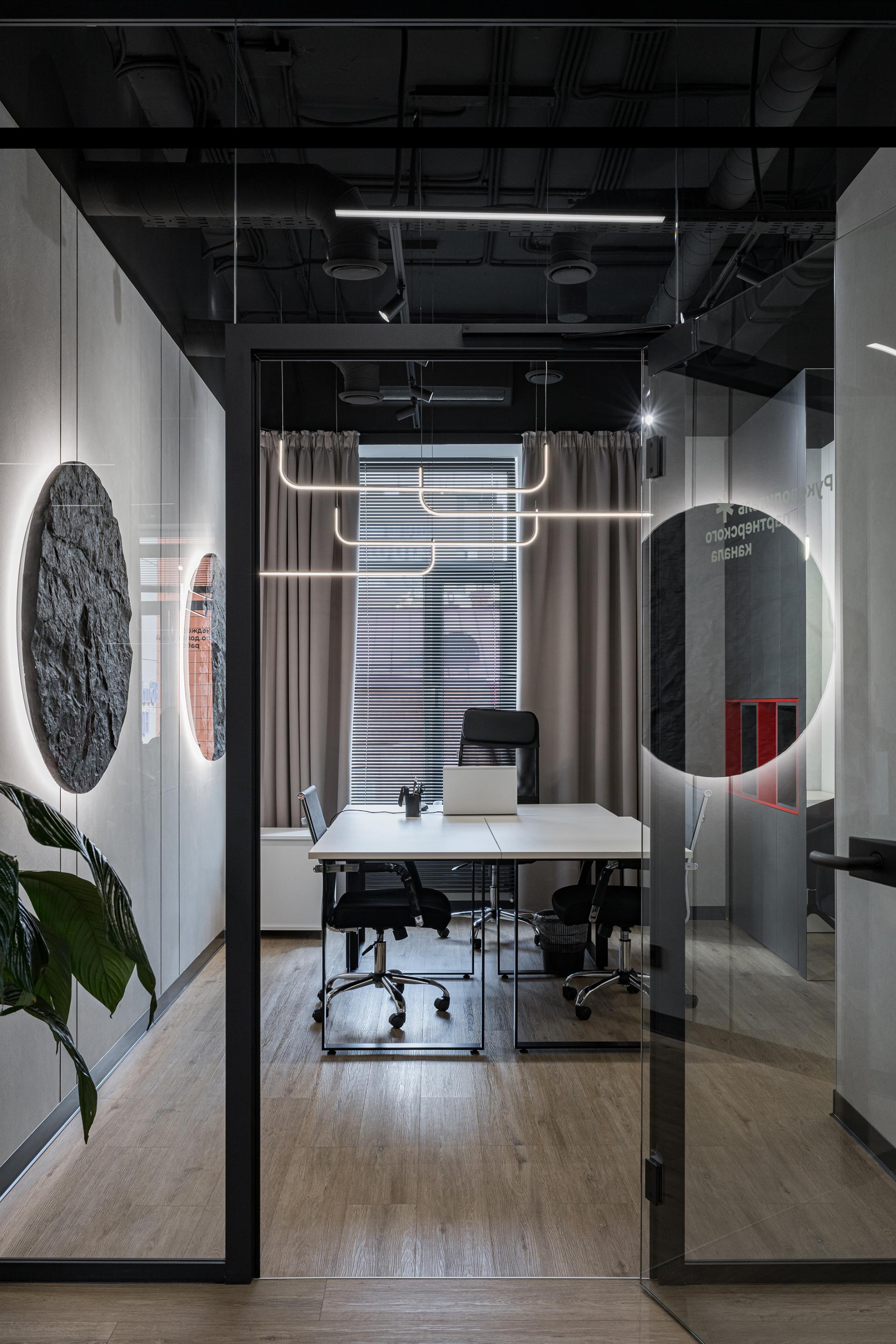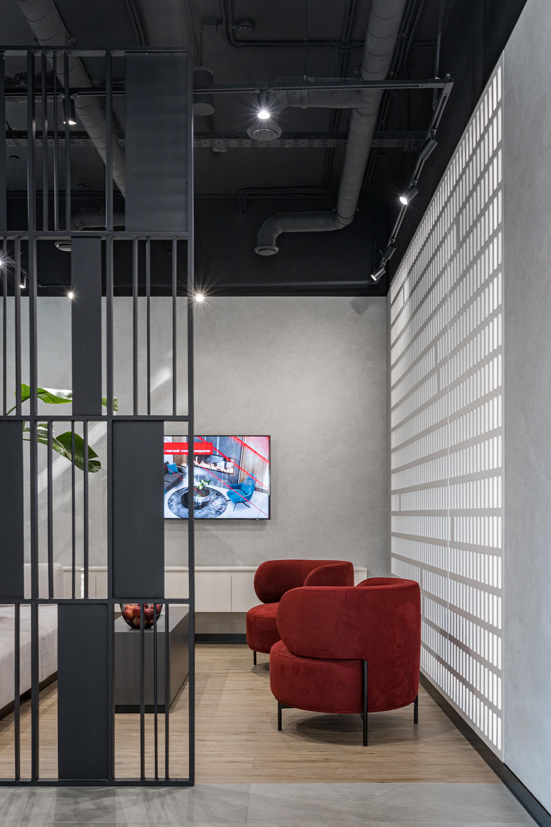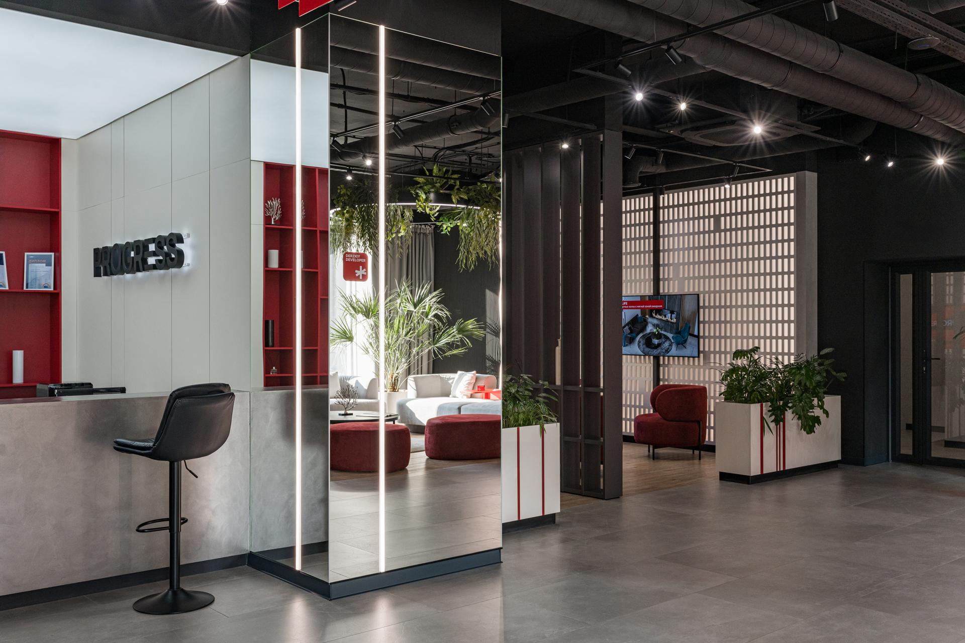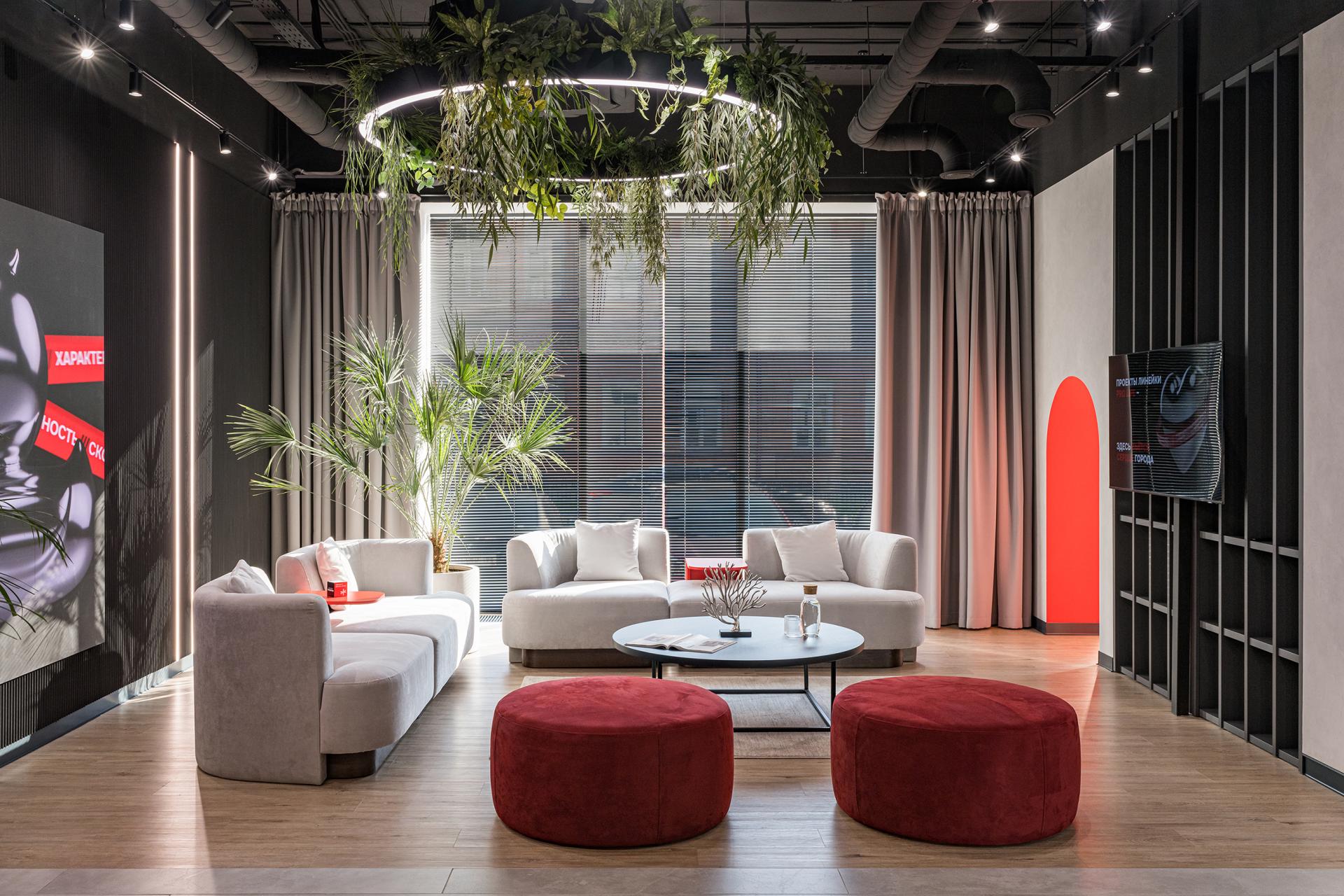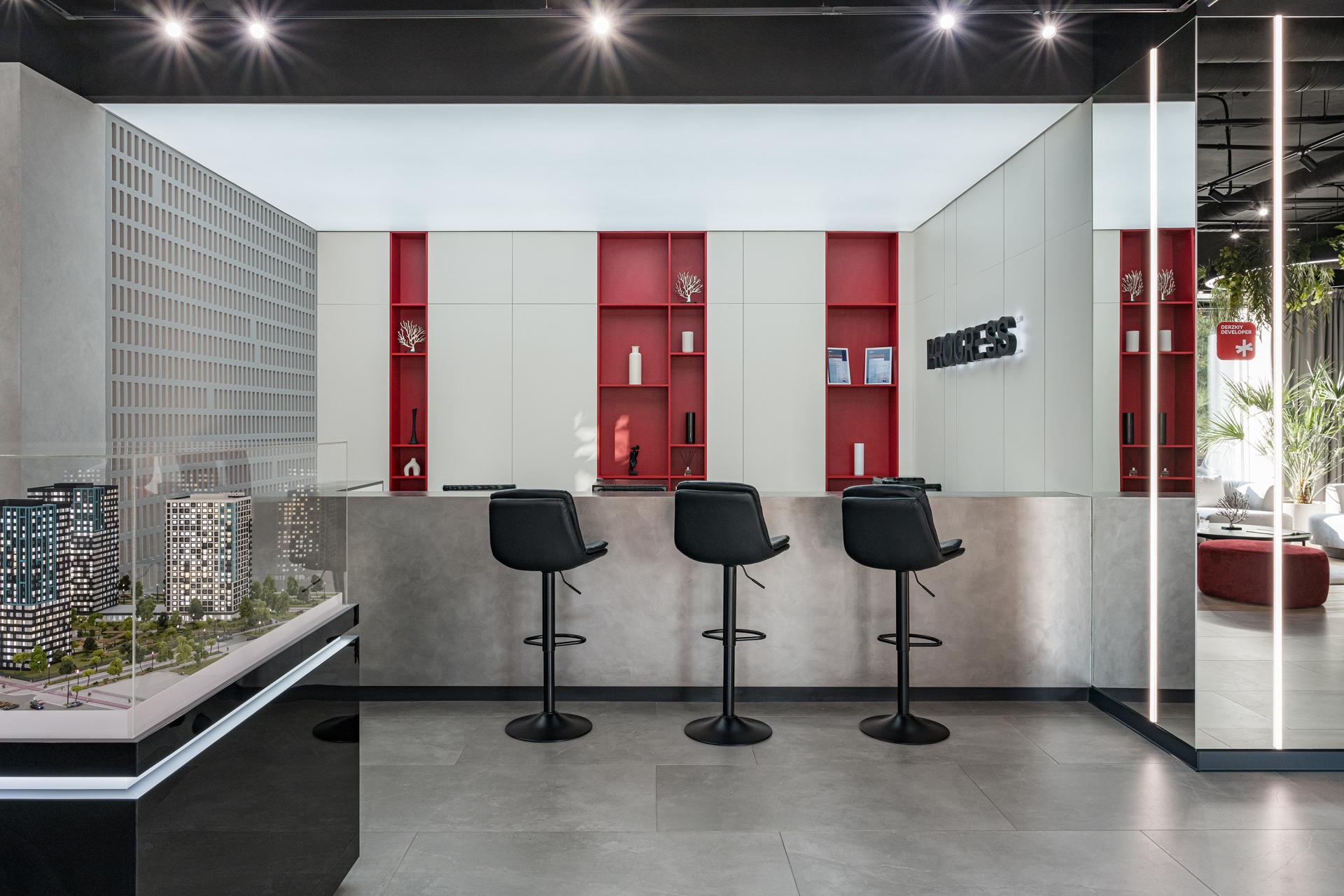The interior design of the developer's sales office is crucial for creating a comfortable and inviting atmosphere for realtors and clients. The primary colors—black, white, and red—reflect the corporate identity while providing a stylish, modern look.