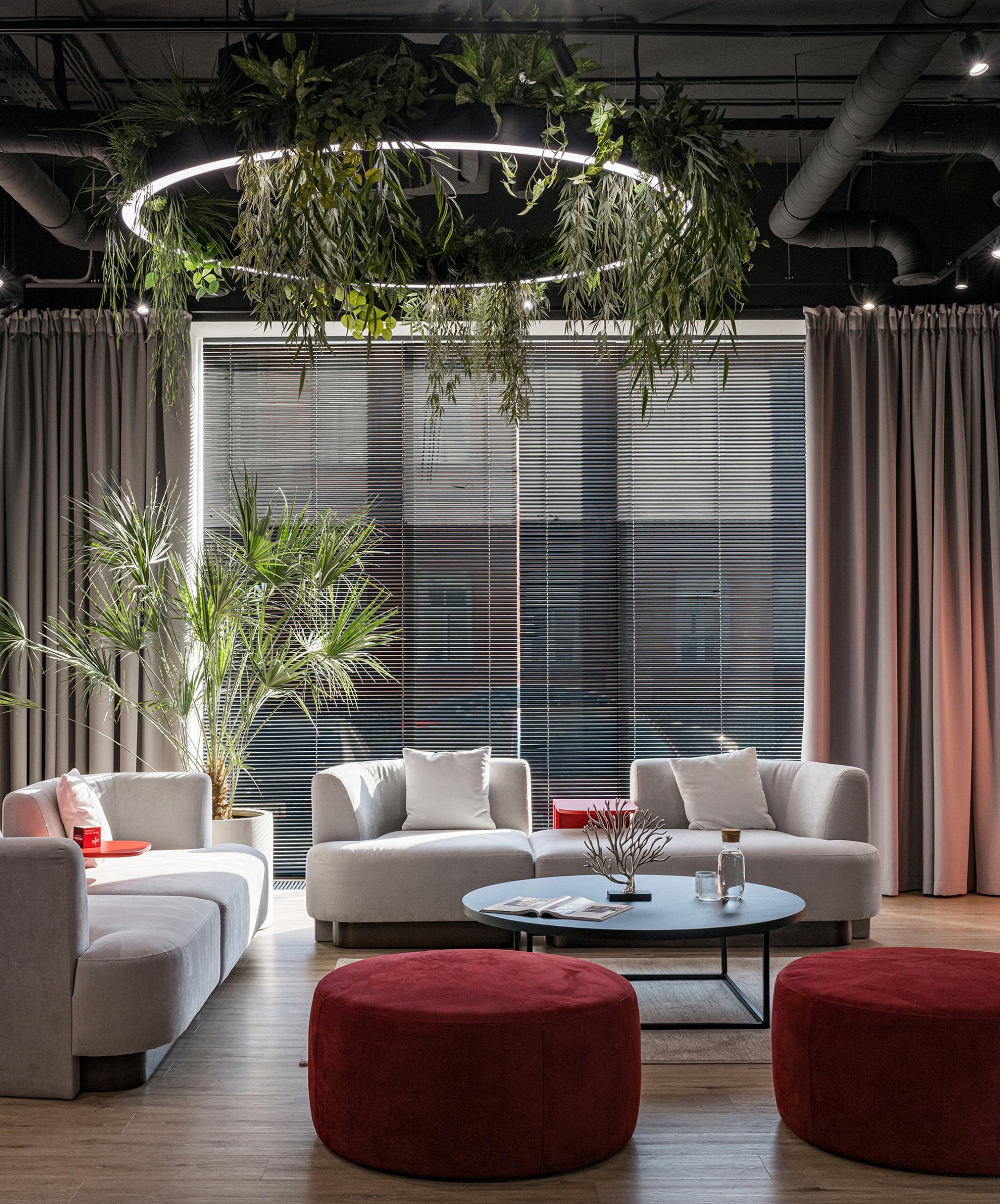 Decorative dividers are used to effectively segment the space and highlight different areas. This organization fosters cozy corners for meetings and discussions, enhancing communication and client comfort.