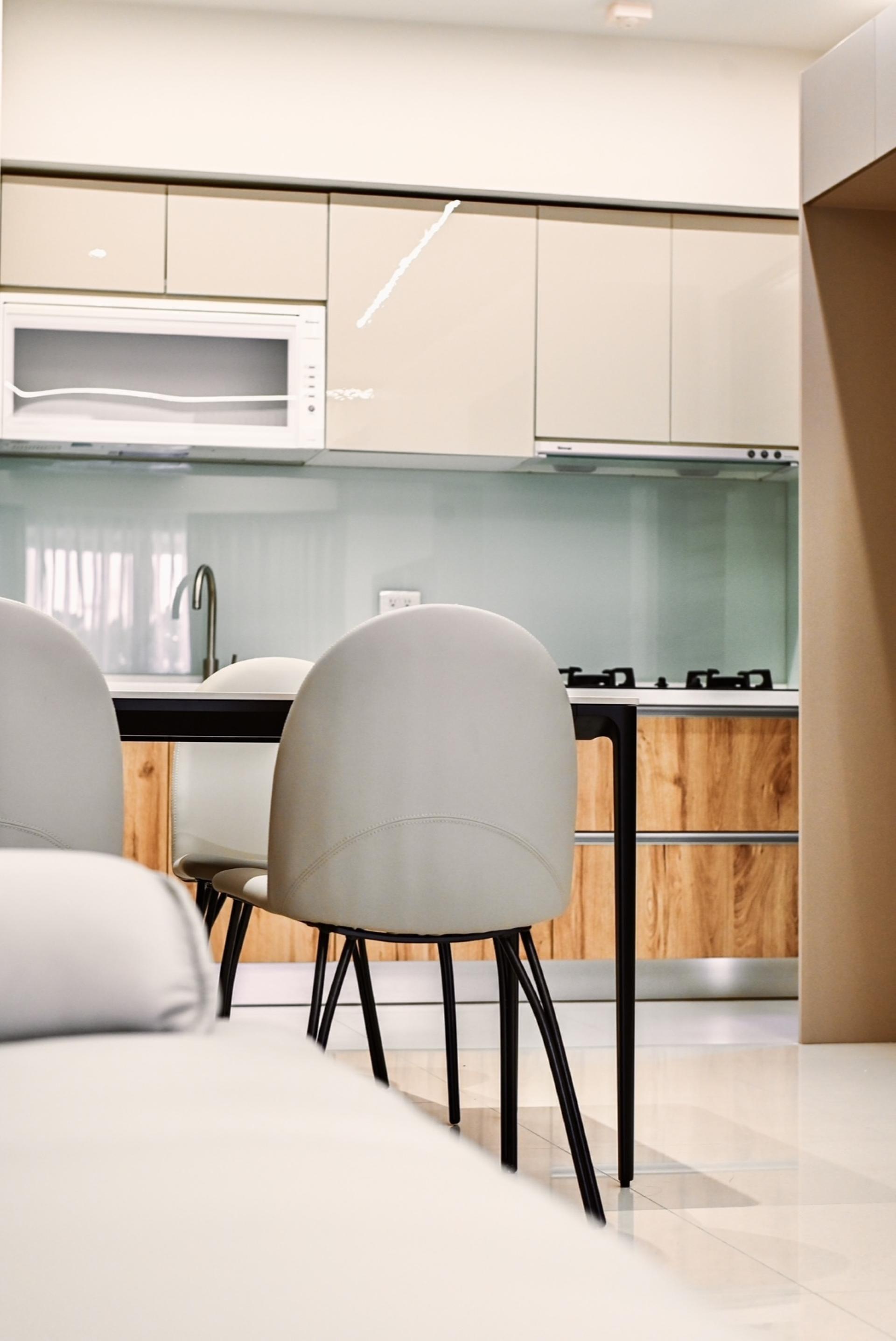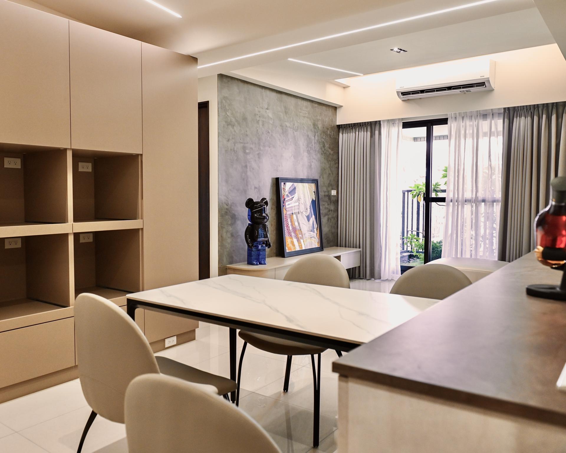 Light refines the mood, with sunlight amplifying the modern elegance of the palette. The minimalist living room, in soft beige hues, includes a feature wall in warm sandalwood tones that complements the vibrancy of balcony plants, ensuring seamless visual continuity. In the adjacent dining area, a bold emerald accent wall introduces energy and contrast. Sandalwood cabinetry adds depth, enriching the palette with an ambiance that feels both intimate and polished.