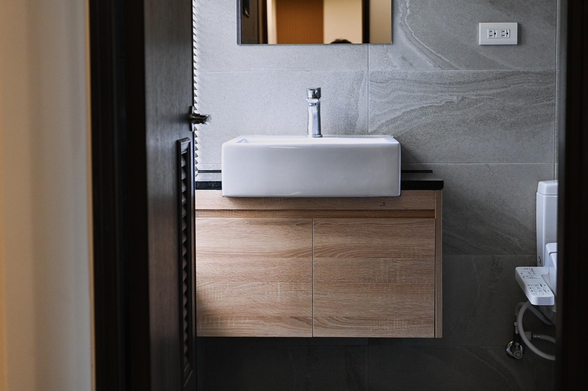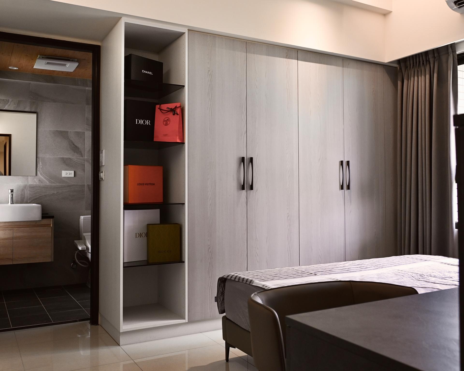 In the master bedroom, the deep iron-gray accent wall echoes the living room, adding depth and calm. Marble and wood bring texture, while soft off-white elements provide contrast, enhancing the serene character of the space. This interplay of colors and materials ties the room to the living area while introducing subtle variety across the home.