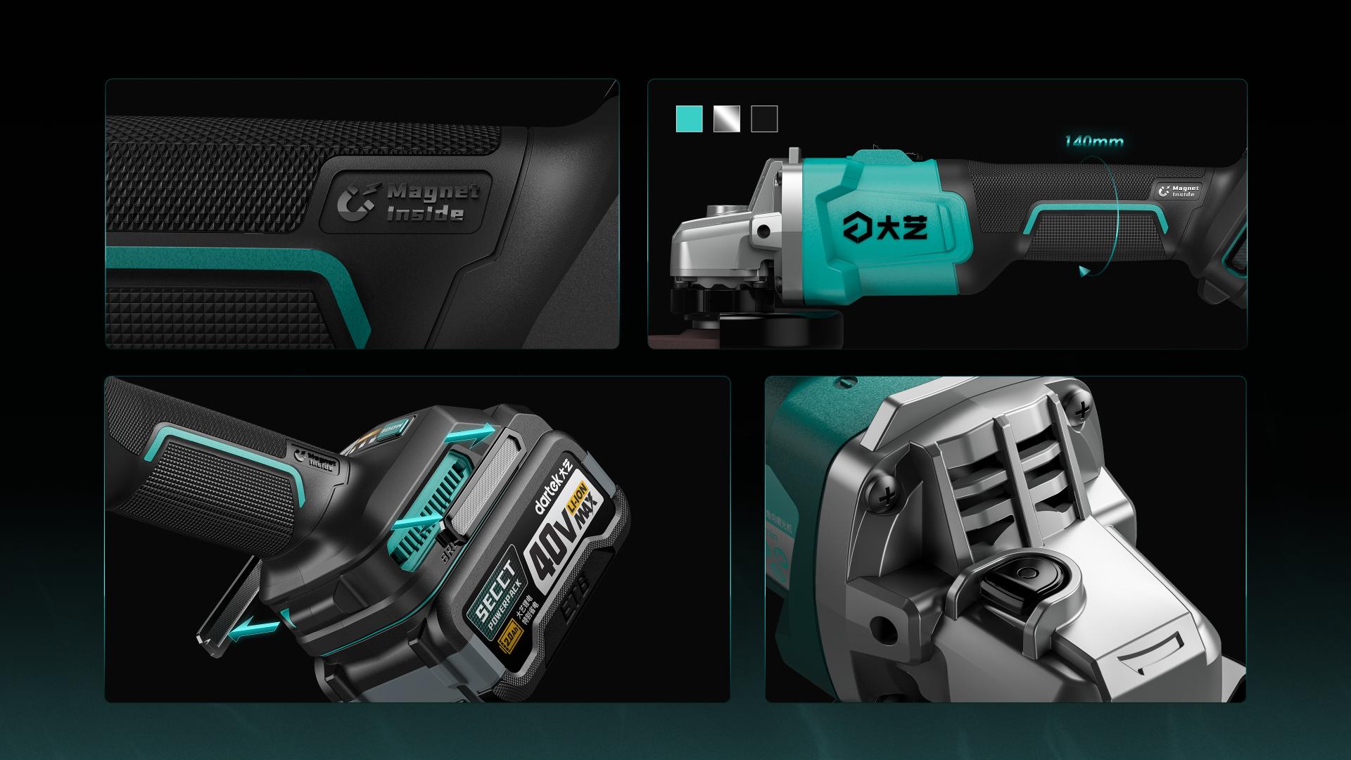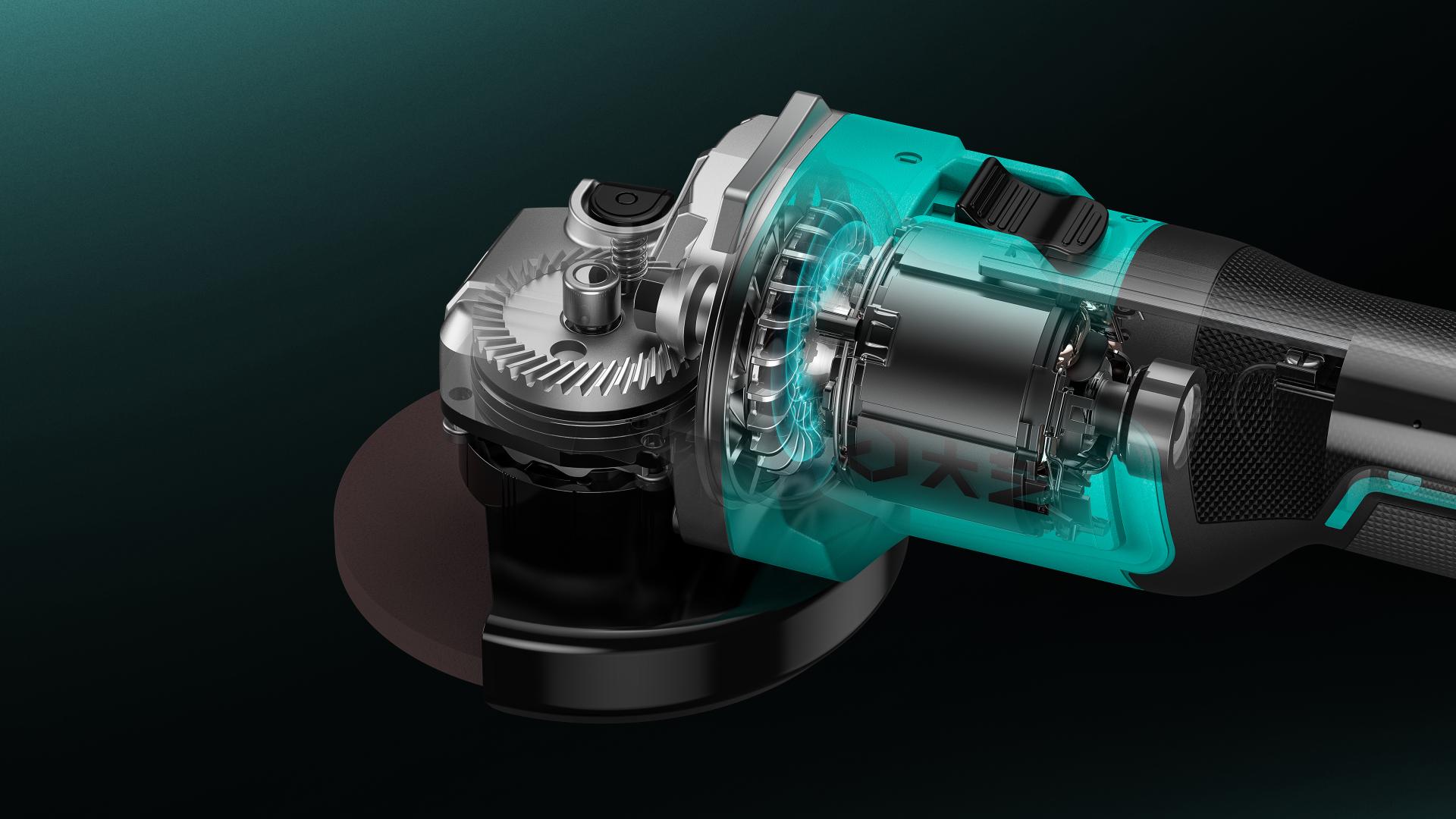 The product’s body design draws inspiration from the cylindrical housing concept traditionally used in AC-powered angle grinders. It features minimal deformation and tight seam handling, resulting in a more refined and aesthetically pleasing appearance. This design not only enhances the visual appeal of the product but also ensures stability of key components during use, reducing issues related to part loosening caused by vibration or prolonged operation, thus making the overall performance more reliable and durable and extending the service life of the machine.