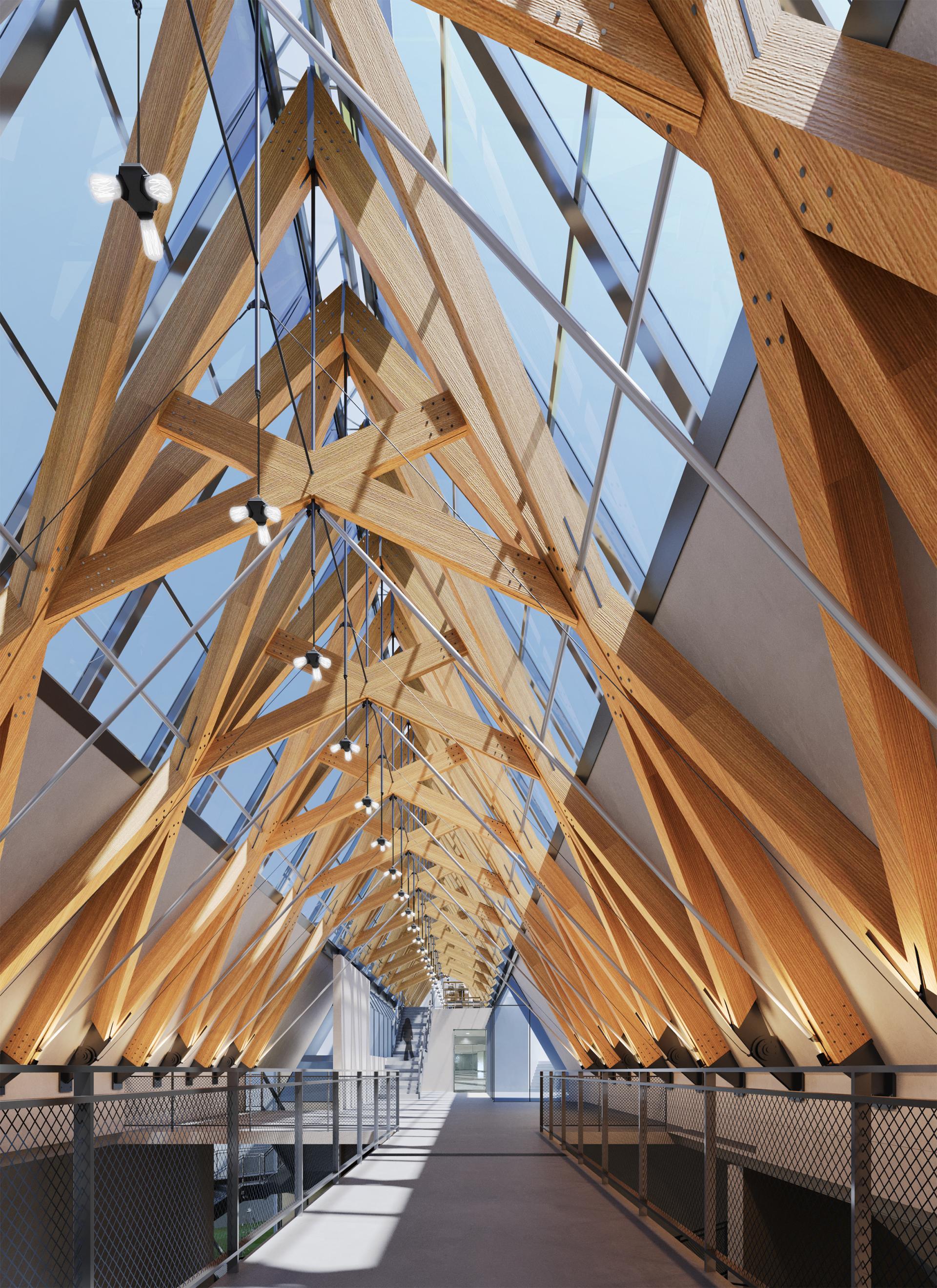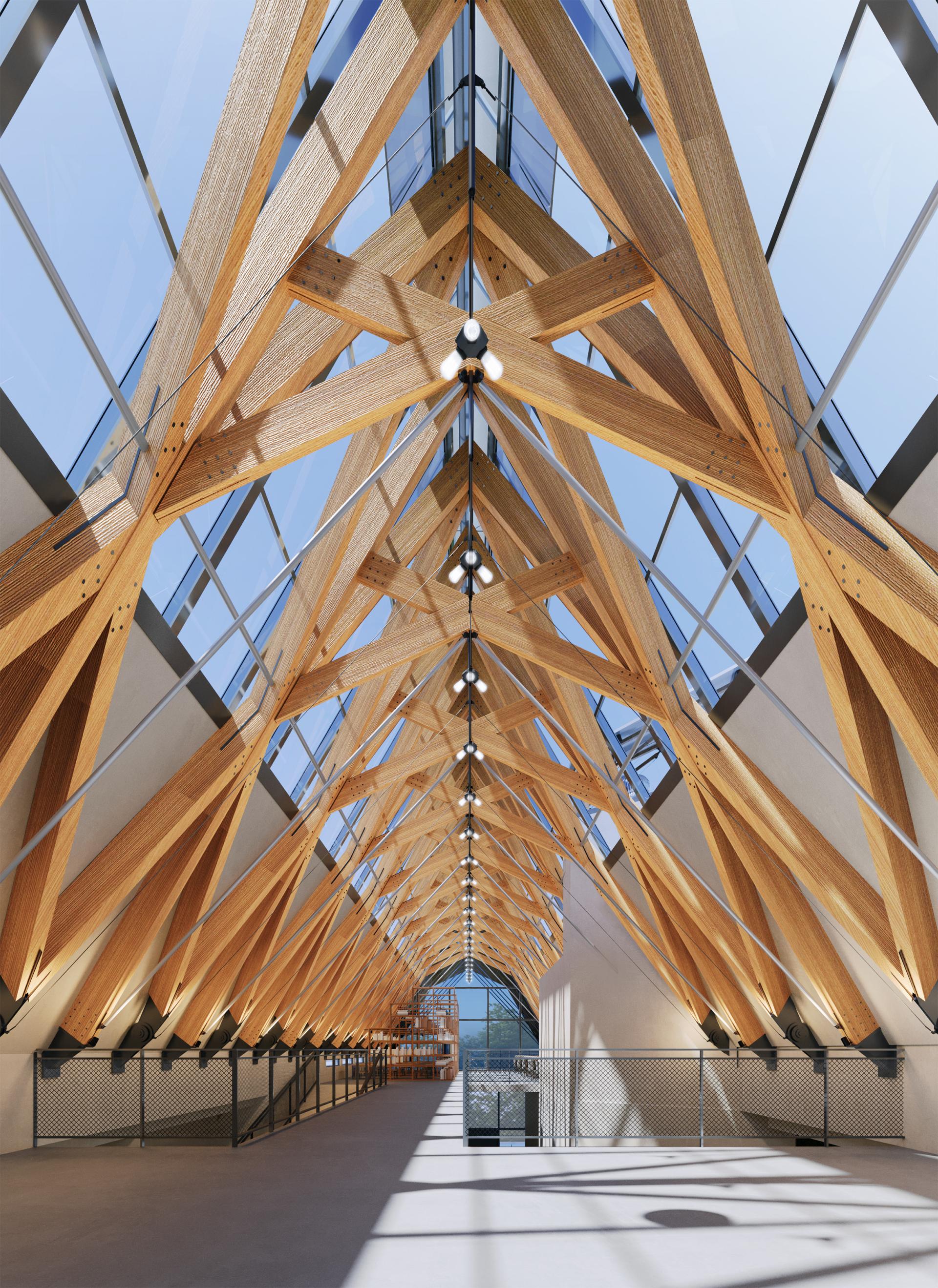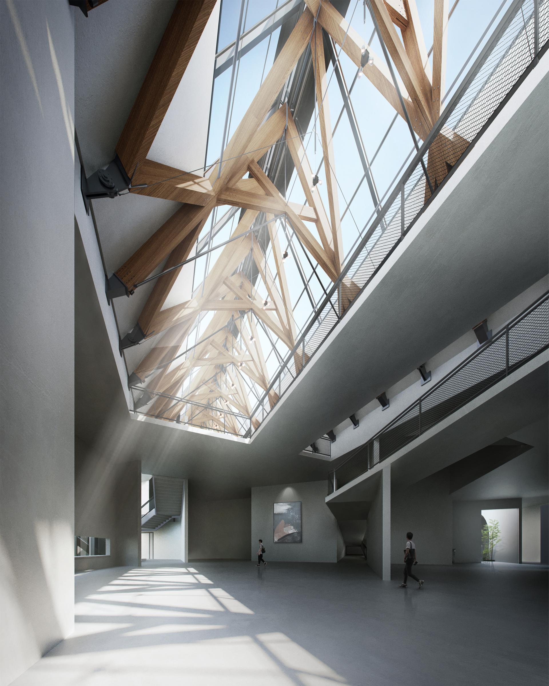 The shape of the second floor symbolically constructs the ‘Cultural Backbone’ of Fulin Town, echoing the inheritance and innovation of local historical culture with the form of steel and wood structure. The second-floor overhead platform intersects with the center’s central axis, forming an open space sequence with the geometric shape of the first floor.