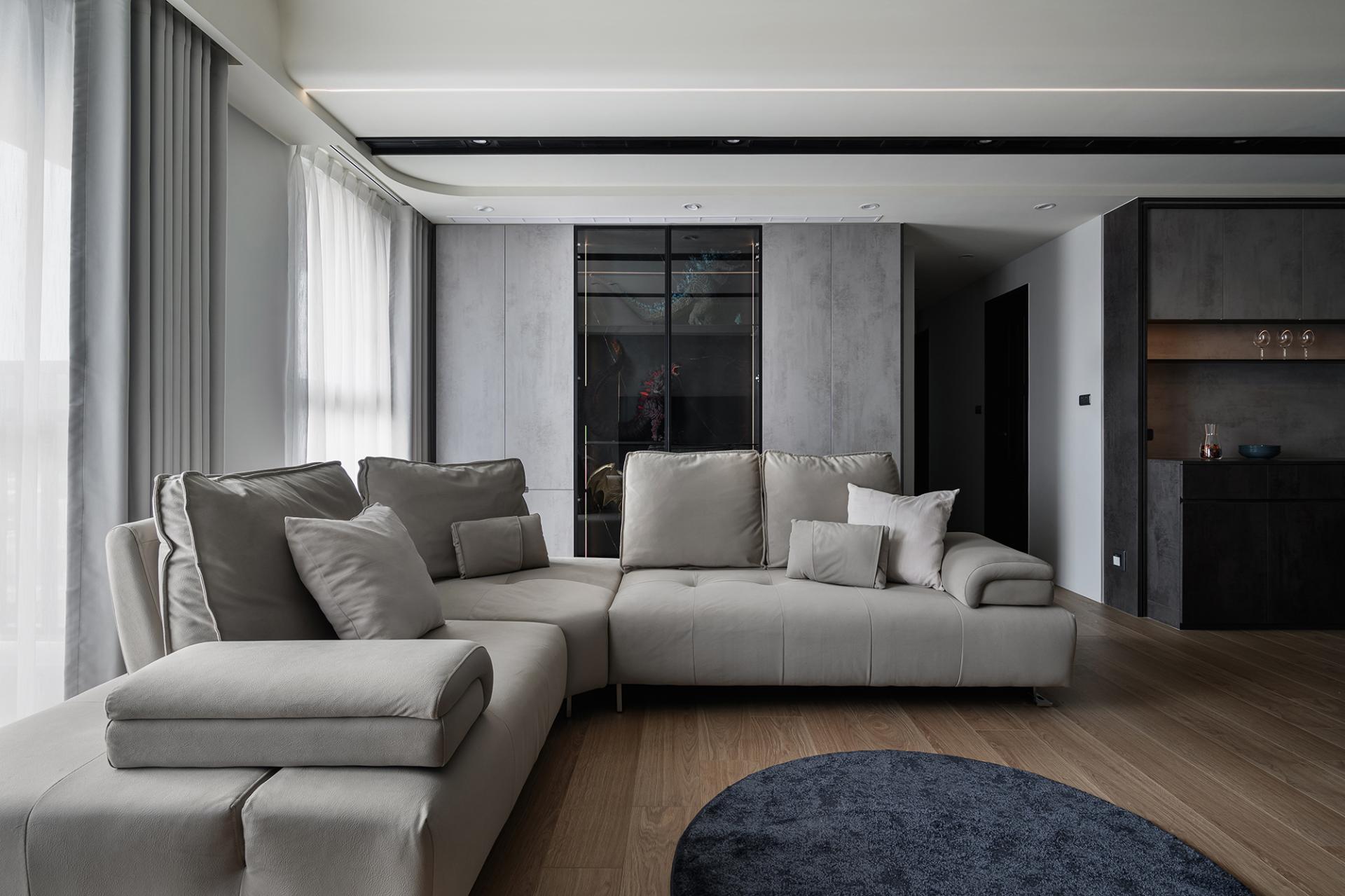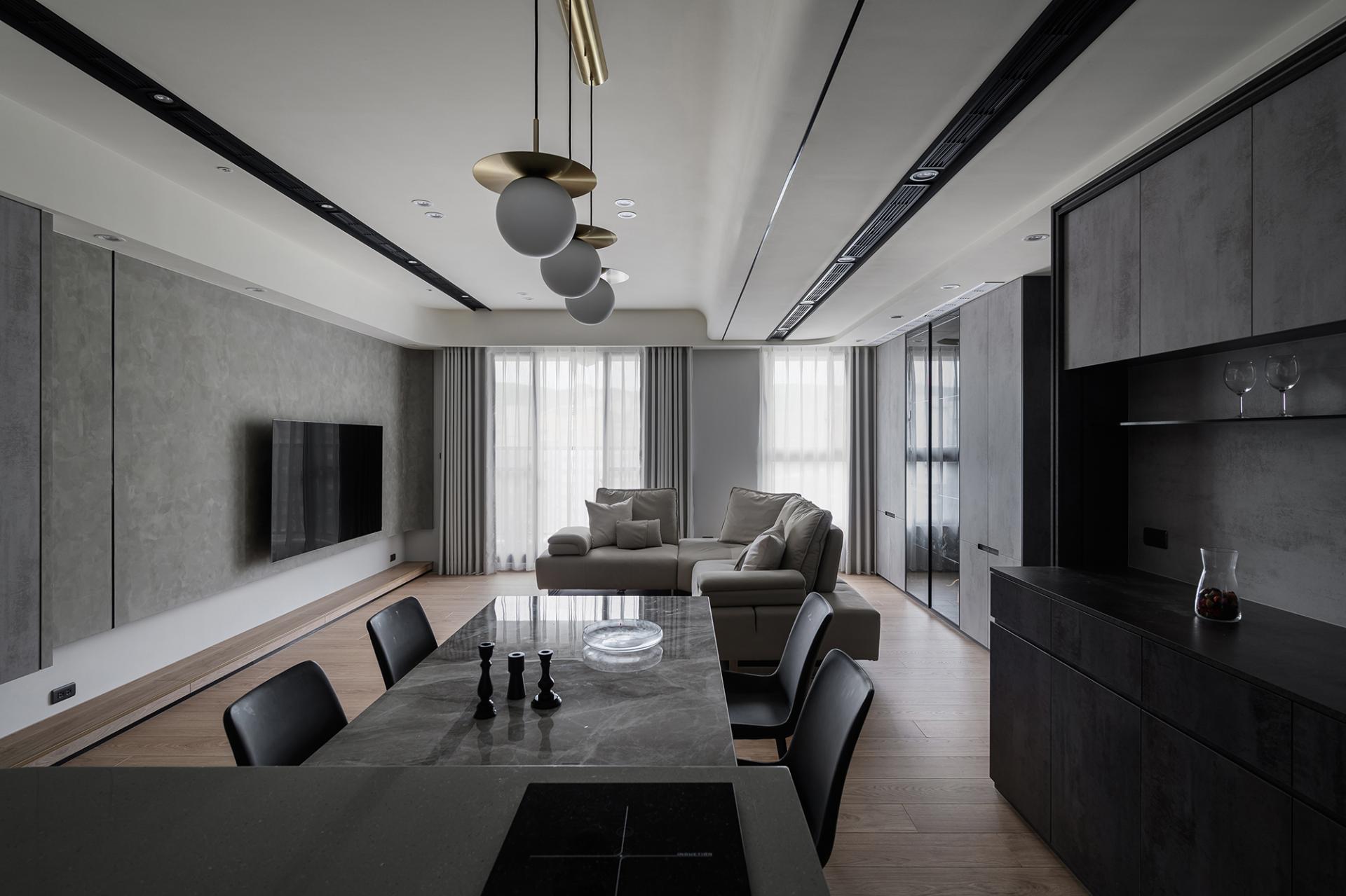 The designer has skillfully integrated rounded corners into the ceiling, effectively softening the visual impact of the sharper straight lines and mitigating the spatial pressure imposed by the beams and columns. The overall design emphasizes individuality, primarily utilizing dark tones as the central theme. Furthermore, it incorporates a diverse range of materials, including stone, metal, and aluminum light strips. Through meticulous craftsmanship, all elements are cohesively integrated, creating a rich sense of layering and a distinctive spiritual experience for the residents.