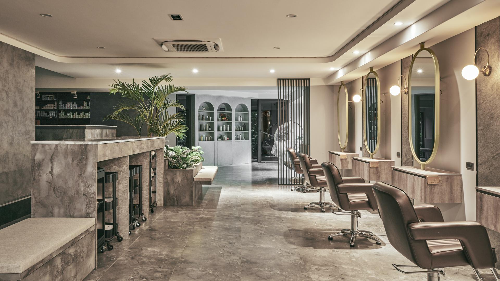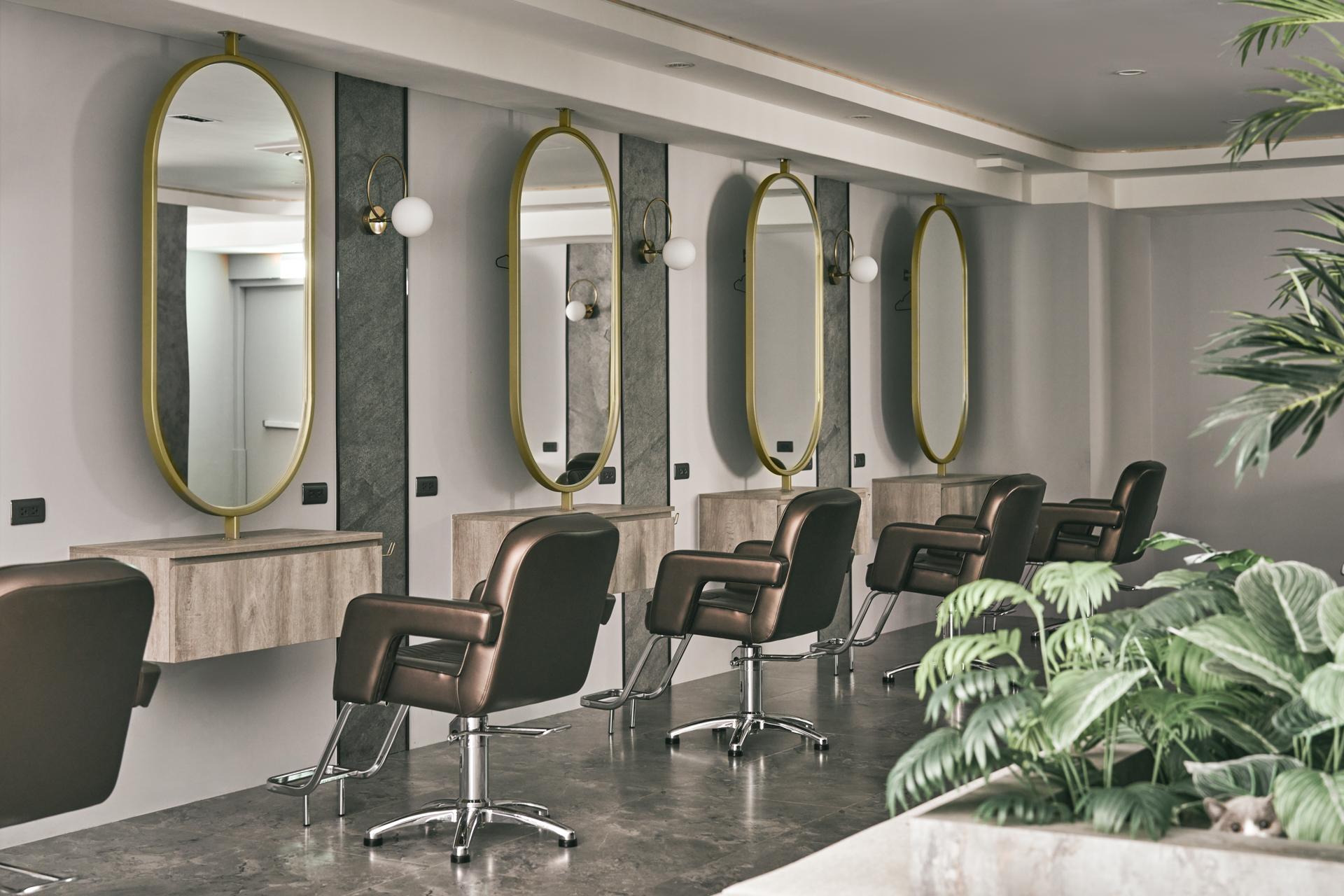The space is softened by the use of curved arch elements, lending a touch of roundness to balance the modern, structured style, making the environment more approachable. The choice of gold-bronze seating and titanium-coated mirror frames adds focal points that enhance the charm and sophistication of the salon. Together, these design decisions exemplify a balance between functionality and beauty, establishing a new benchmark in salon space design.