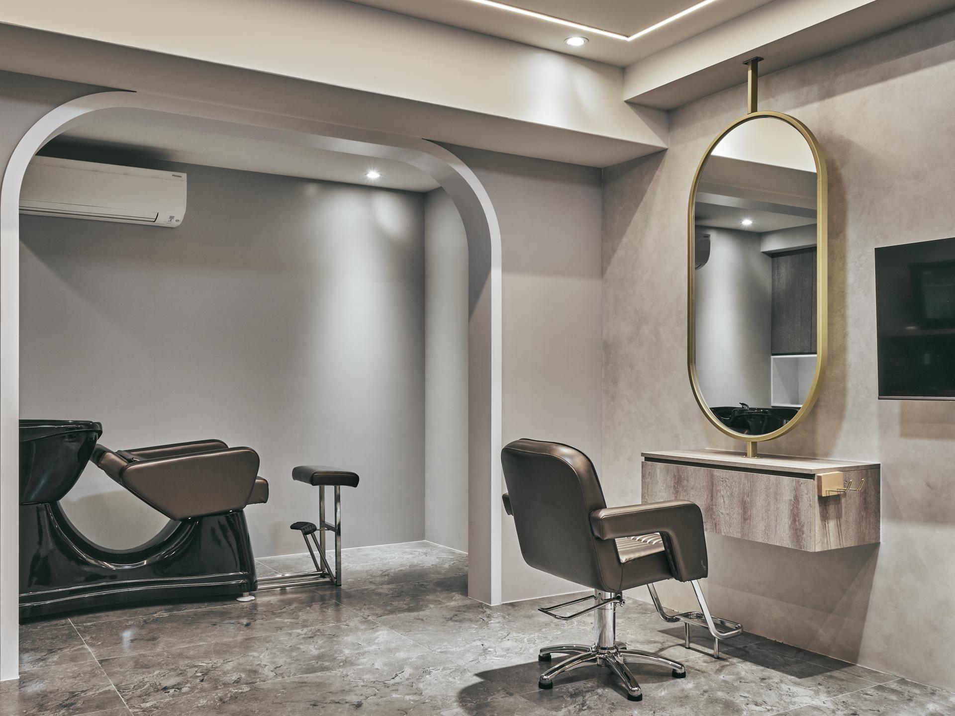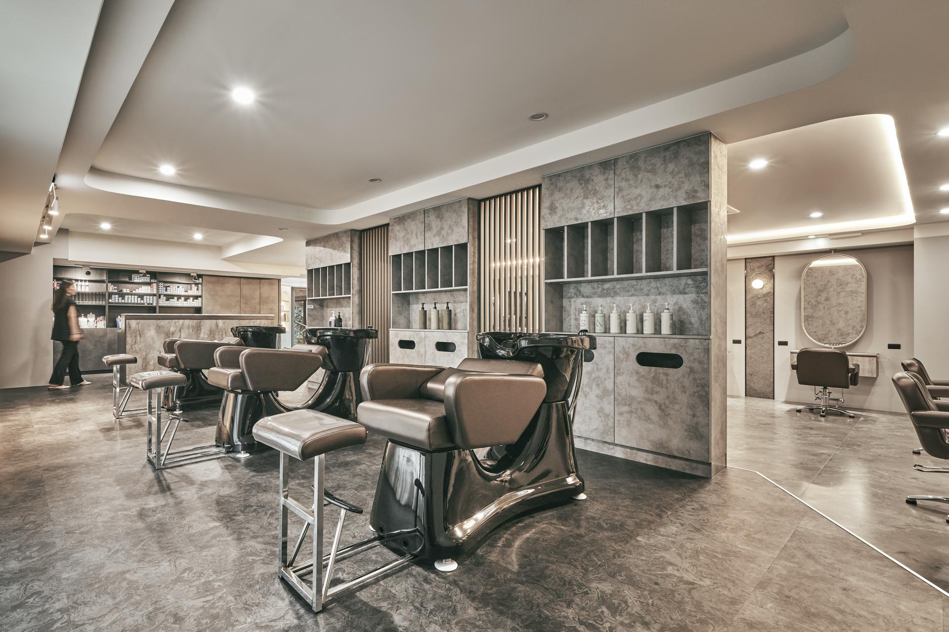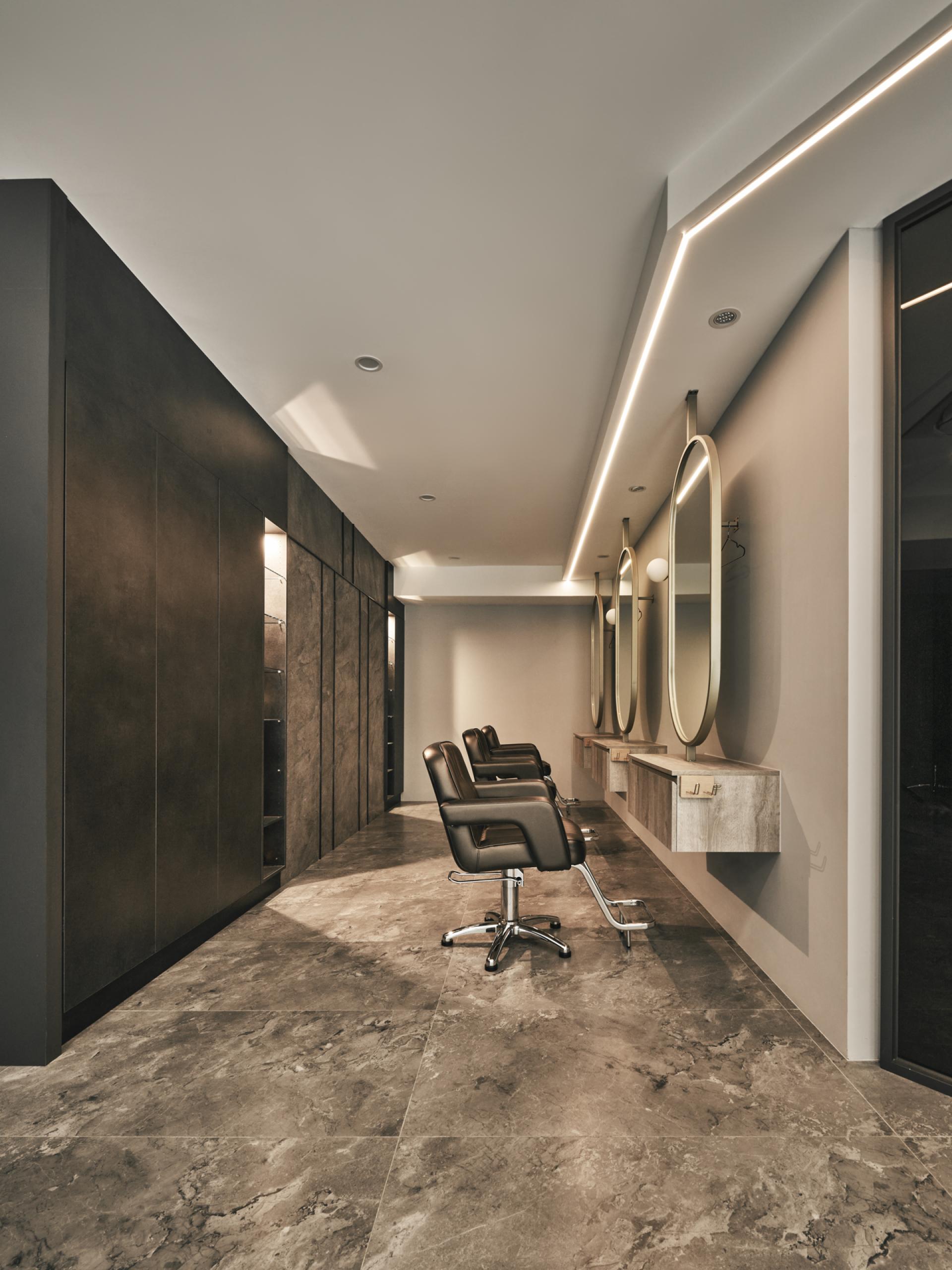 The design goes beyond aesthetics by thoughtfully considering the needs of both clients and stylists. A dedicated seating area provides stylists with a brief resting spot during lengthy treatments, demonstrating a sensitive approach to service ergonomics. The strategic layout of storage and work carts allows stylists to operate smoothly and efficiently, maintaining an organized workflow. Facing the challenge of limited space, the design team skillfully created distinct open and private zones through the use of greenery, mirrors, and contrasting materials. The reception area uniquely incorporates LED light strips that echo the brand’s initials, strengthening brand identity in a creative manner.