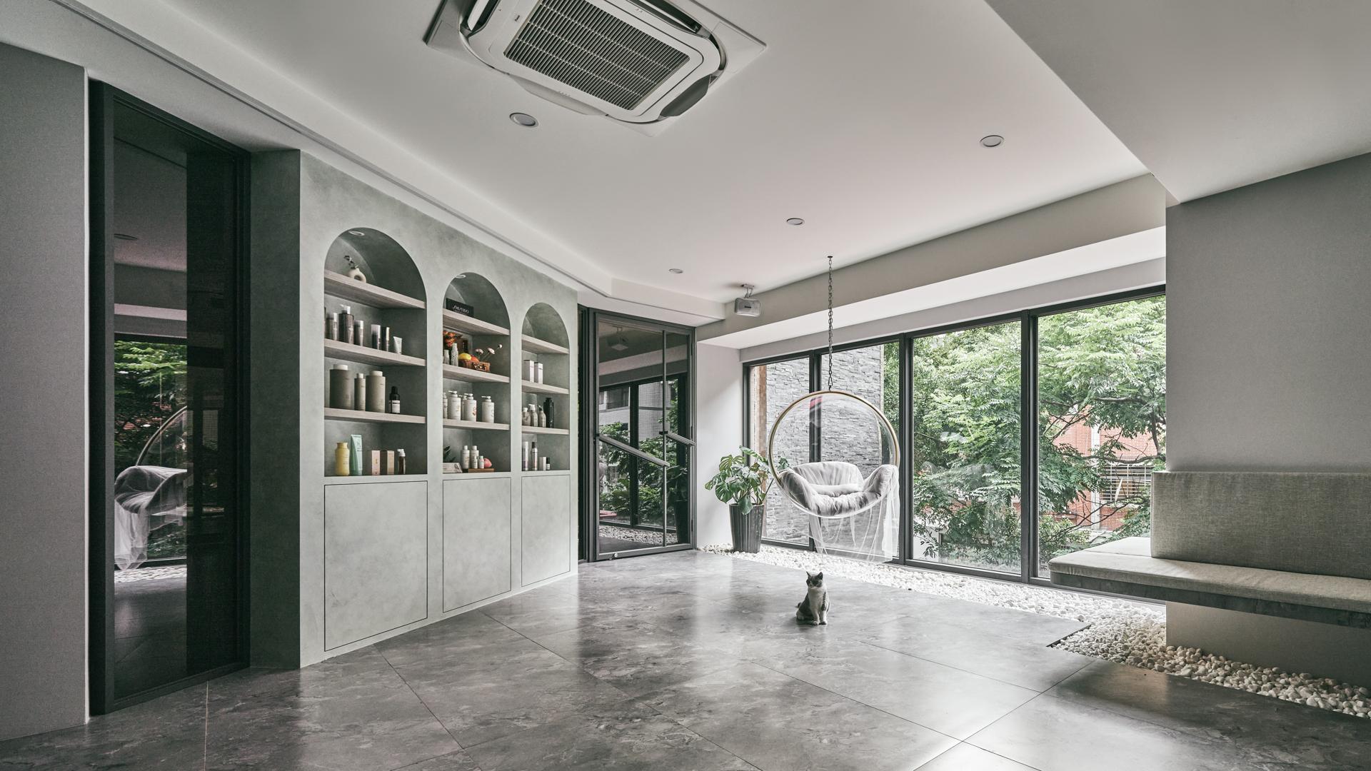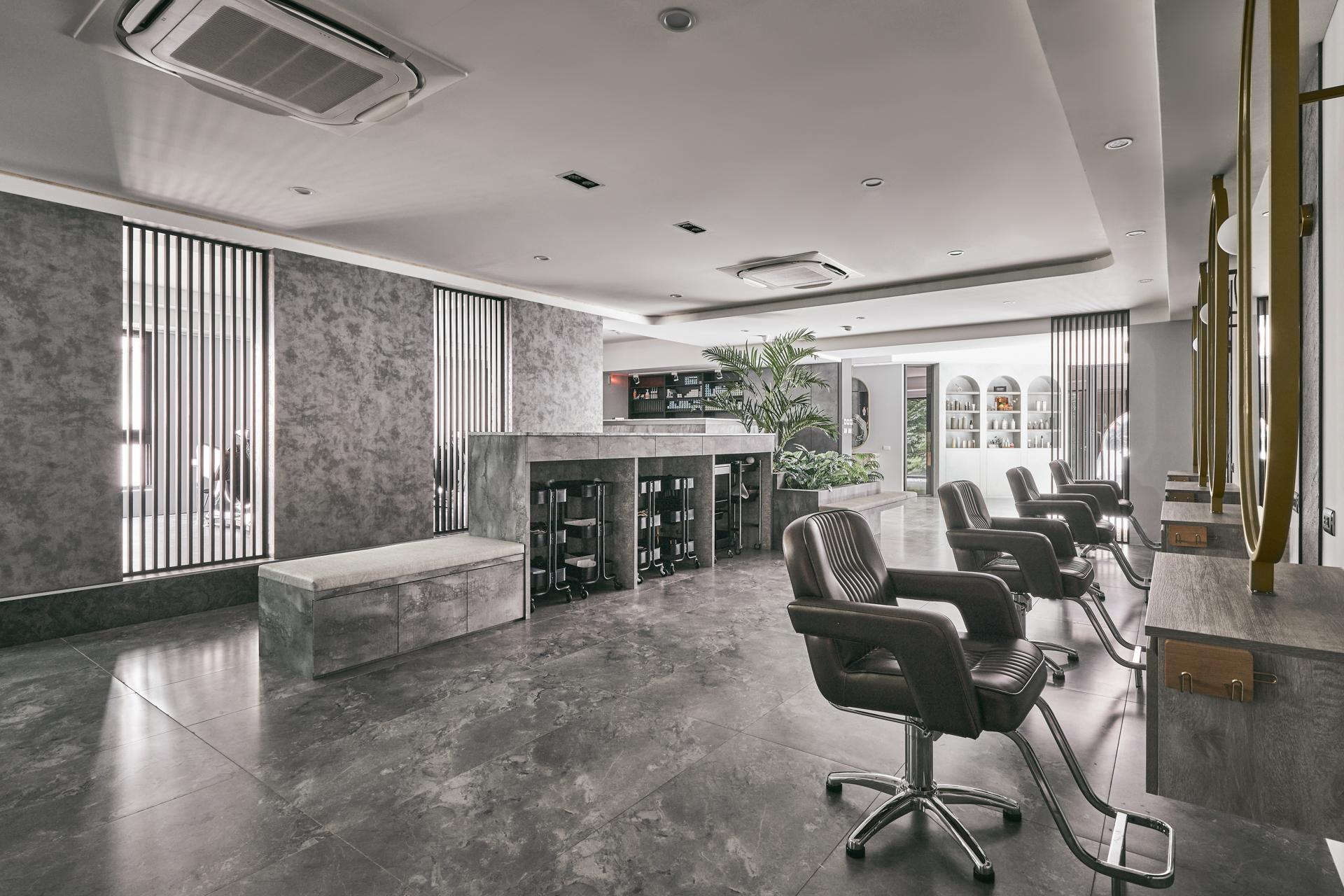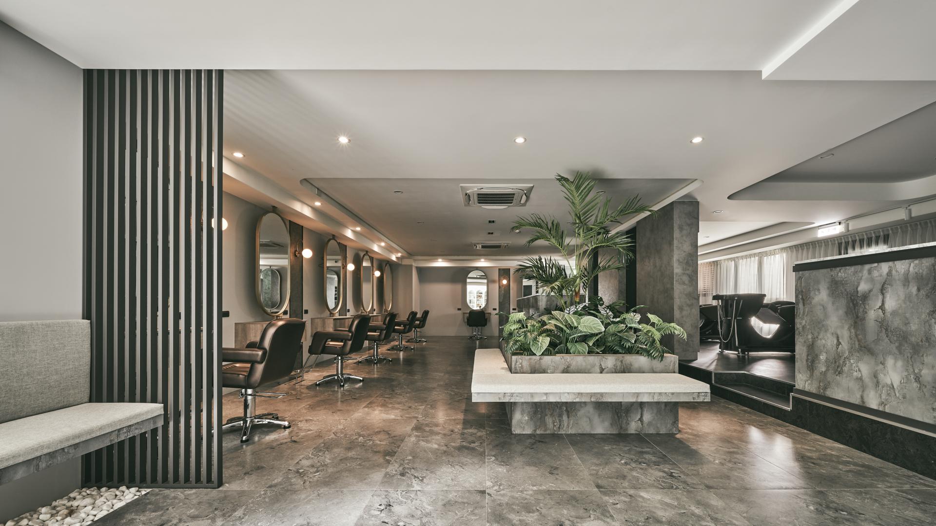 The design goes beyond aesthetics by thoughtfully considering the needs of both clients and stylists. A dedicated seating area provides stylists with a brief resting spot during lengthy treatments, demonstrating a sensitive approach to service ergonomics. The strategic layout of storage and work carts allows stylists to operate smoothly and efficiently, maintaining an organized workflow. Facing the challenge of limited space, the design team skillfully created distinct open and private zones through the use of greenery, mirrors, and contrasting materials. The reception area uniquely incorporates LED light strips that echo the brand’s initials, strengthening brand identity in a creative manner.