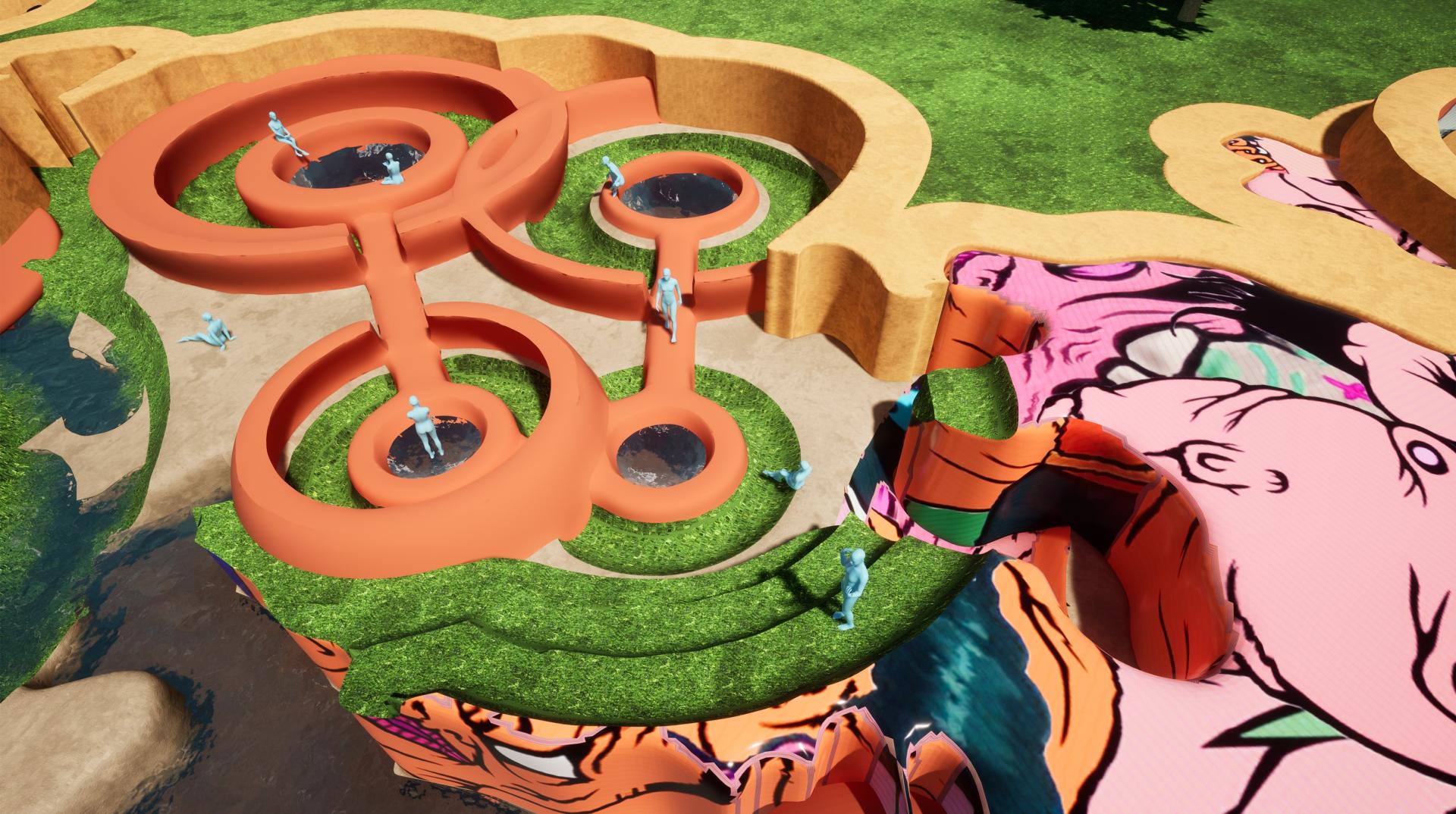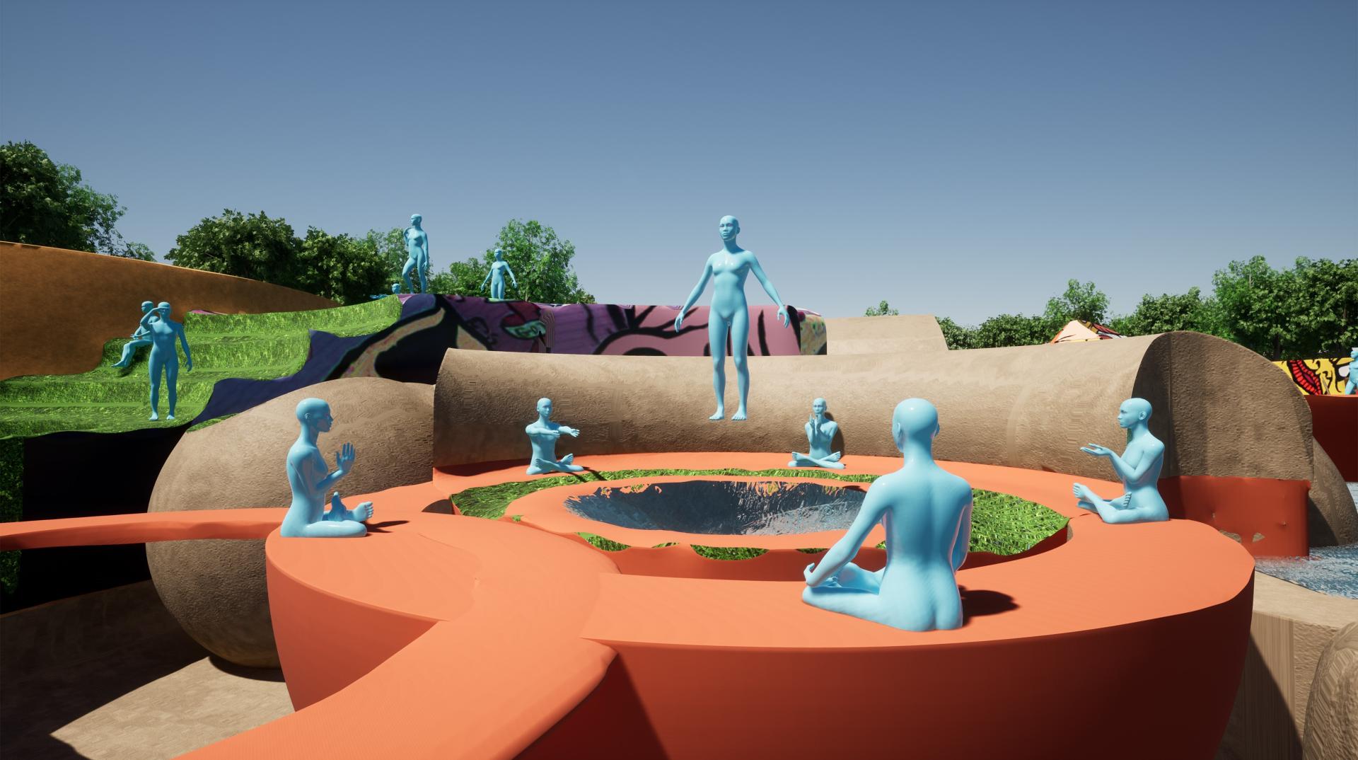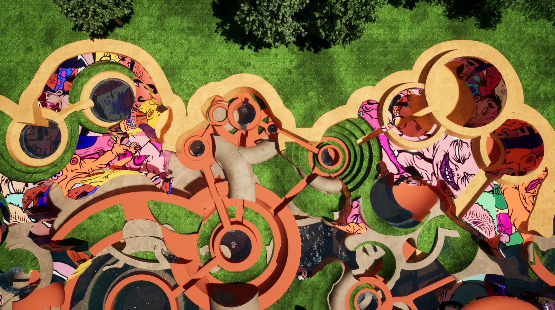 During this pandemic all public parks have been closed because they could not sufficiently promote social distancing. A park as a public space not only allows people to learn and improve themselves, but also offer a place to communicate and relax. We developed a playful idea of using simulated rounded, isolated figures and cluster them all together to create the site. In the final product, users are traveling within this cluster, while being discouraged to cluster themselves. How does a public area could be shaped according to social distancing rules? A decentralization strategy has been implemented to create several spaces and pathways to distribute clusters of people into small groups or individuals. Circular divisions create ever changing functions and forms through intersections and redirection. The center of the circles are less accessible to discourage our natural tendency to cluster at a center. Instead users travel and rest within varying rings around the center. It is a flexible design that offers a response to the uncertainty of tomorrow’s public space.