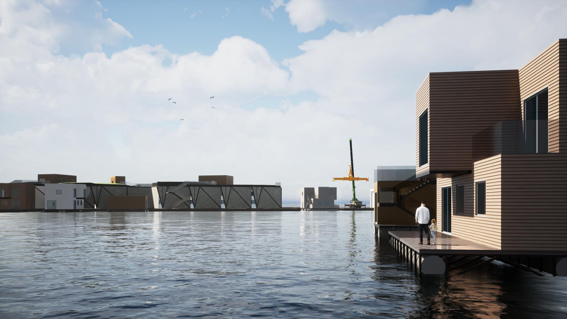 Environmentally based crisis events are accelerating the need to develop buildings that can provide sustainable, affordable, and high-quality solutions, delivered at speed and scale, without compromising safety and health. Digital technologies supporting the mass-customized design and production of buildings will be needed to address these pressing demands. The project will explore the future of integrated live-work hubs by designing a smart factory for manufactured buildings and an associated mixed-use neighborhood developed through the building methods of the factory. The project will re-imagine manufacturing processes with modular straw bale panel design to provide sustainable, clean, safe, rapidly deployable production, and using advanced technology. The mobile floating factory movable along the coastal line or through inland waterways will allow to deploy the production of affordable high-quality modular housing in areas affected by natural disasters or in such with the potential for building of a floating community.