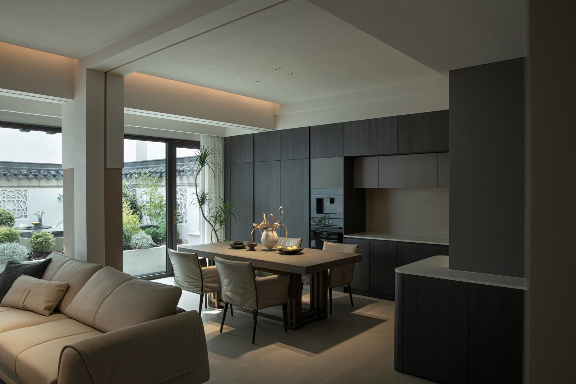 Based on the dismantling analysis of the architectural form, the designer opened up the redundant non-load-bearing walls and improved the permeability of the space. The scale of the living room extends towards the courtyard, which solves the problem of poor lighting due to the large eaves of the original building. After optimization, large-area floor-to-ceiling windows introduce sunlight and courtyard scenery, making the connection between the interior and exterior closer, awakening deep inner memories from the visual perception level.