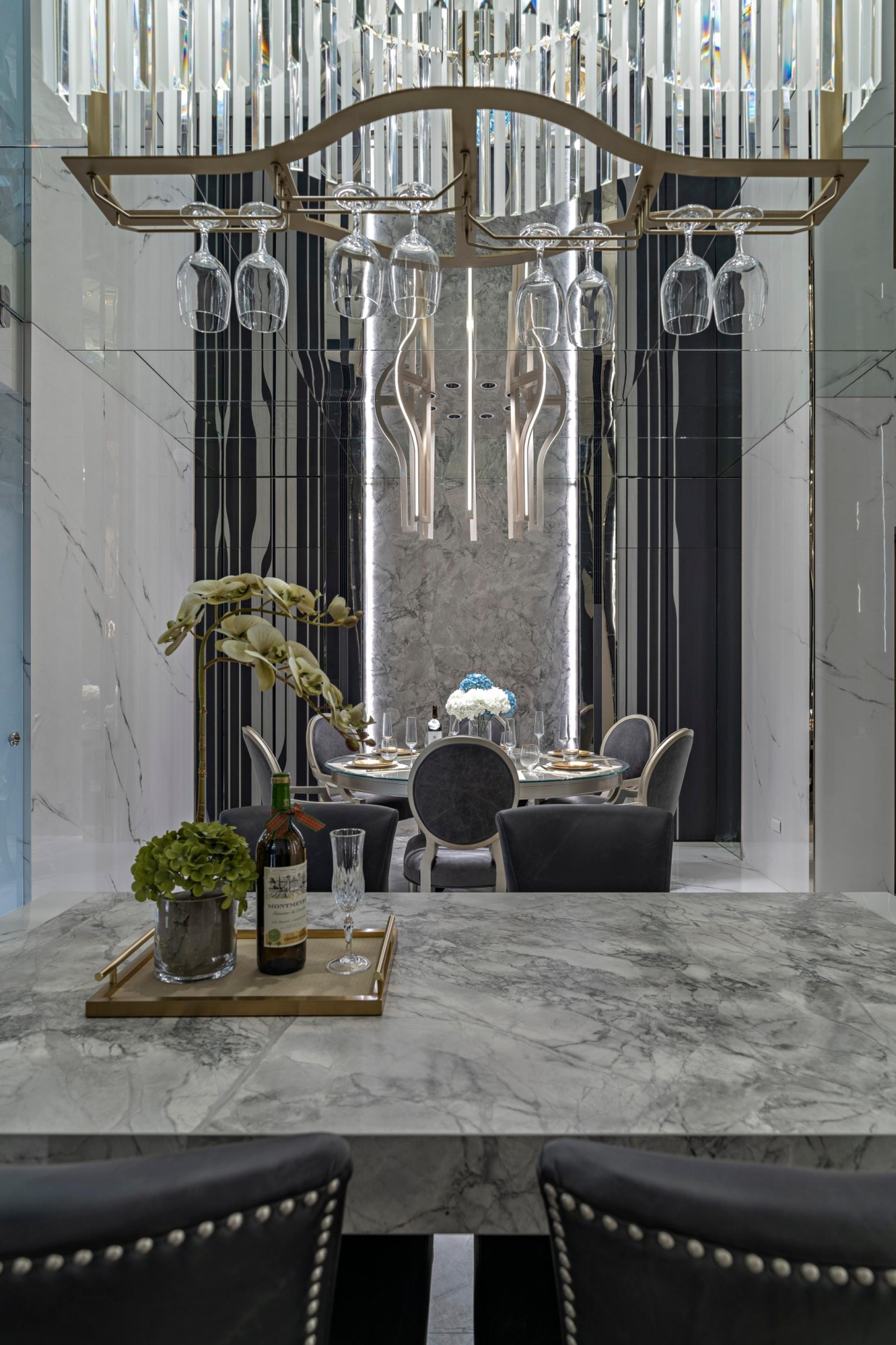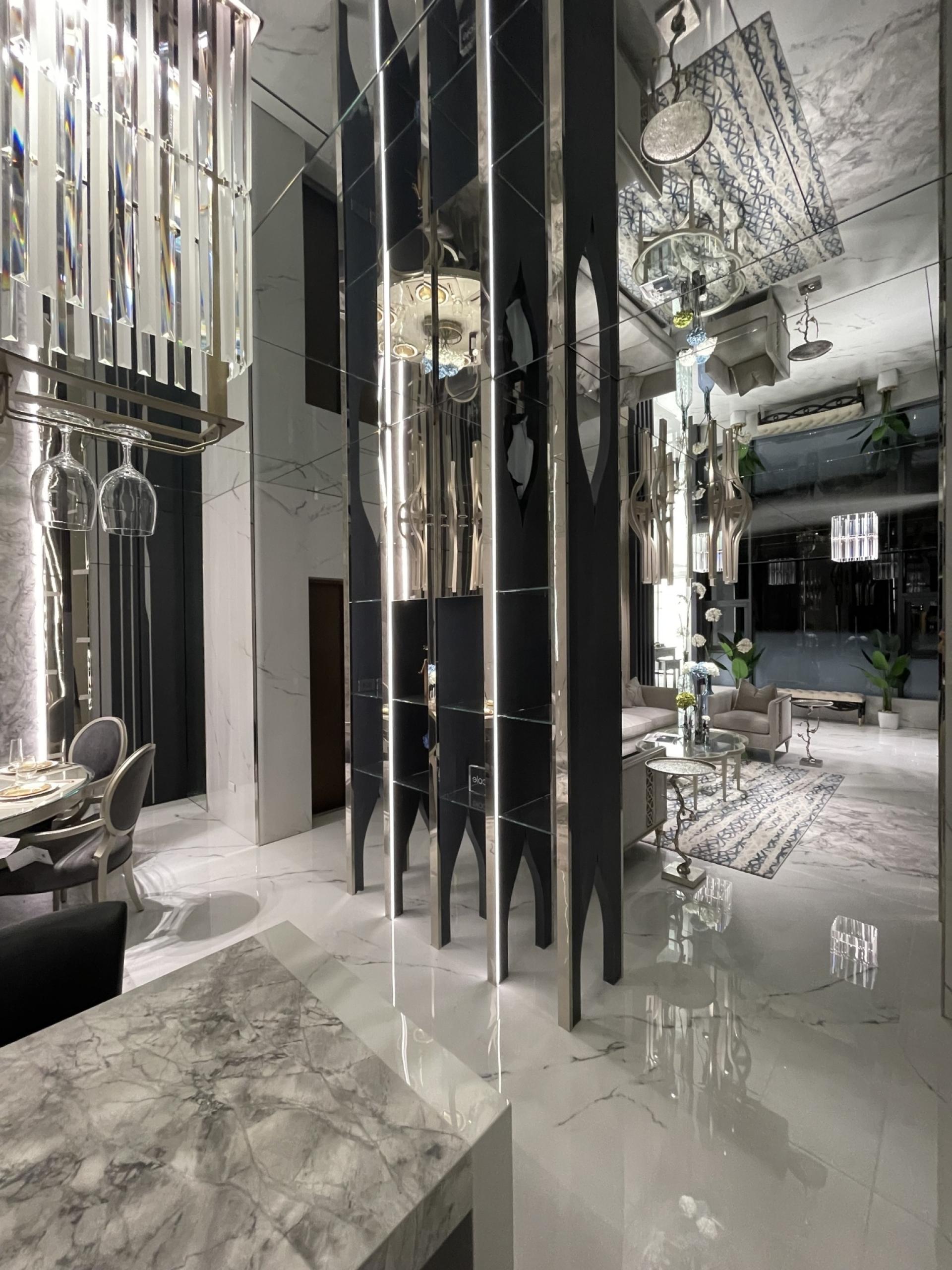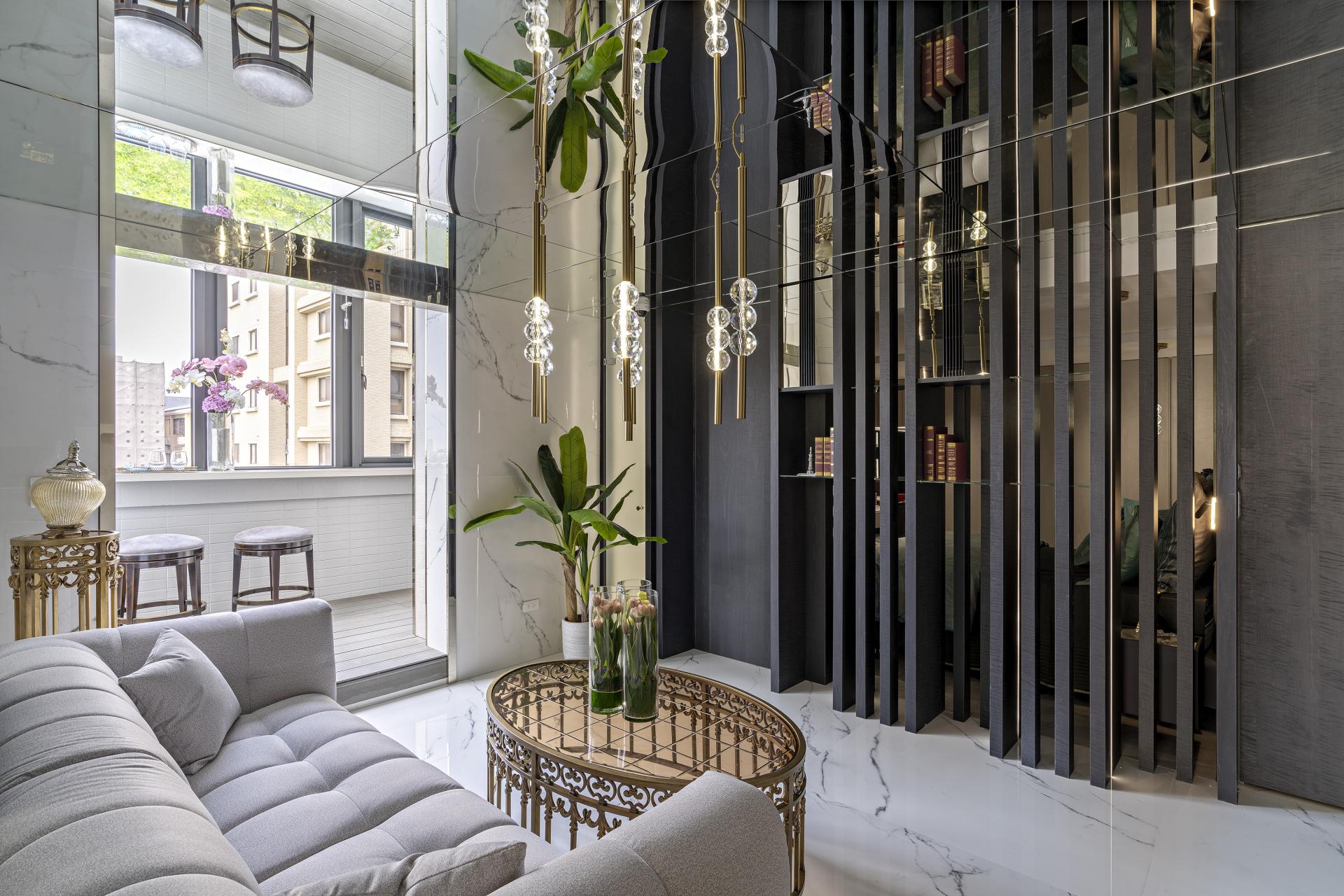 The designer uses the linear elements of the grid as a metaphor for the "open branches and scattered leaves" image of the Eastern family, which grows and connects from the first floor to different floors, and then transforms into the boundaries of display, storage and compartment. Under the reflection of the mirror, it also creates a magnificent and bright sense of space, perfectly resolving the visual limitation of the height of the house.
