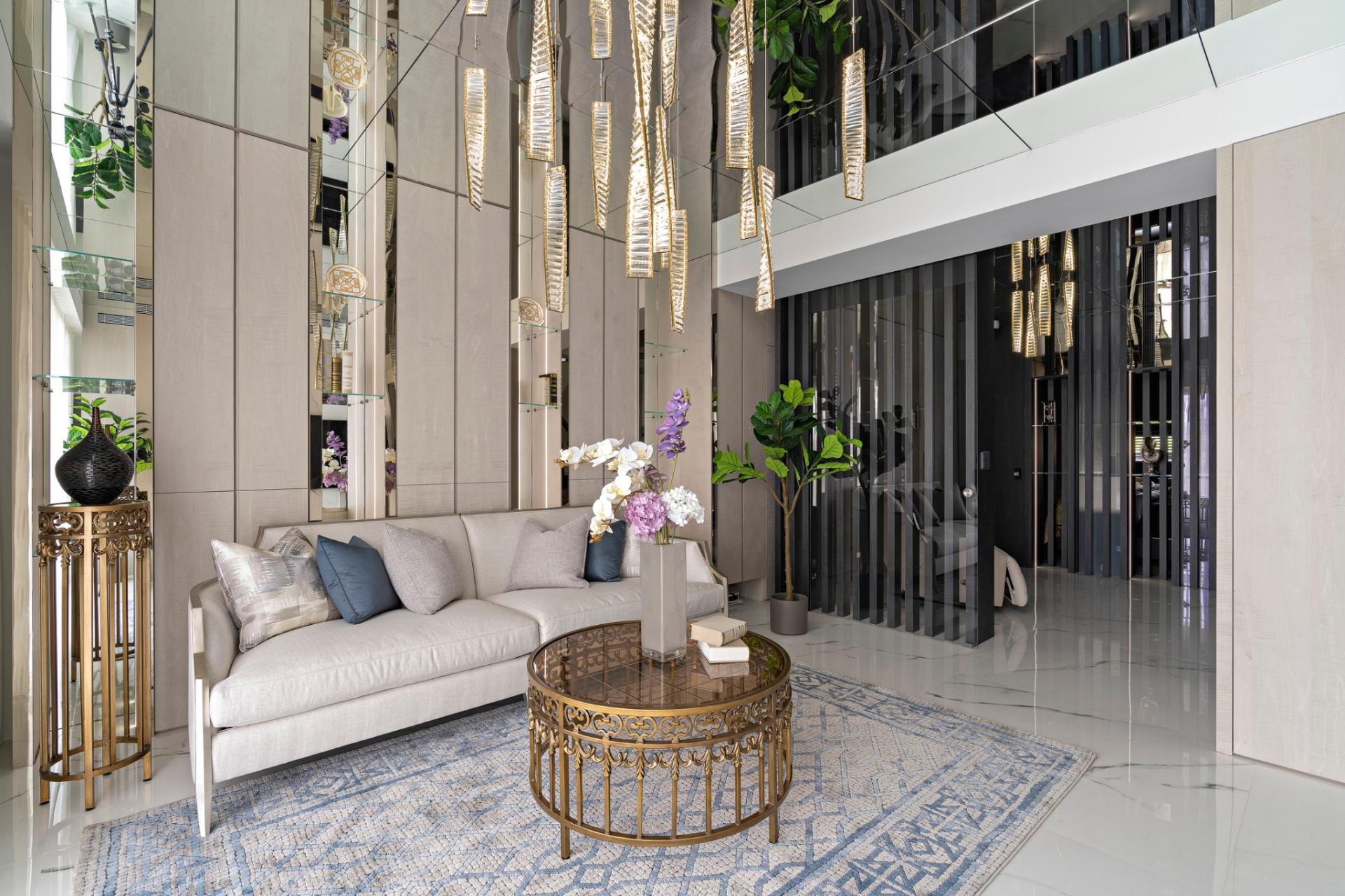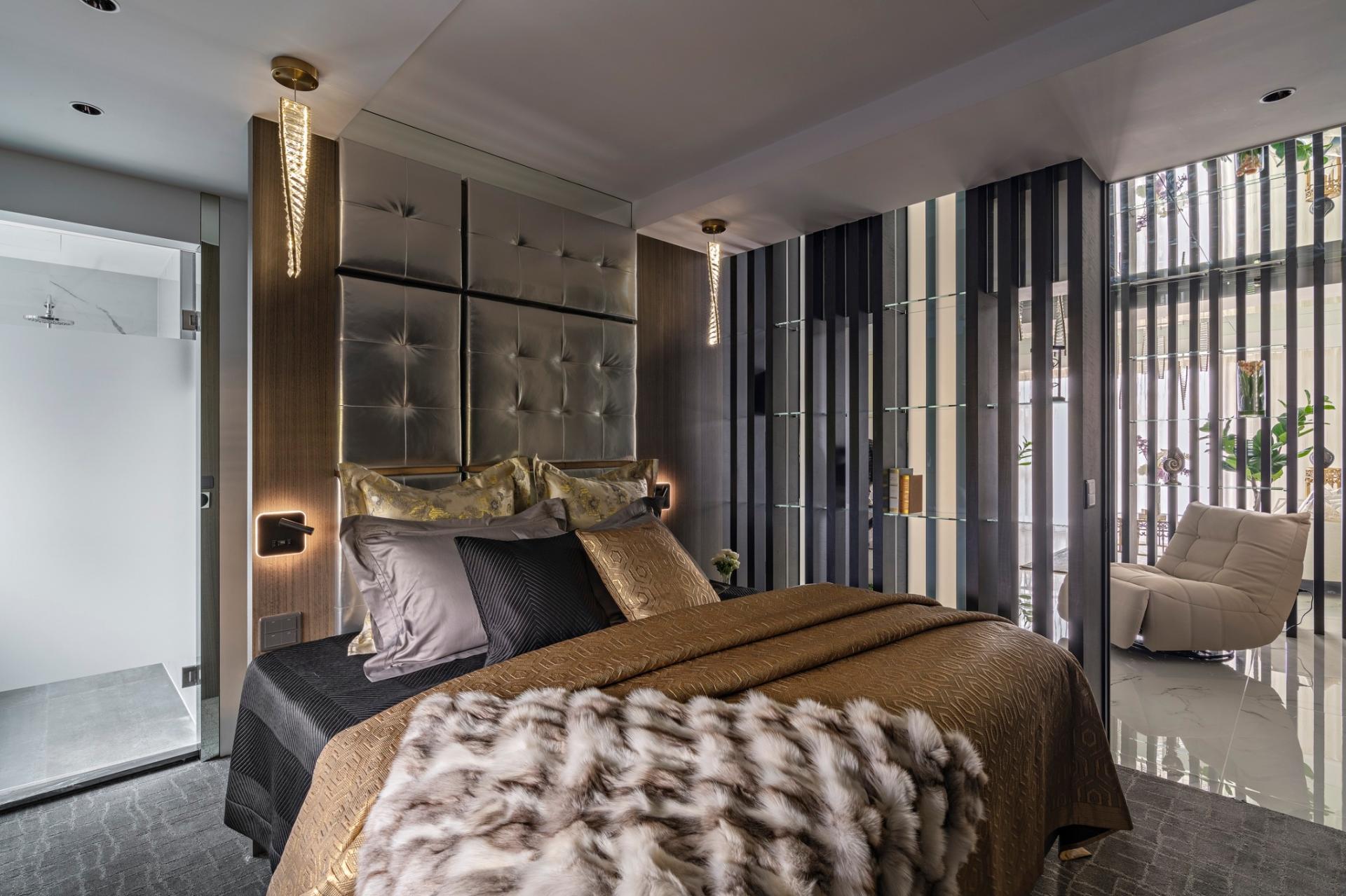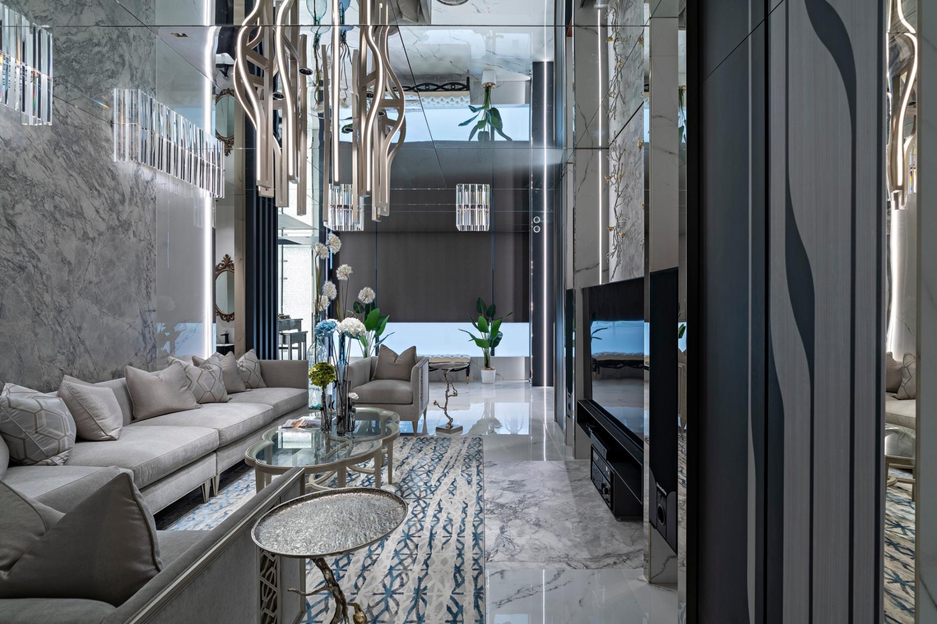 The designer uses the linear elements of the grid as a metaphor for the "open branches and scattered leaves" image of the Eastern family, which grows and connects from the first floor to different floors, and then transforms into the boundaries of display, storage and compartment. Under the reflection of the mirror, it also creates a magnificent and bright sense of space, perfectly resolving the visual limitation of the height of the house.