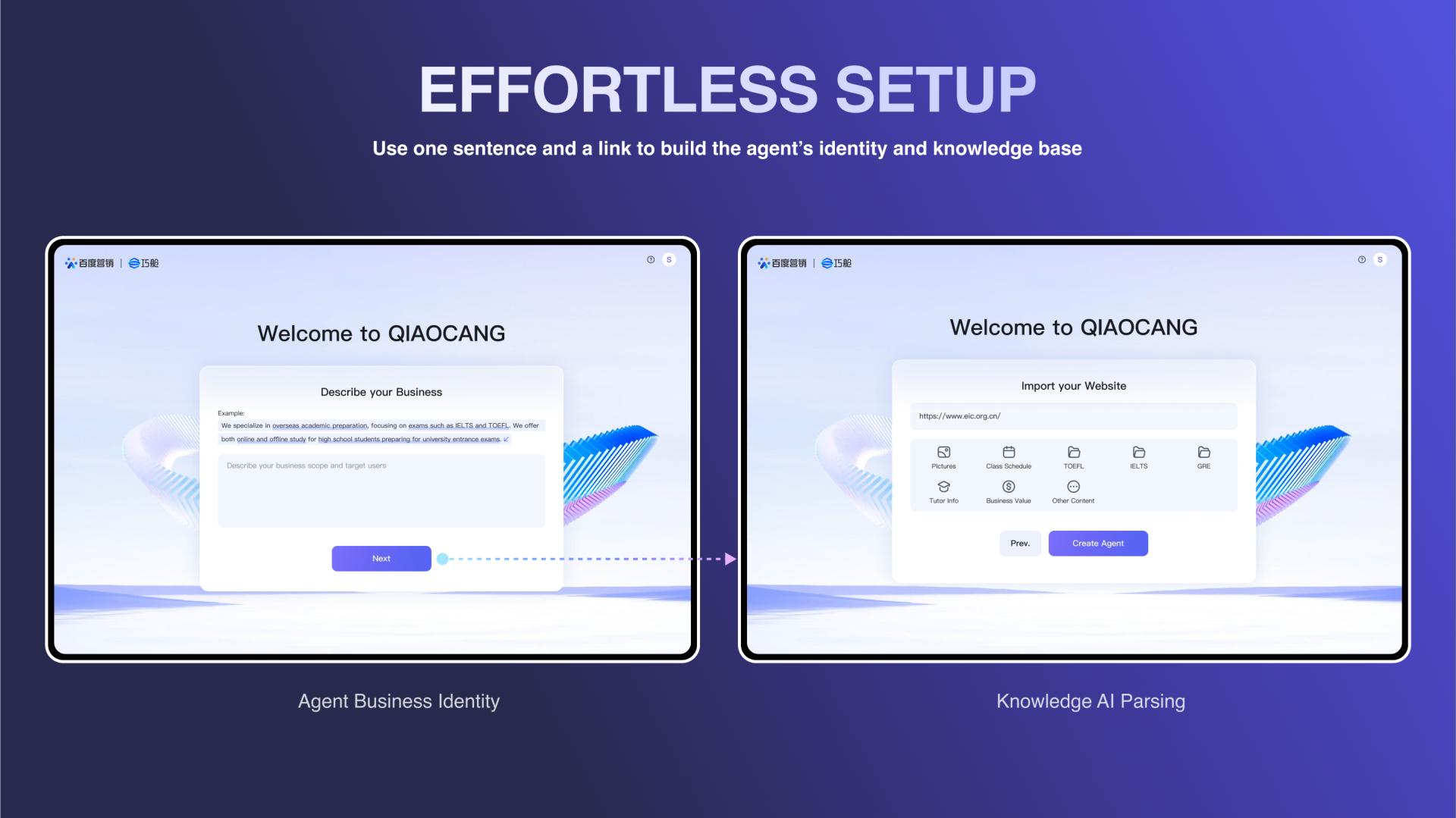 Qiaocang's intelligent agent platform focuses on marketing services, offering nationwide businesses—especially small and micro businesses—solutions for fast-changing industry knowledge, time limitations, and geographic constraints. With Qiaocang, merchants can easily build an intelligent agent without needing in-depth AI knowledge, enabling them to provide high-quality service to users anytime and anywhere.