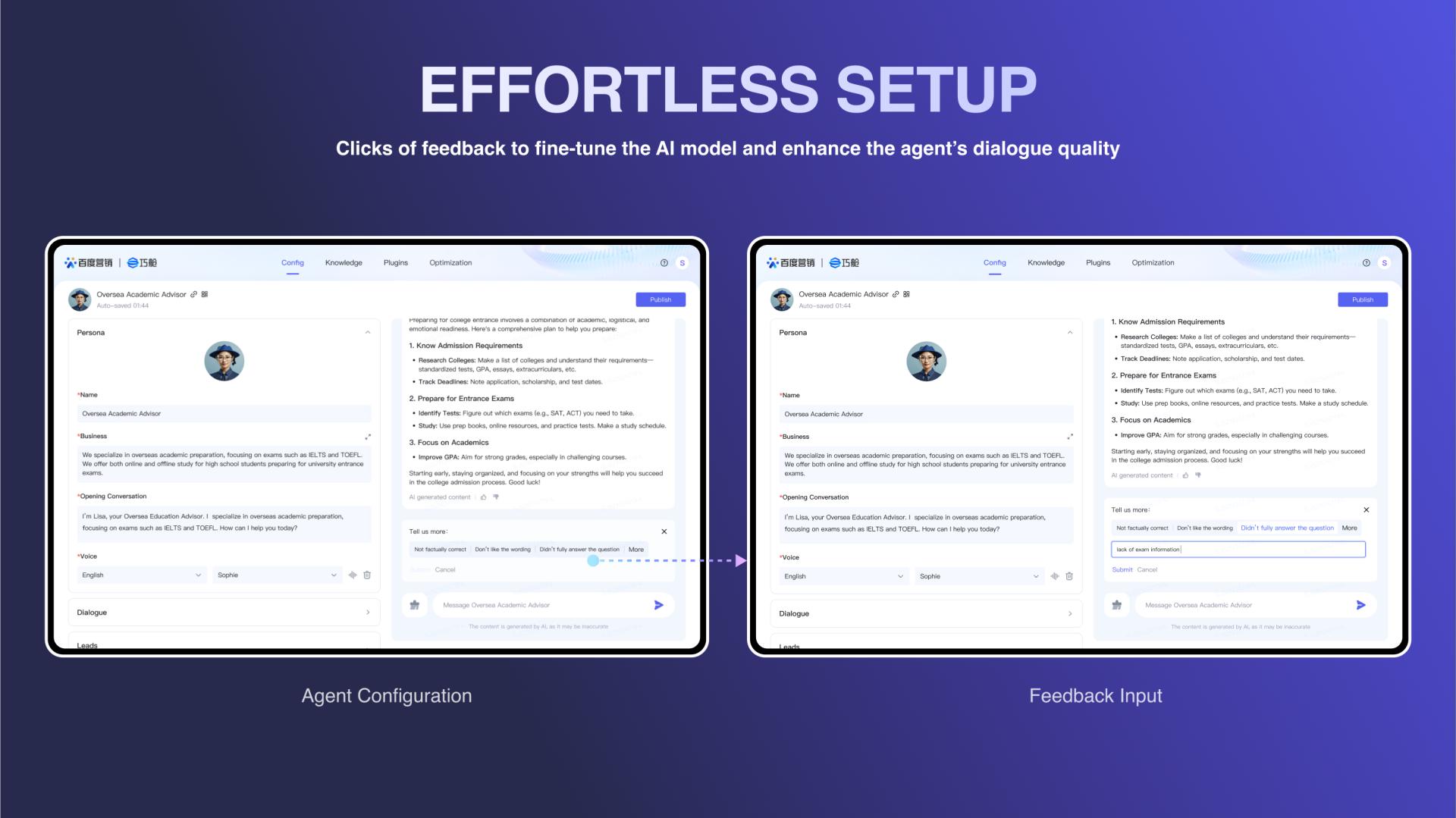 The Qiaocang platform stands out for its simple configuration and end-to-end support. Based on Baidu's Wenxin model, merchants need only input a sentence or upload a link to establish the agent's core business knowledge, with the system automatically parsing specific business information. Qiaocang covers the entire lifecycle of agent development, from initial setup to advanced performance, guiding merchants through four stages: initial cognition with identity setup, enrichment with knowledge resources, refinement through dialogue optimization, and sustained growth through rewards, encouraging long-term engagement. This comprehensive, phased training is a unique advantage of Qiaocang's platform.