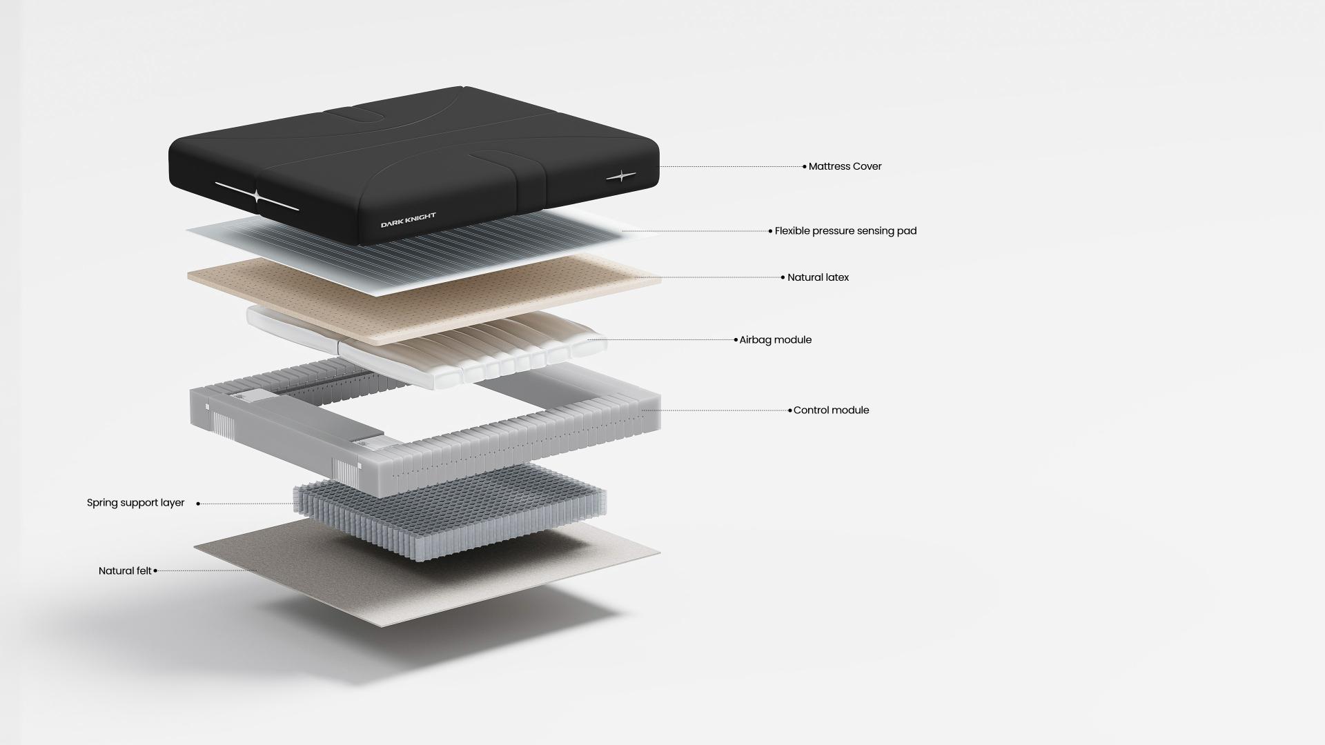 The Dark Knight AI Smart Mattress is a smart mattress that integrates cutting-edge artificial intelligence technology, ergonomic principles, and human body big data, designed to meet the unique physiological structures and sleep habits of each user. By incorporating sophisticated AI technology and a smart support system, the mattress can sense and respond to the user's body pressure changes in real time, ensuring optimal support and comfort. Additionally, the mattress features a distinctive DK quilting pattern on its surface, complemented by a black, skin-like fabric that aligns with the brand's aesthetic, creating a highly recognizable and stylish appearance.