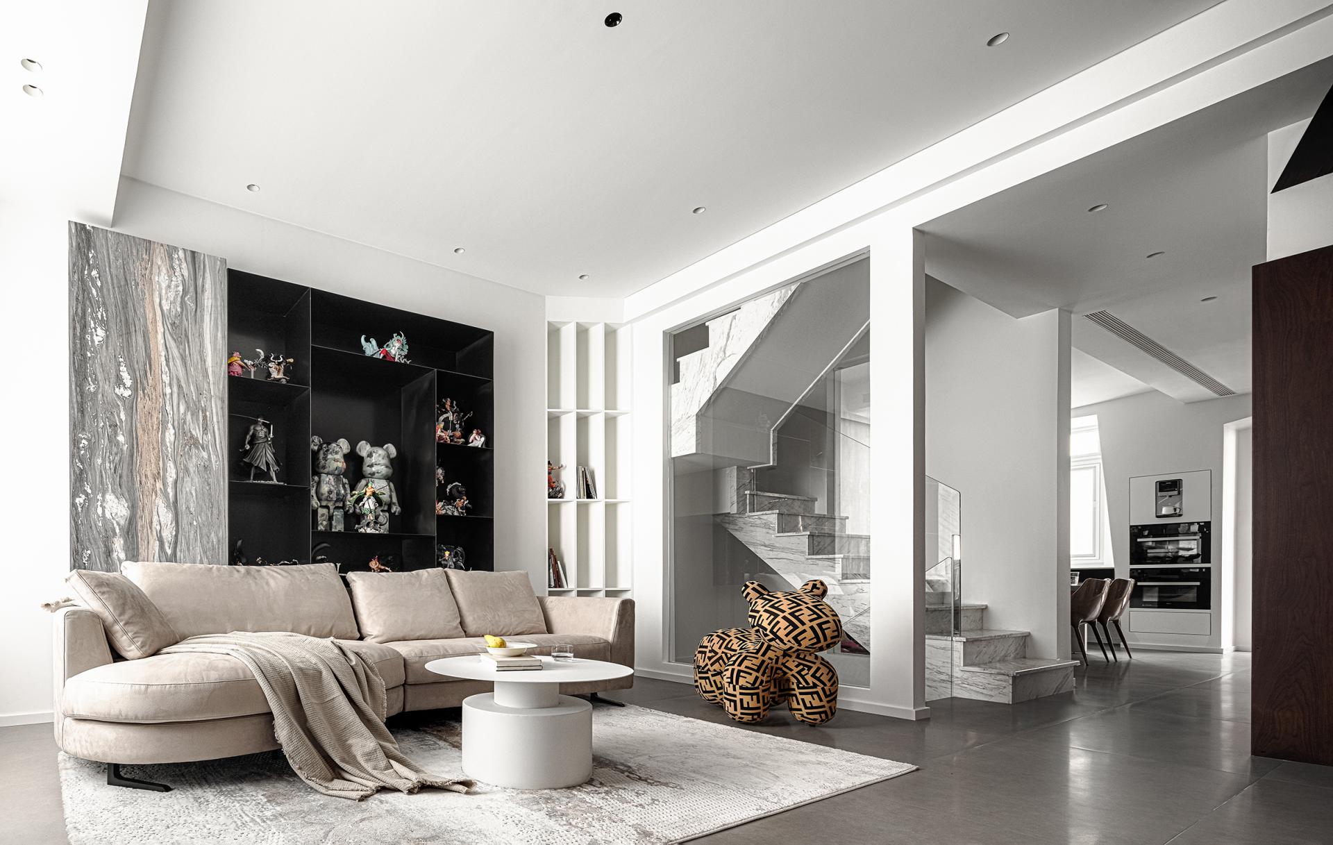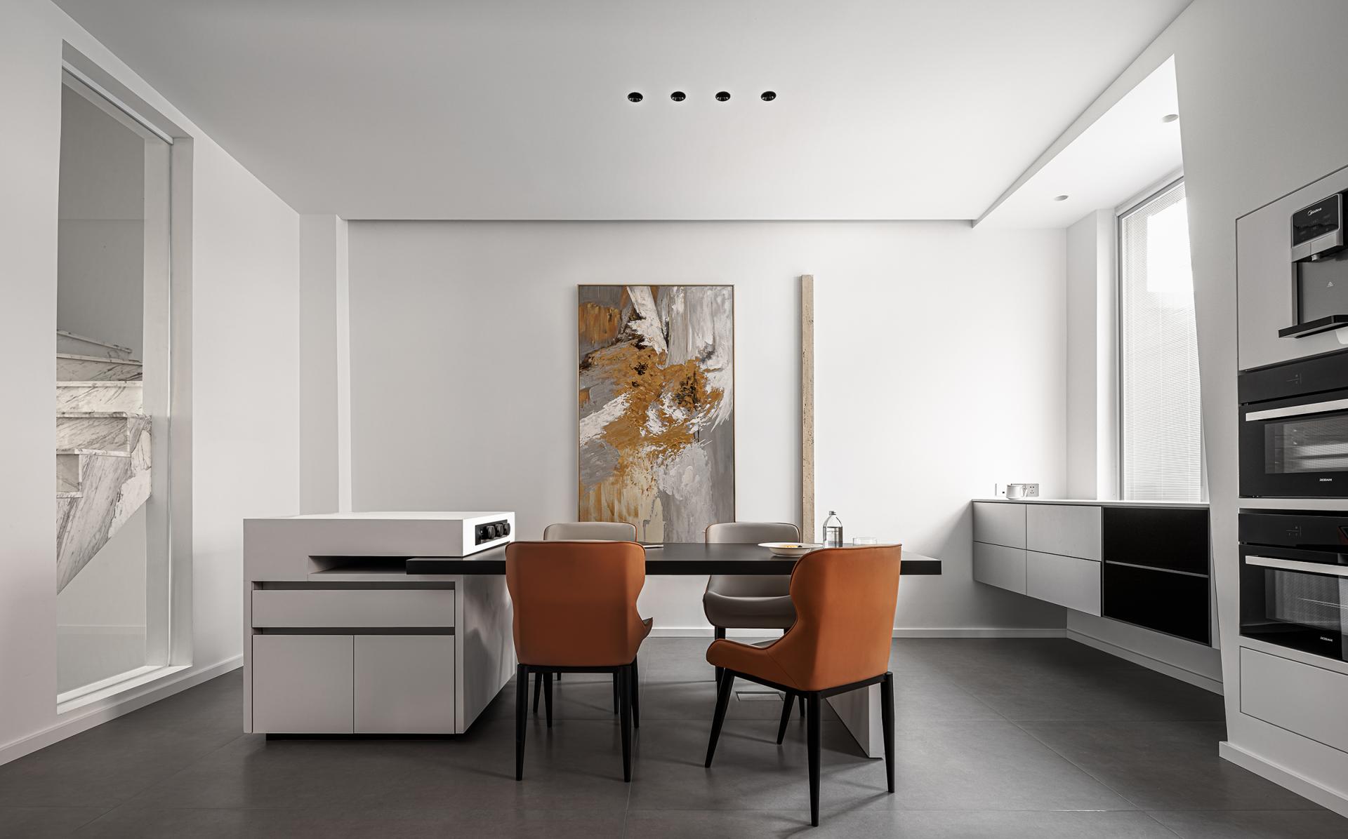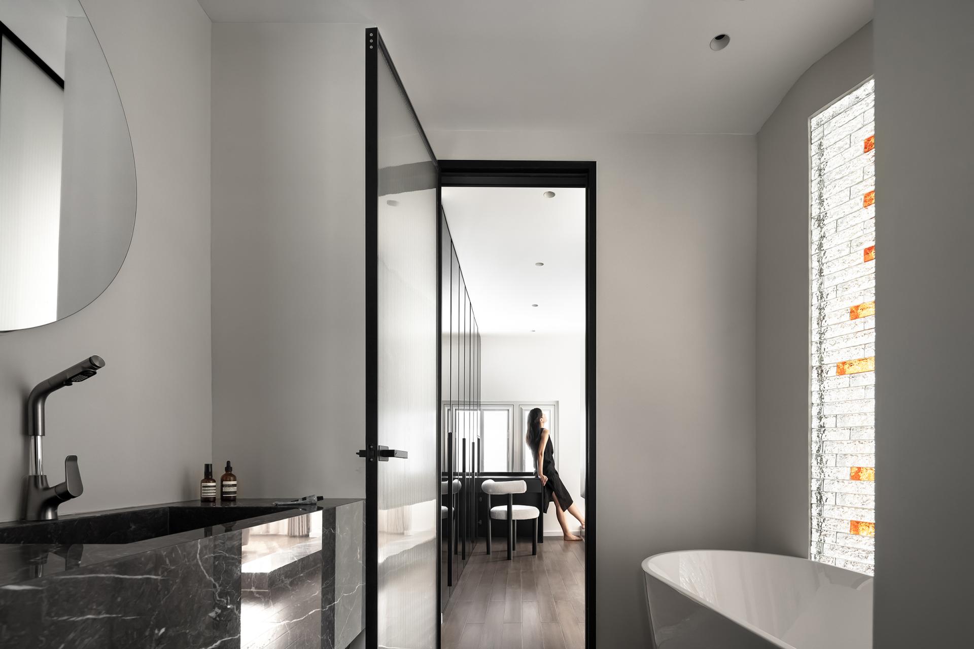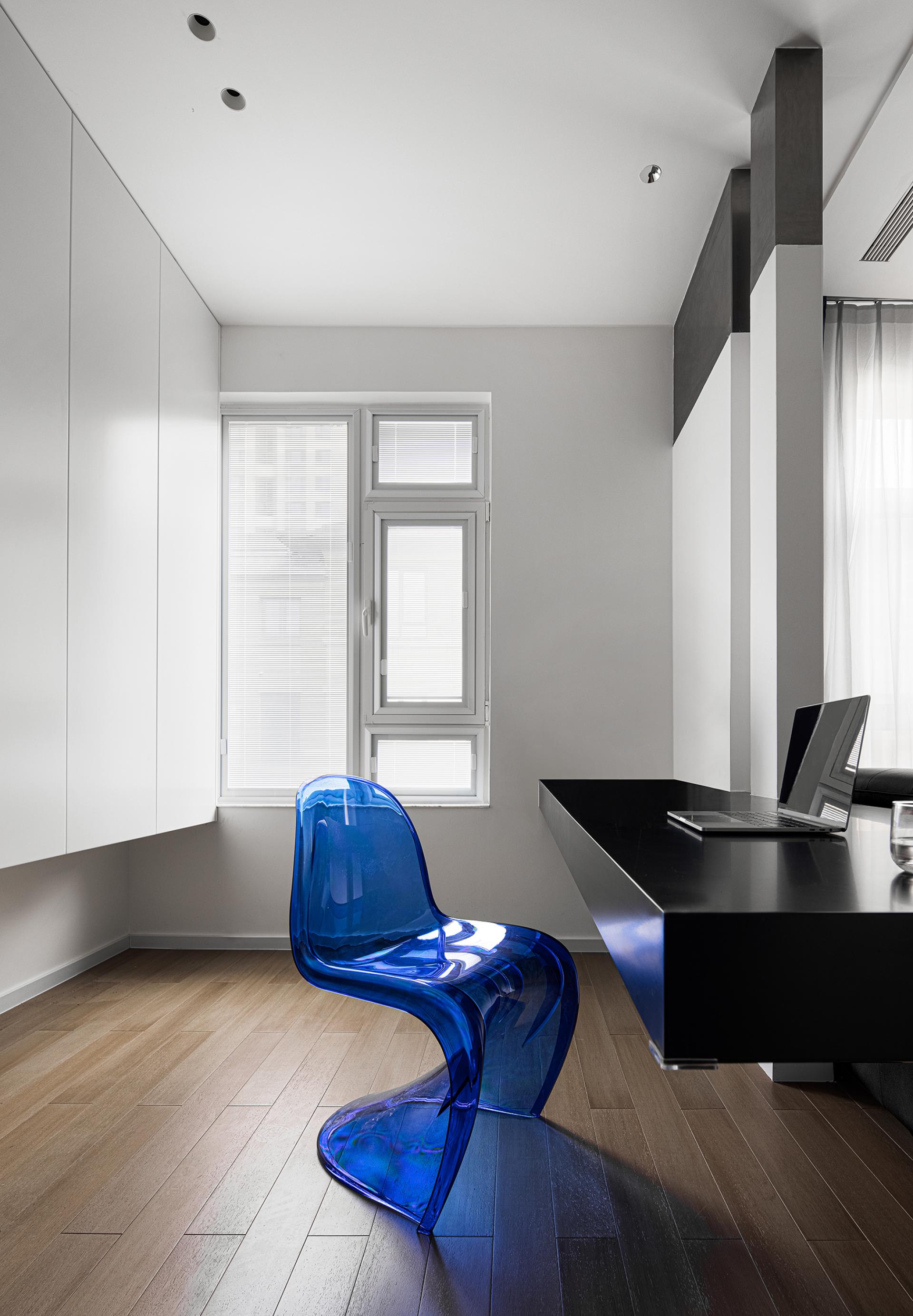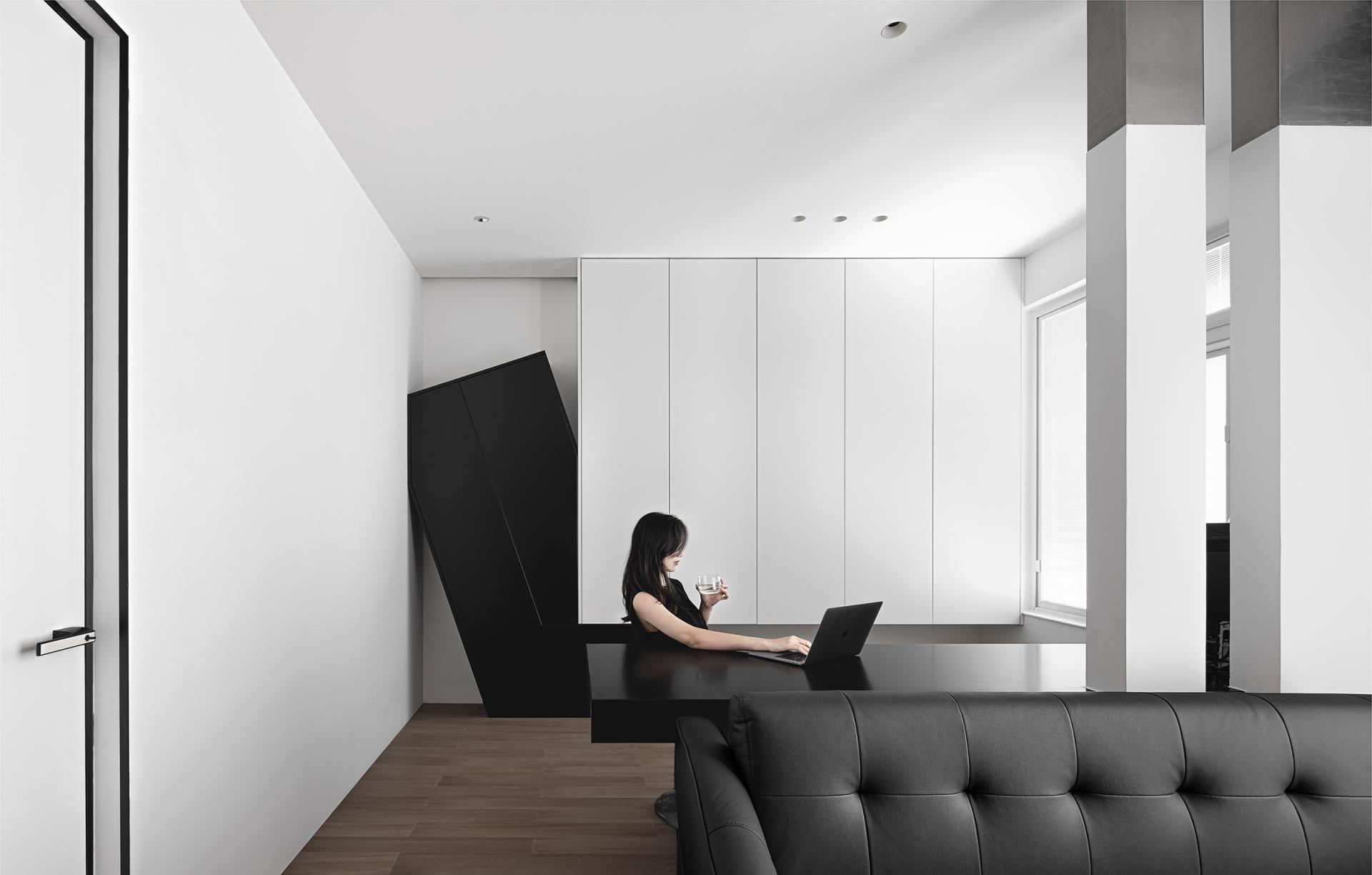 The entire design aims to evoke a sense of calmness within people, to convey and stimulate a sense of poetry. The inspiration for the design comes from an interpretation of contemporary society where each person has their own path of self-cultivation, with the deepest retreats hidden in plain sight, a practice for modern youth. How to provide the best residence for those on their spiritual path, to inspire their creativity and potential, is the consideration for the entire space. Throughout the space, the use of suspended and inclined design techniques in cabinets, walls, and ceilings serve as highlights to break the convention and express the idea of breaking spatial norms.As for the choice of materials, marble, mirrored surfaces, and stainless steel were selected and combined to best retain the original texture of the materials. During the design process, to achieve the overall final effect, we communicated directly with the workers to reach the desired result. Facing the workers' misunderstanding, we used the expression of drawings and patient explanations to help them better understand the entire design. The biggest challenge encountered was a 2.5-meter long floating desk that was only supported by a 60-centimeter steel leg frame. With the support of the client, we custom-ordered a very thick-walled steel from the factory to enhance stability. Due to the increased wall thickness, the overall steel structure of the tabletop would be very heavy, so without a crane, it required more than 20 people to carry it into the second floor, and then weld it on-site. Only through the joint efforts of everyone, the super floating desk was perfectly presented. In the entire space, we adopted a black, white, and gray color scheme, and through the desaturation of the space, we hope that residents can achieve inner peace.